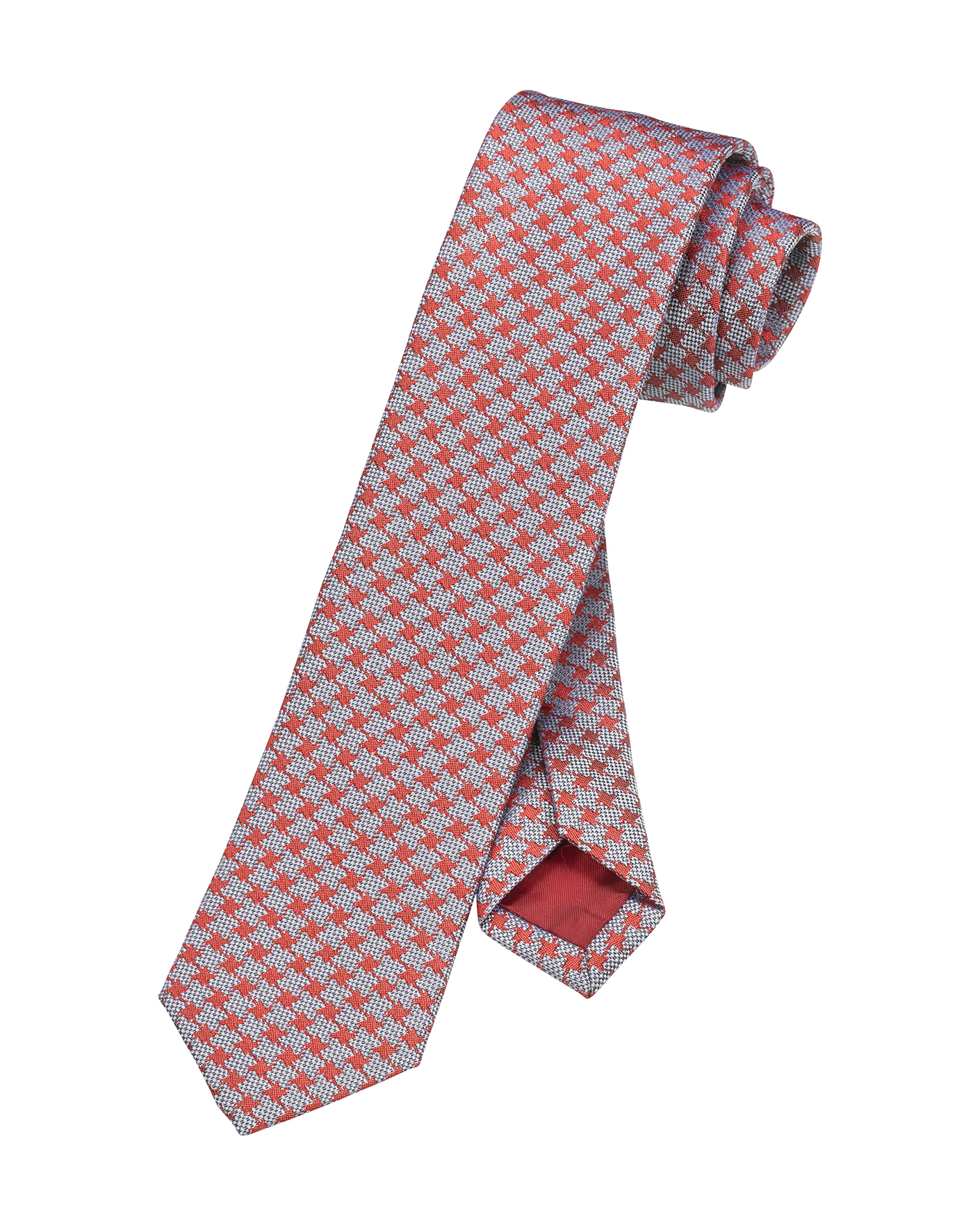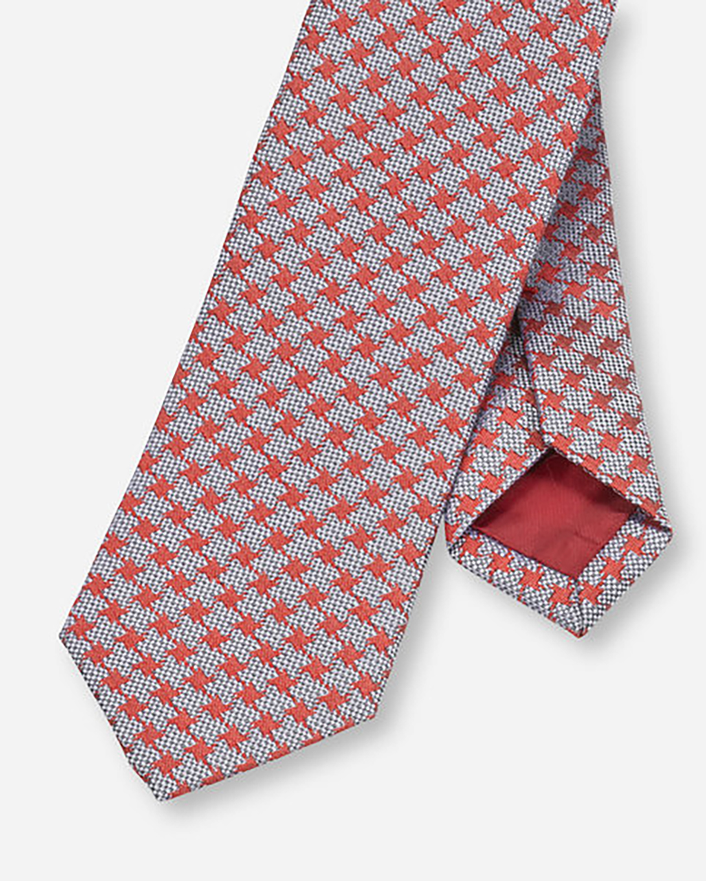 Галстук Olymp серо-красного цвета в мелкую текстуру с геометрическим принтом. Длинный галстук ультрасовременного узкого дизайна предназначен для строго облегающих деловых рубашек OLYMP