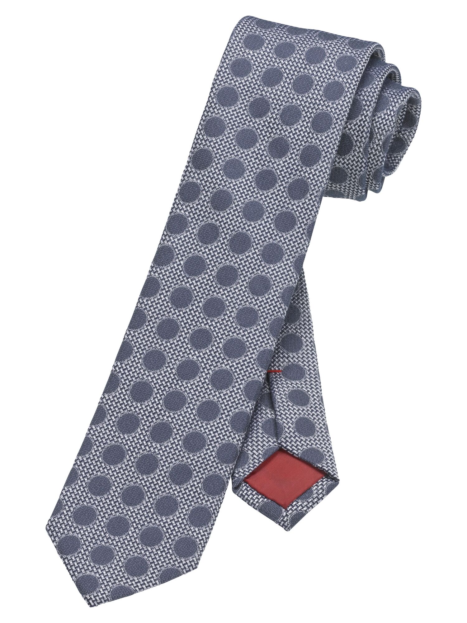 Тонкий галстук OLYMP серо-синего оттенка с минималистичным рисунком и принтом горох. Изысканный галстук изготовлен вручную и состоит из тонкой смеси хлопка и шелка.