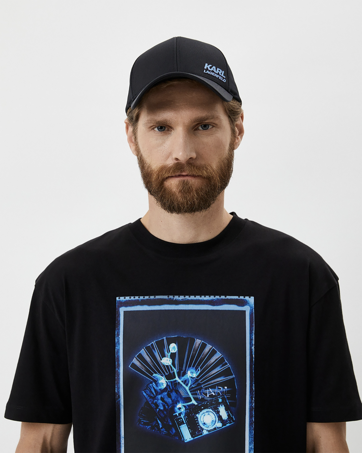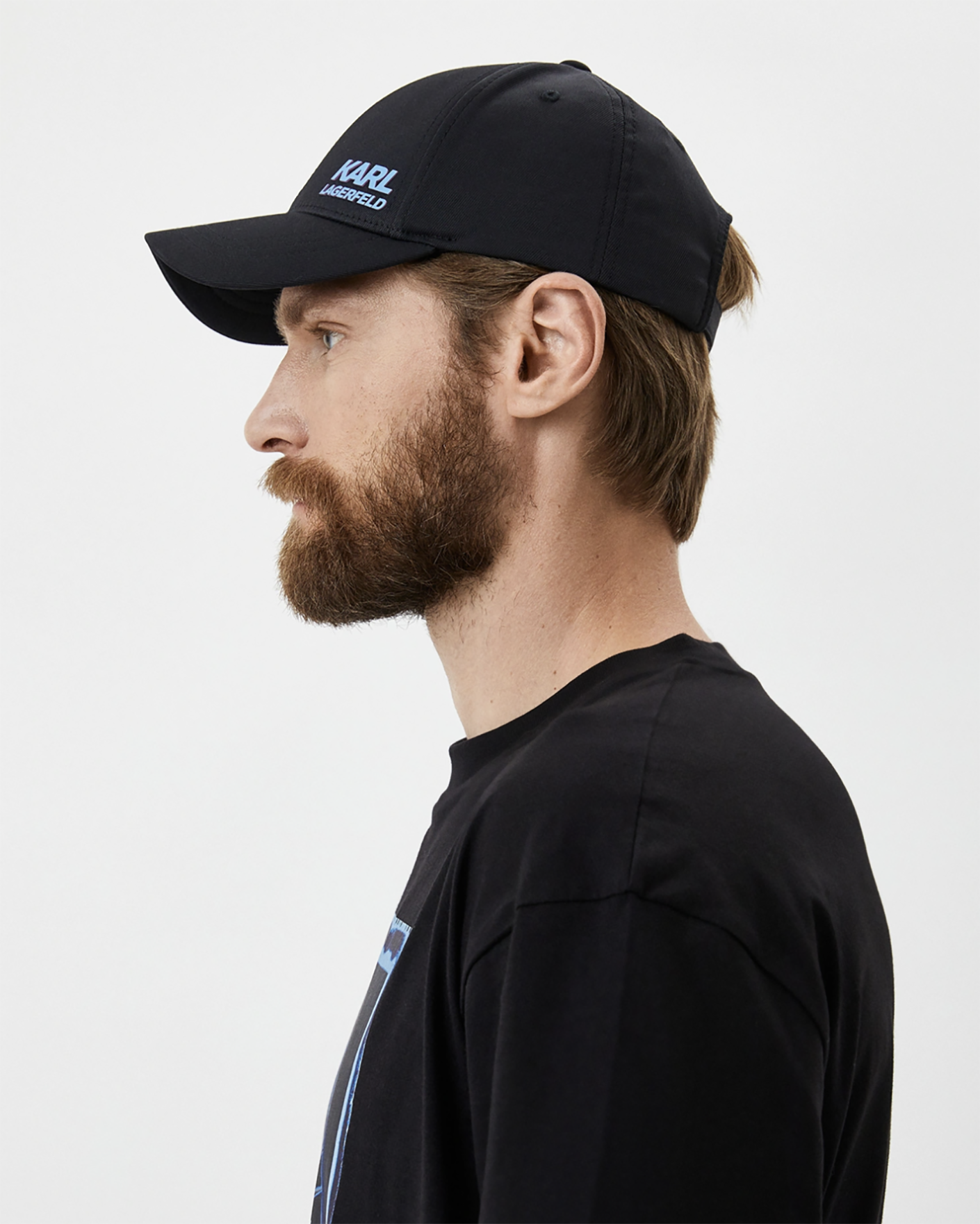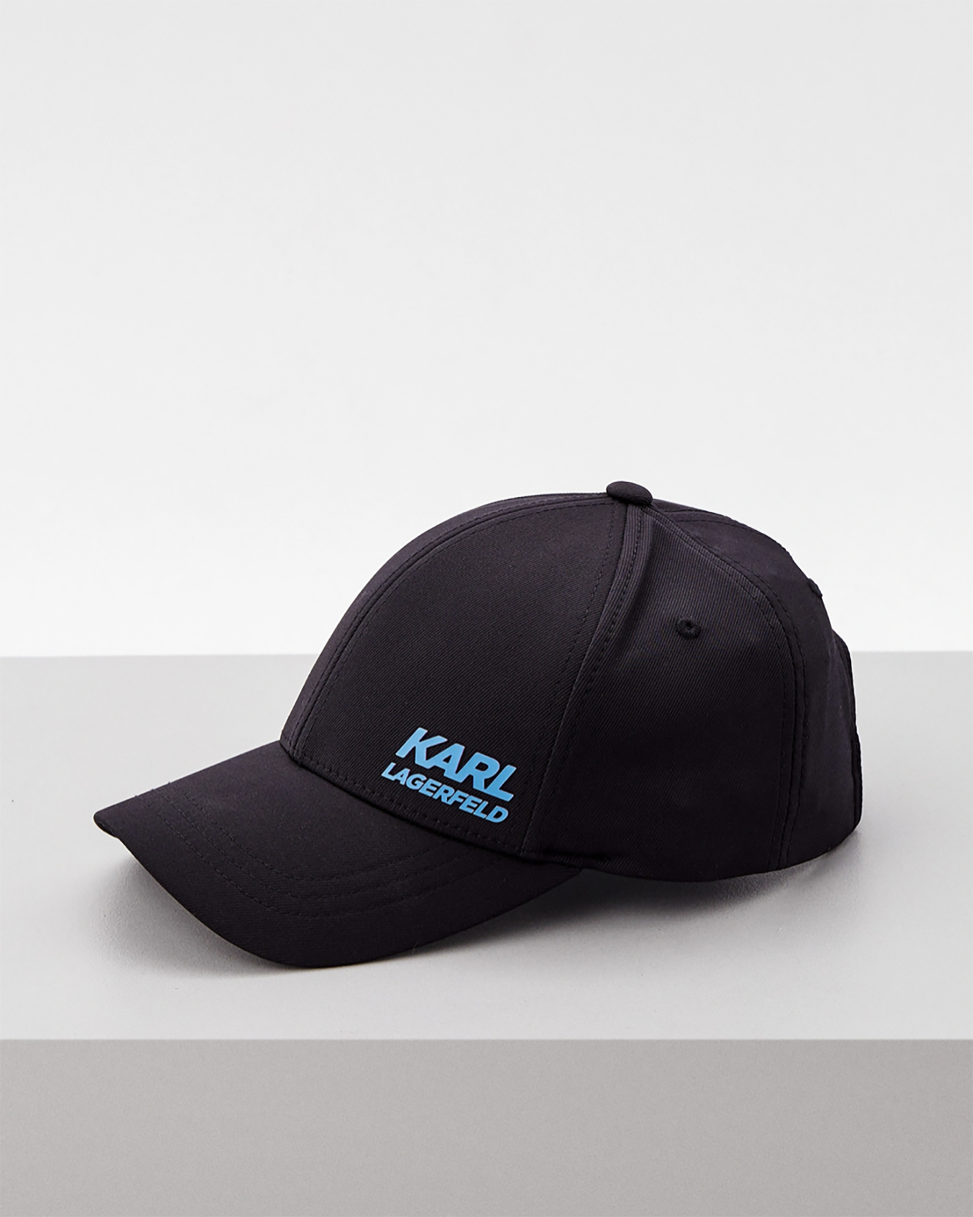 Бейсболка Karl Lagerfeld черного цвета с узнаваемым логотипом бренда в голубом цвете. Бейсболка станет незаменимым аксессуаром для защиты от солнца.