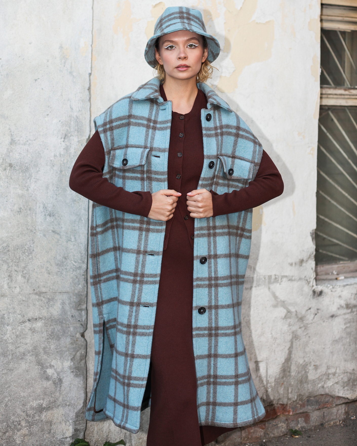 Шерстяная панама Marc O'Polo бежево-голубого цвета в крупную клетку. Прекрасный выбор для межсезонья и европейской зимы.