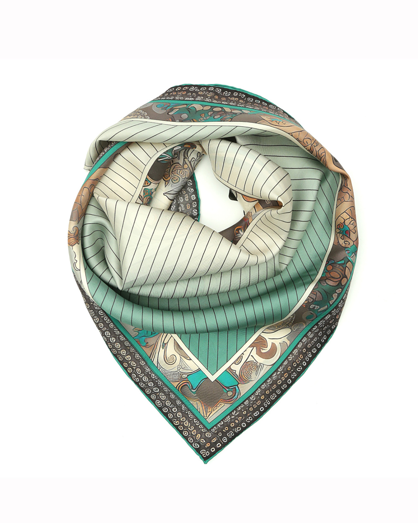 Платок Fabretti зеленого цвета в узкую полосу и абстрактный рисунок. Модель из 100% шелка квадратной формы. Платок - стильный аксессуар для завершения образа.