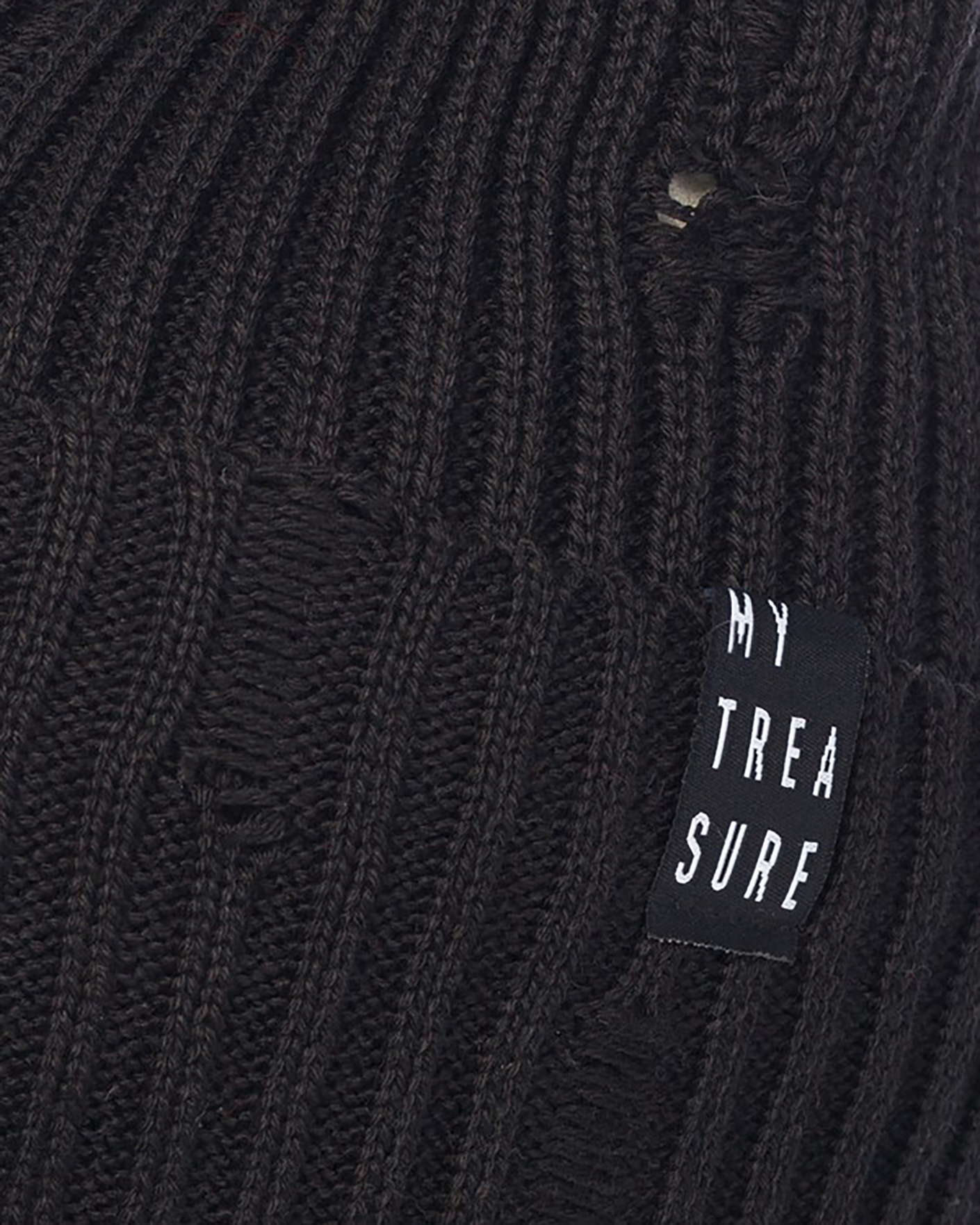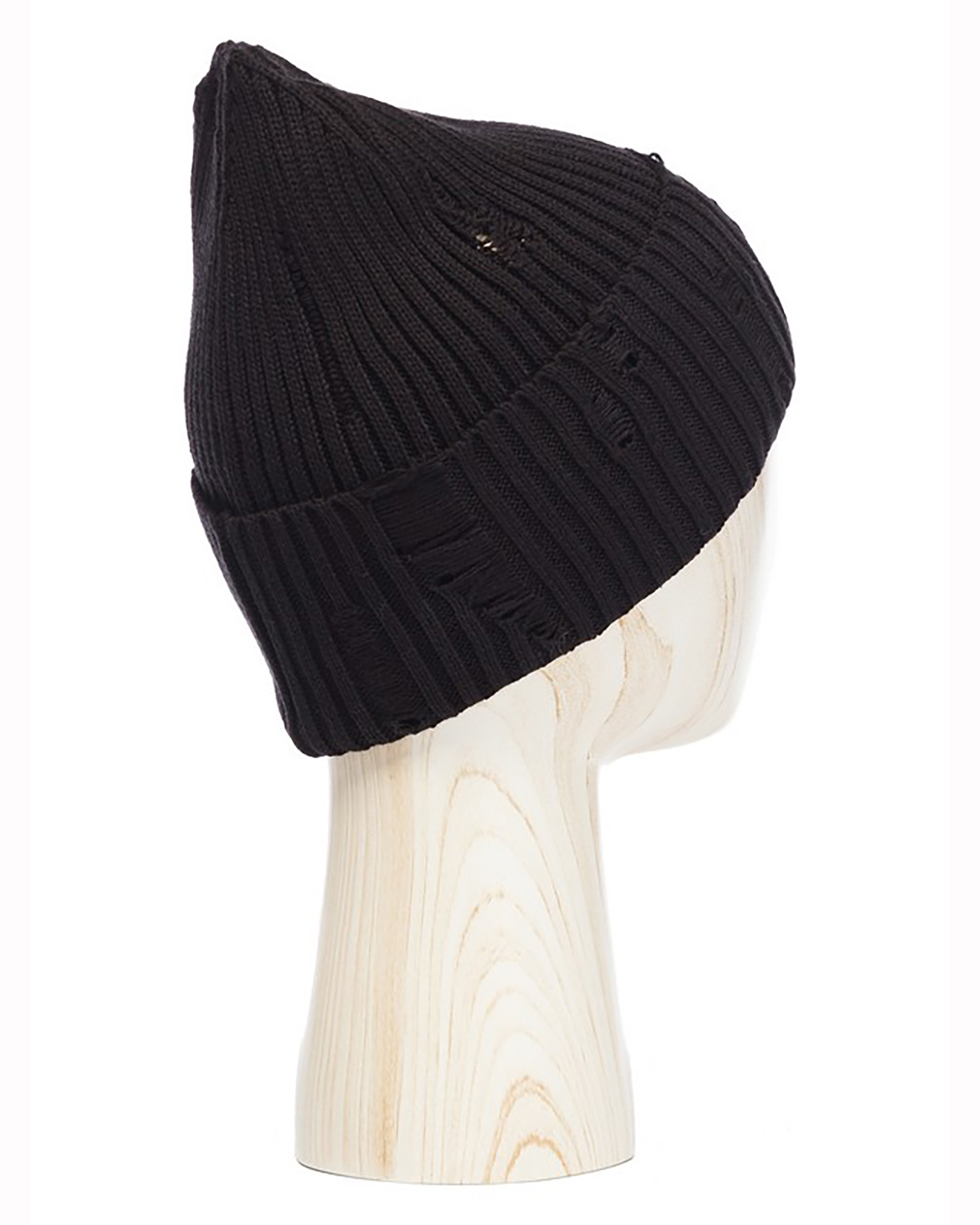 Шапка Labbra черного цвета в вертикальную вязку с дырками. Модель с увеличенным верхом и широким отворотом, украшенным нашивкой из текстиля. Шапка станет идеальным дополнением как образа в стиле casual, так и ярким аксессуаром для классического.