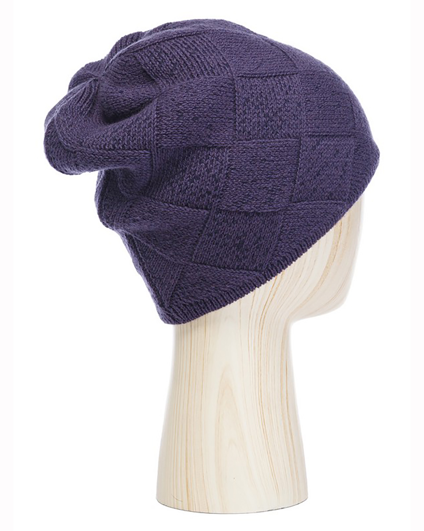 Шапка Labbra фиолетового цвета в крупную ромбическую вывязку. Удлиненная модель на подкладе. Шапка станет отличным дополнением как образа в стиле casual, так и ярким аксессуаром для классического.