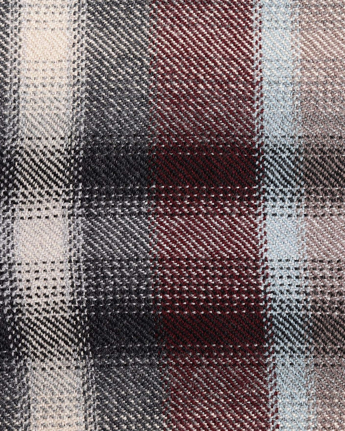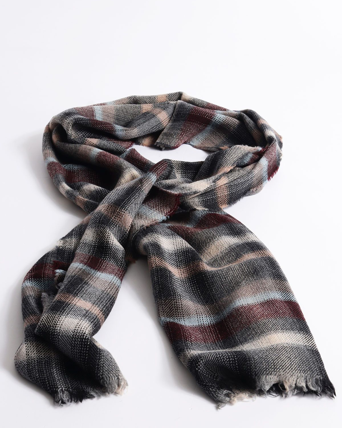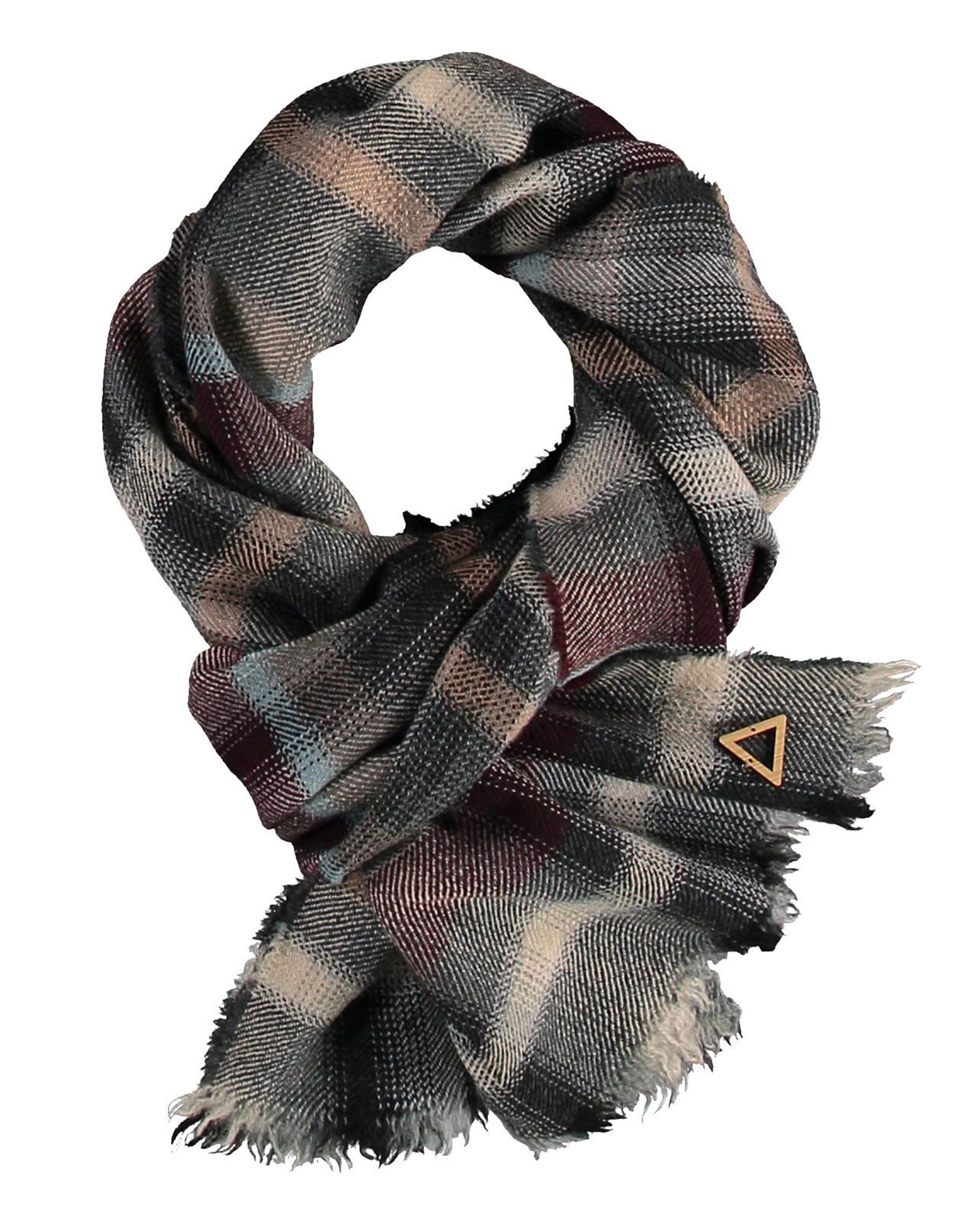 Шарф Fraas бежево-бордового цвета в диагональный строчный рисунок и крупную клетку. Модель из 100% шерсти прямоугольной формы со специальной необработанным  краем и небольшой бахромой.