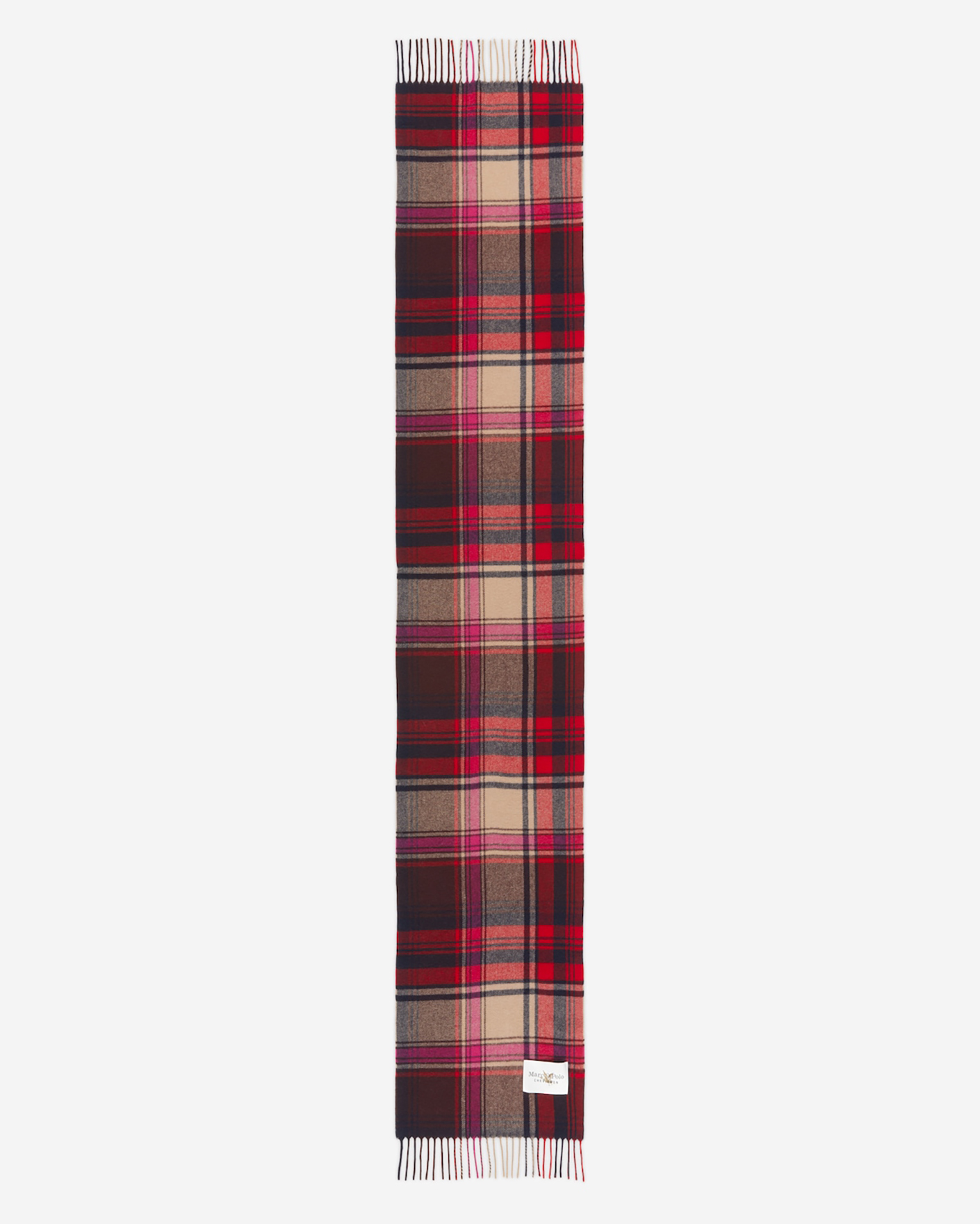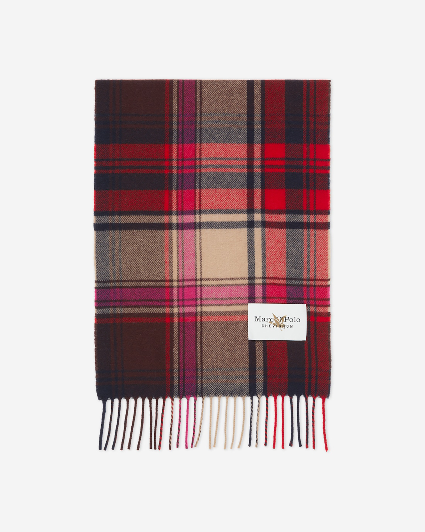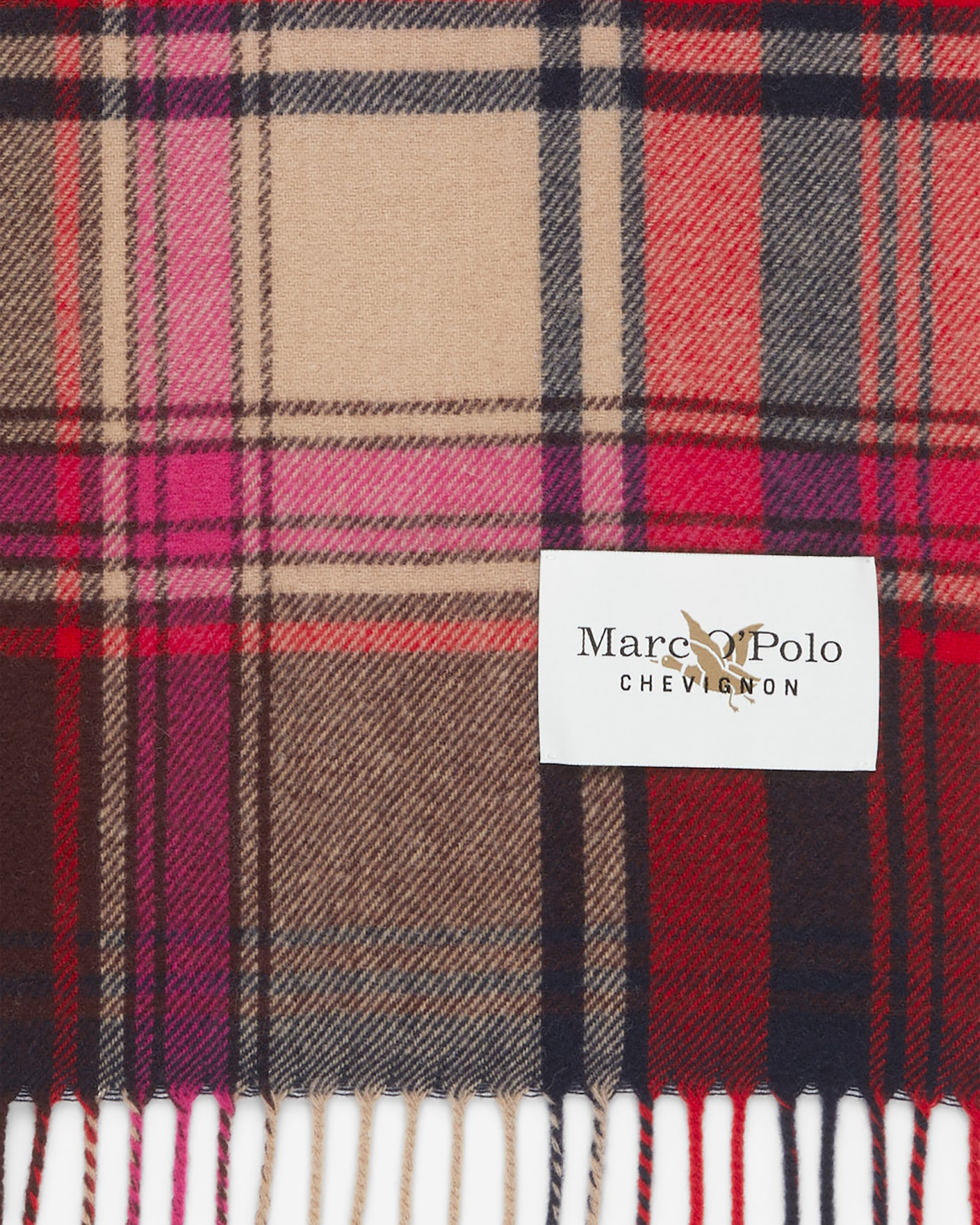 Стильный шарф Marc O'Polo бежево-красного цвета в крупную клетку. Шерстяная модель прямоугольной формы с декором в виде кистей по краям, а также небольшая нашивка с логотипом. Шарф - яркий аксессуар на каждый день.