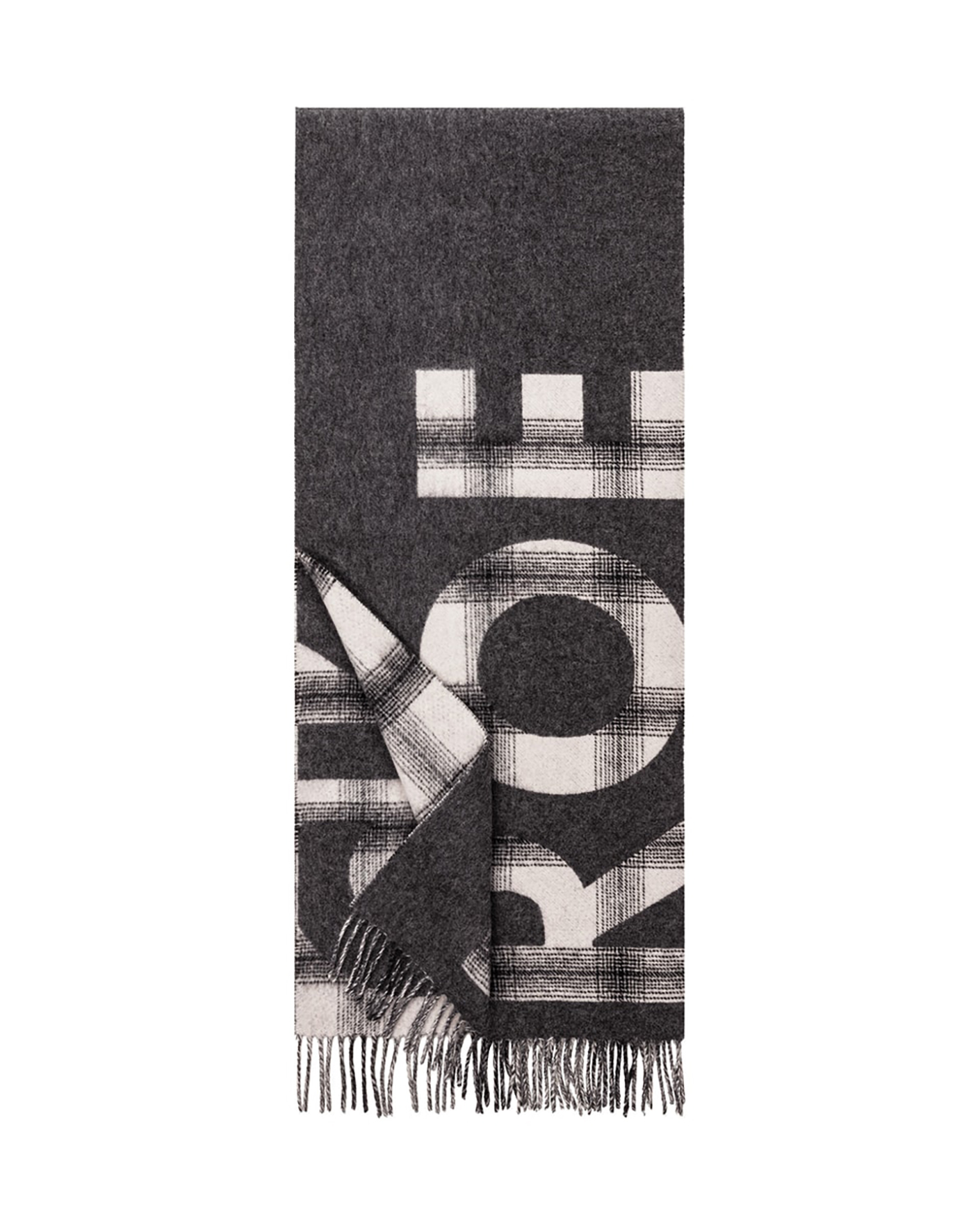 Теплый шарф Roeckl серого цвета с клетчатым узором в виде логотипа и бахромой по низу с открытыми краями. Шерстяной шарф прекрасно согревает зимой.