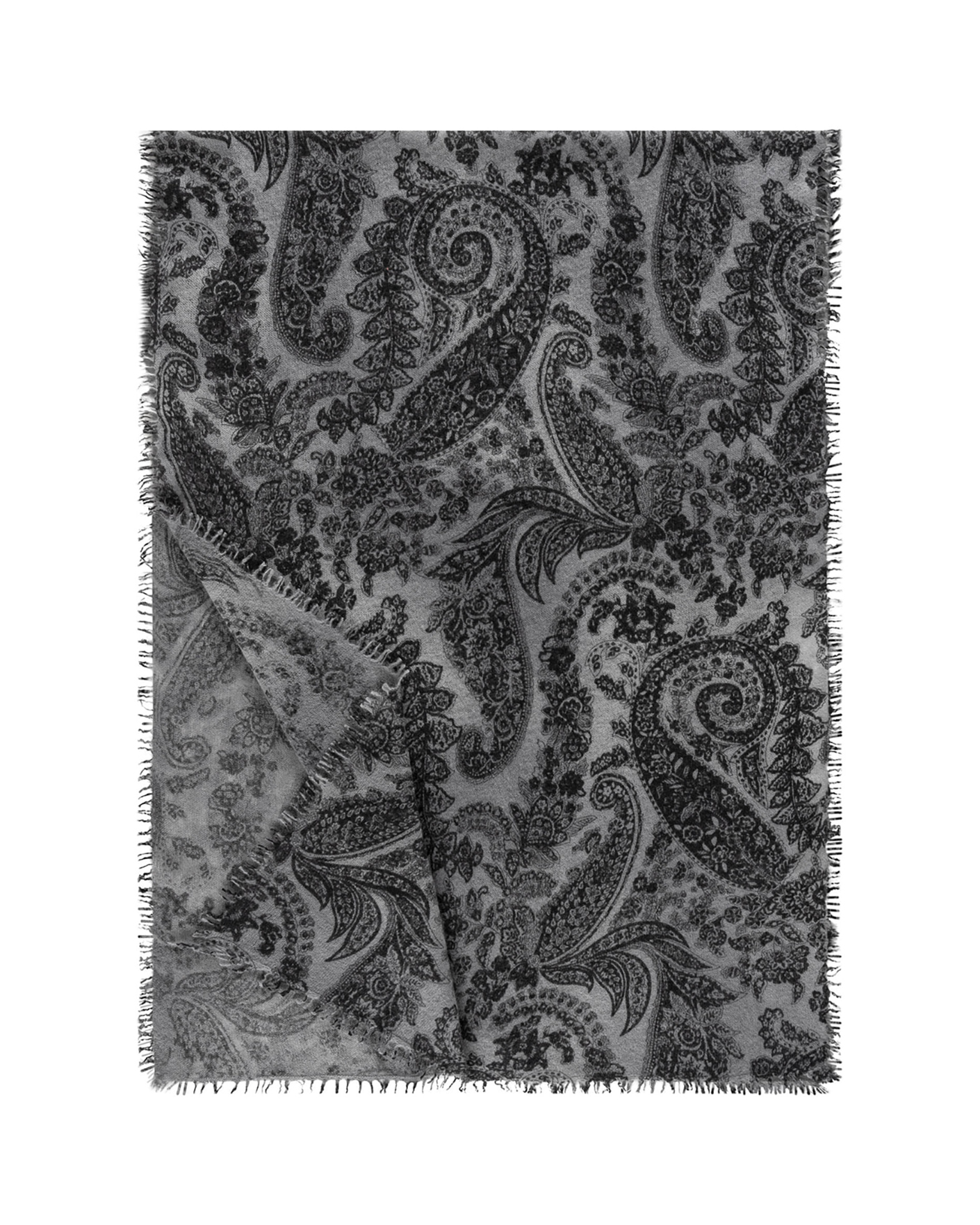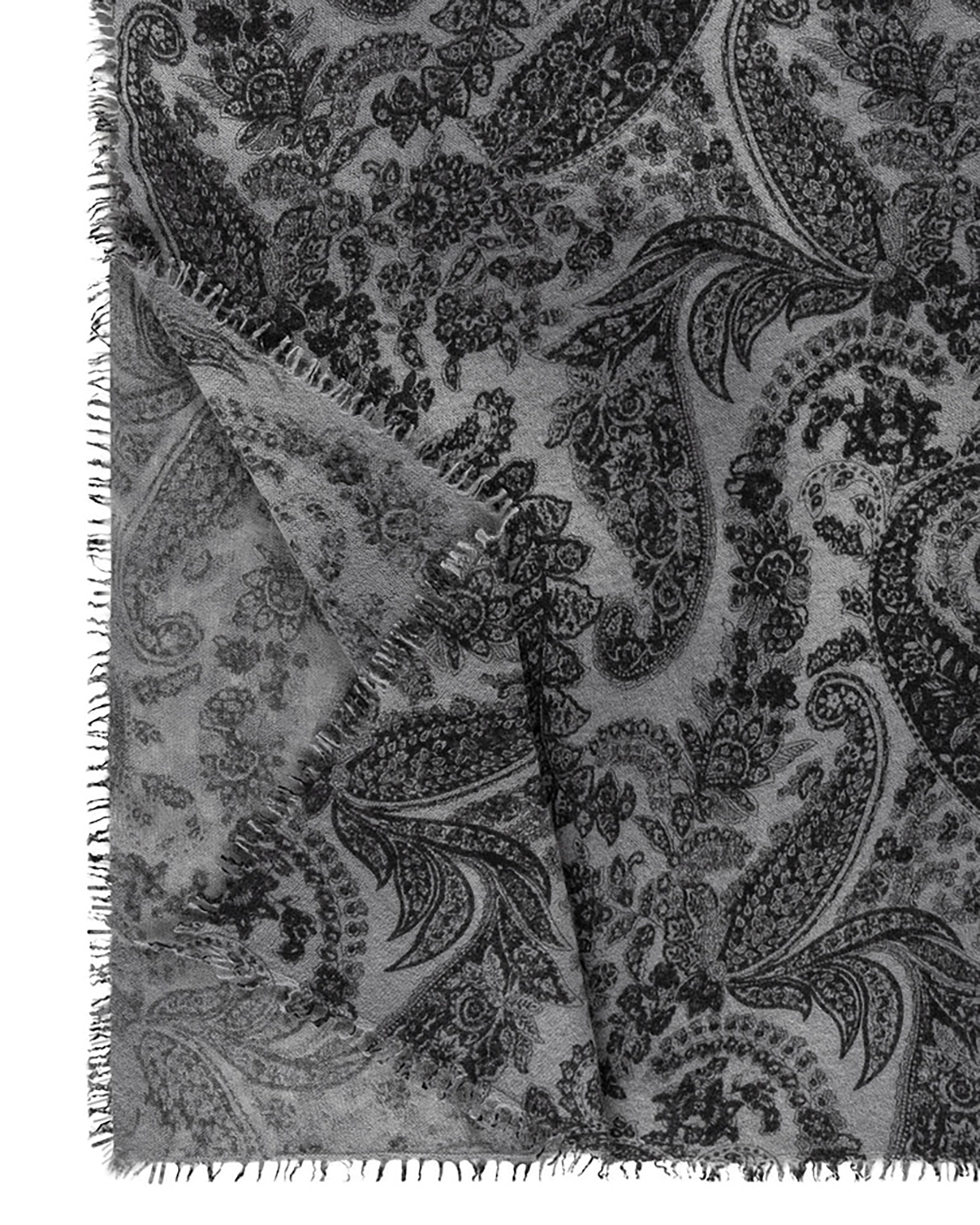Стильный шарф Roeckl серого цвета в восточный узор. Прямоугольная модель выполнена из 100% кашемира, края с небольшой бахромой. Шарф станет отличным аксессуаром на каждый день.