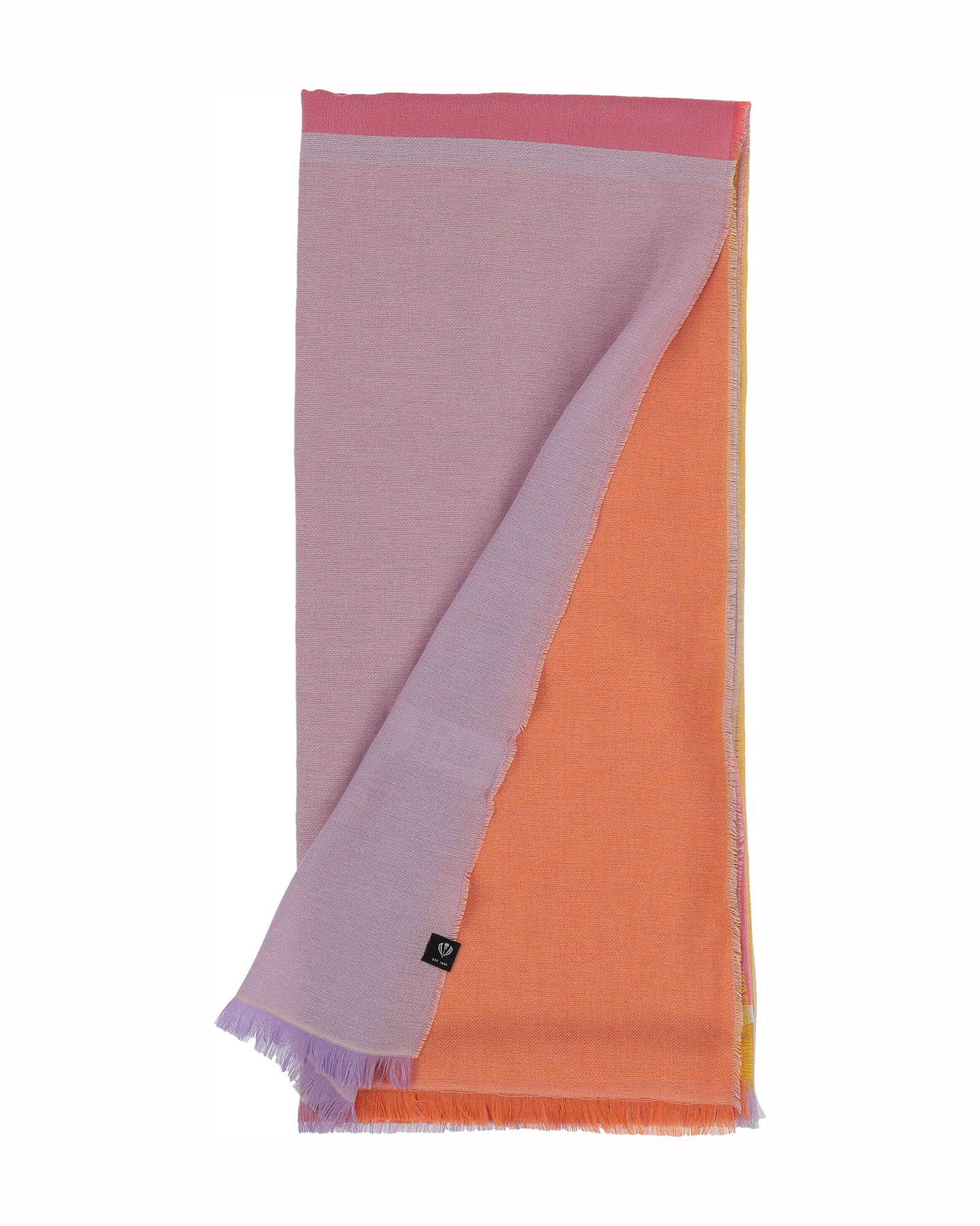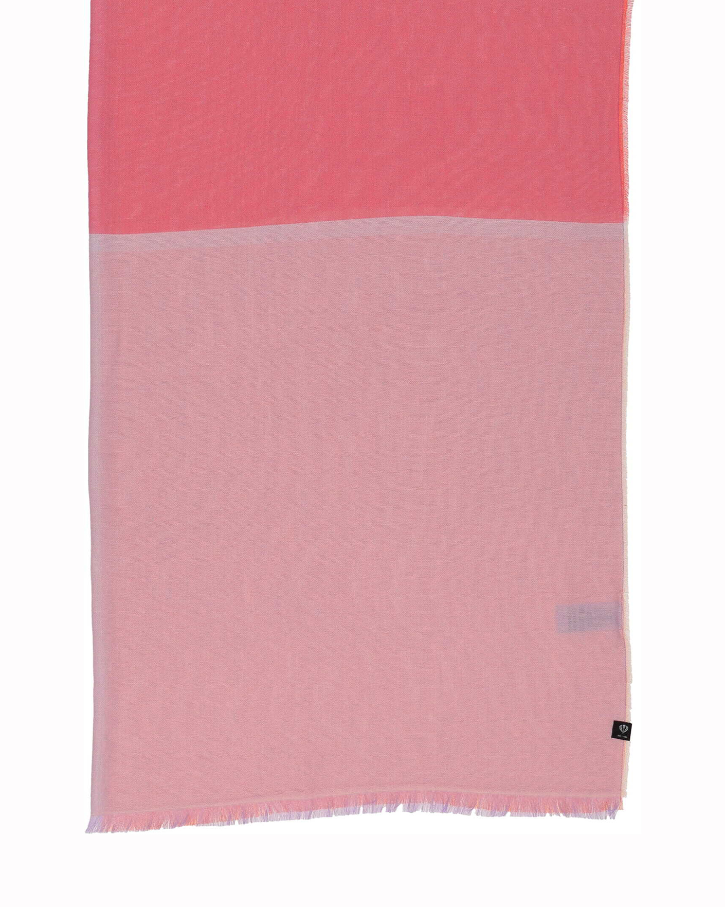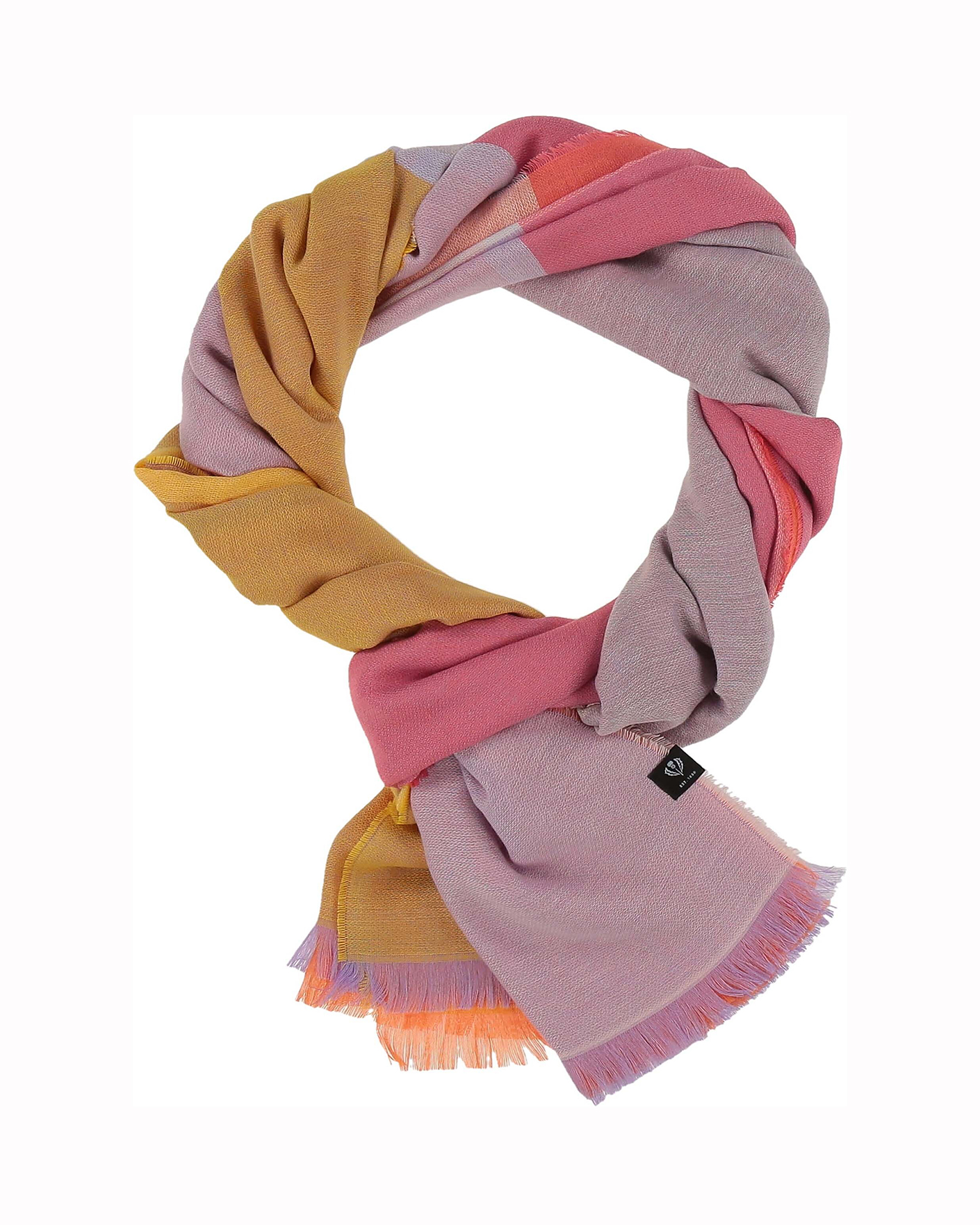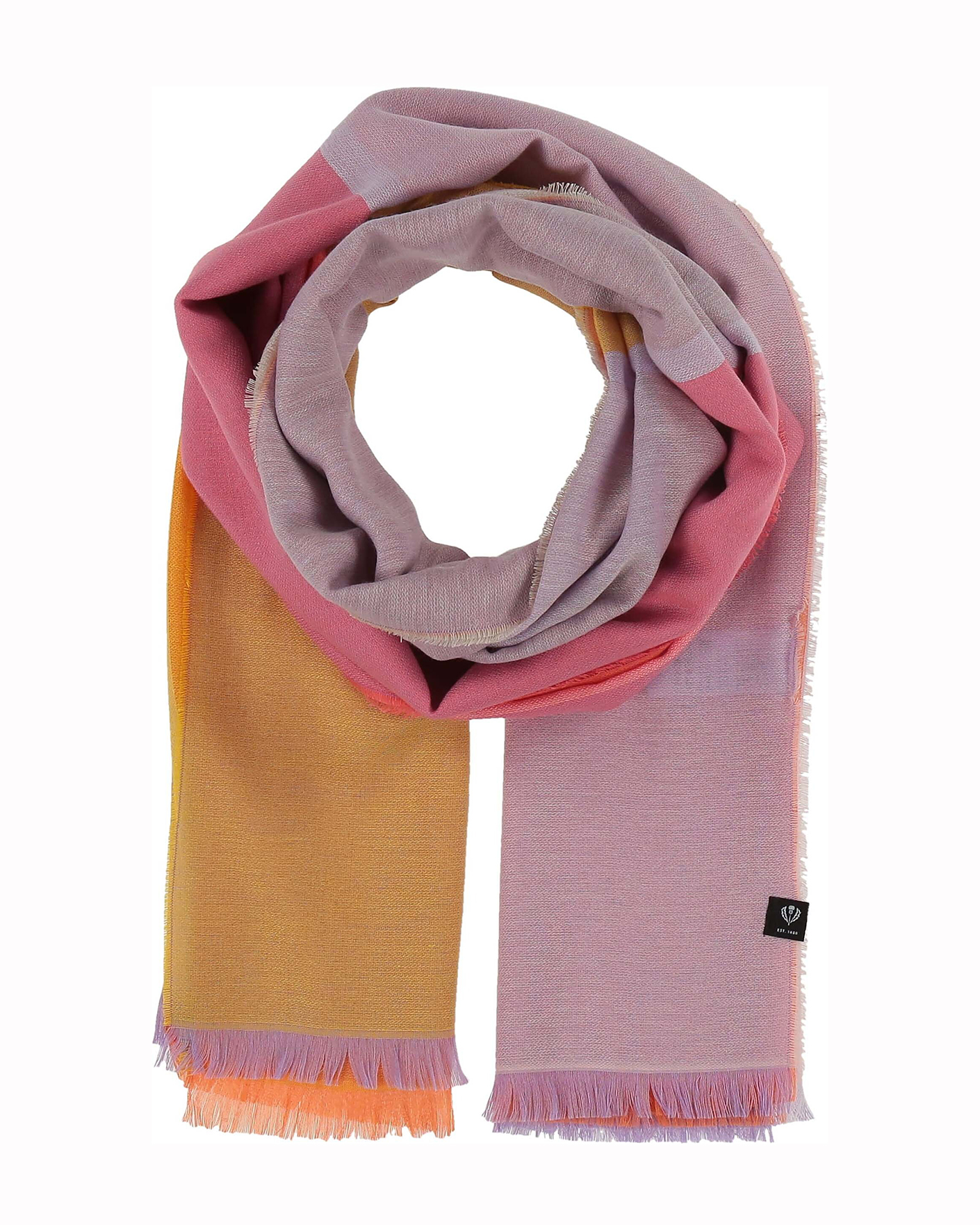 Шарф Fraas розового цвета в строчный рисунок и крупными цветными блоками. Модель размером 90*190 с бахромой по краю. Легкий шарф можно легко сочетать с любым гардеробом.