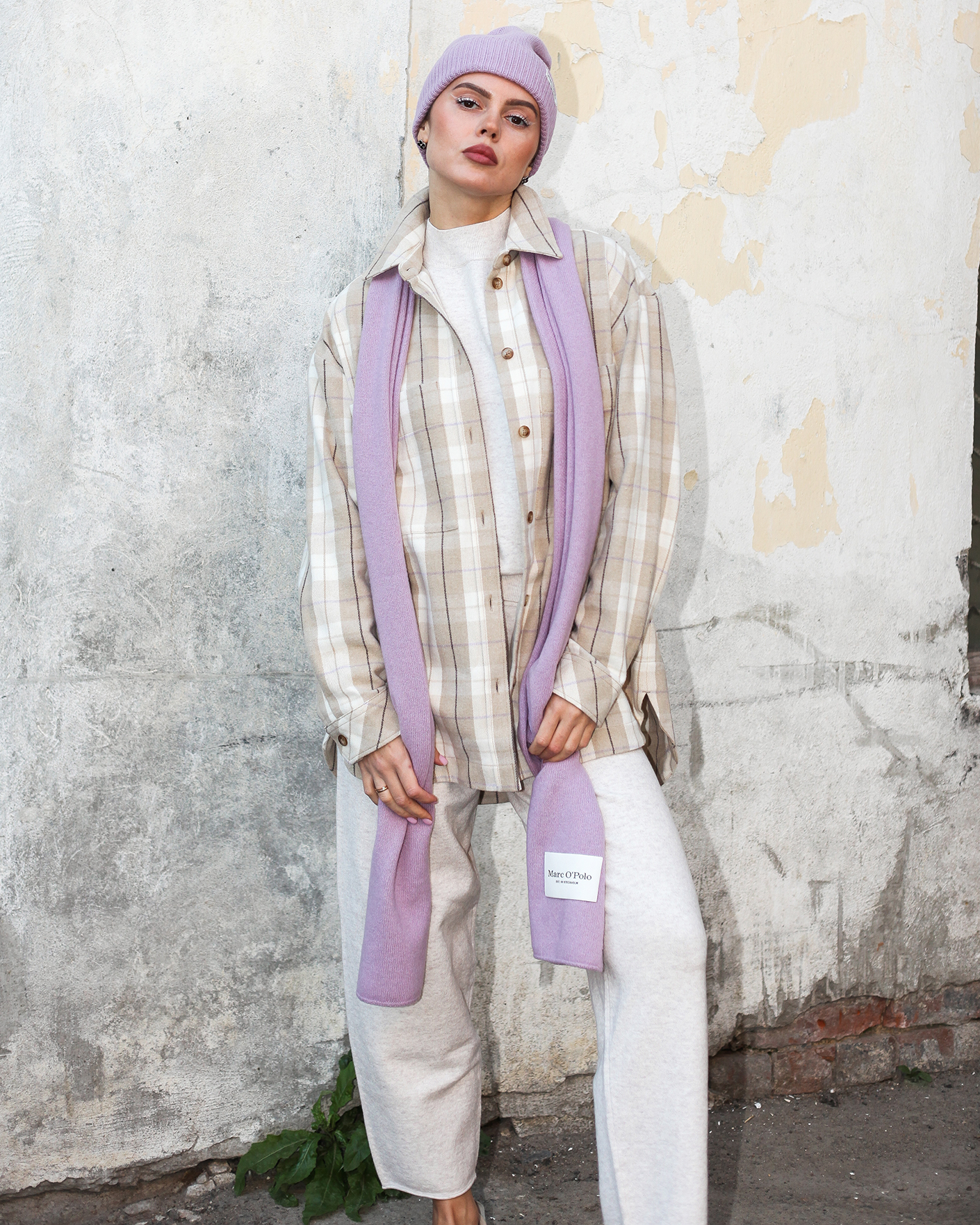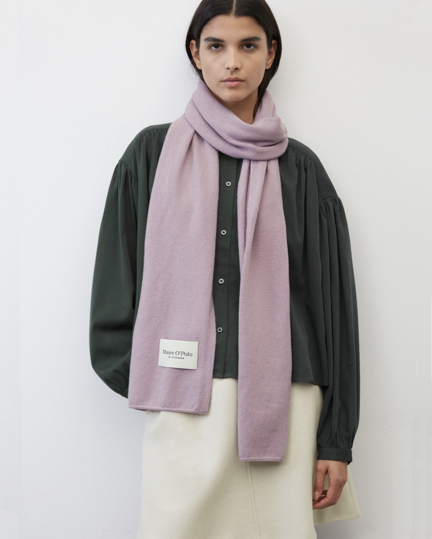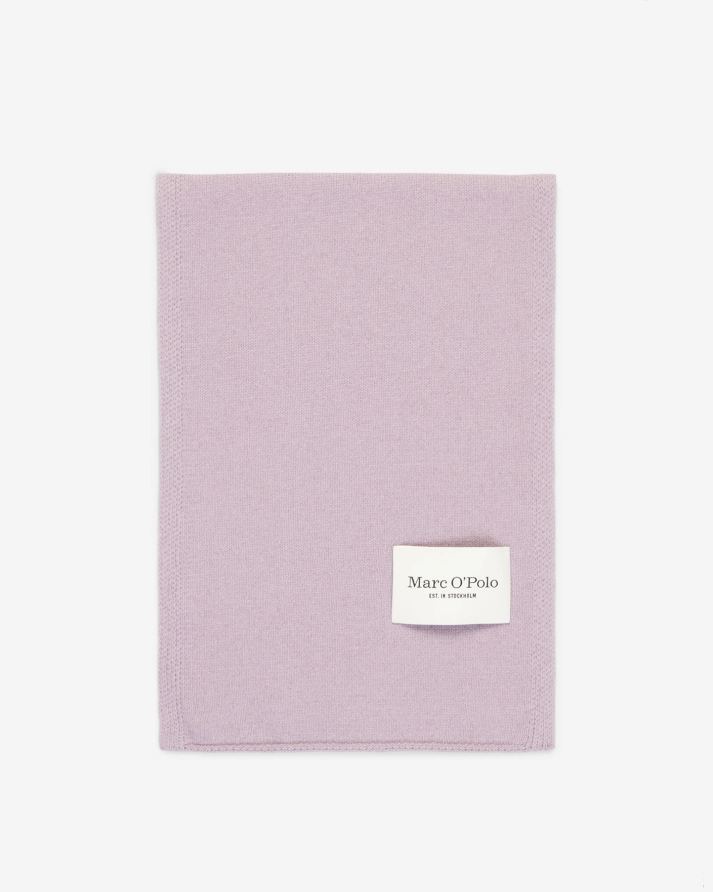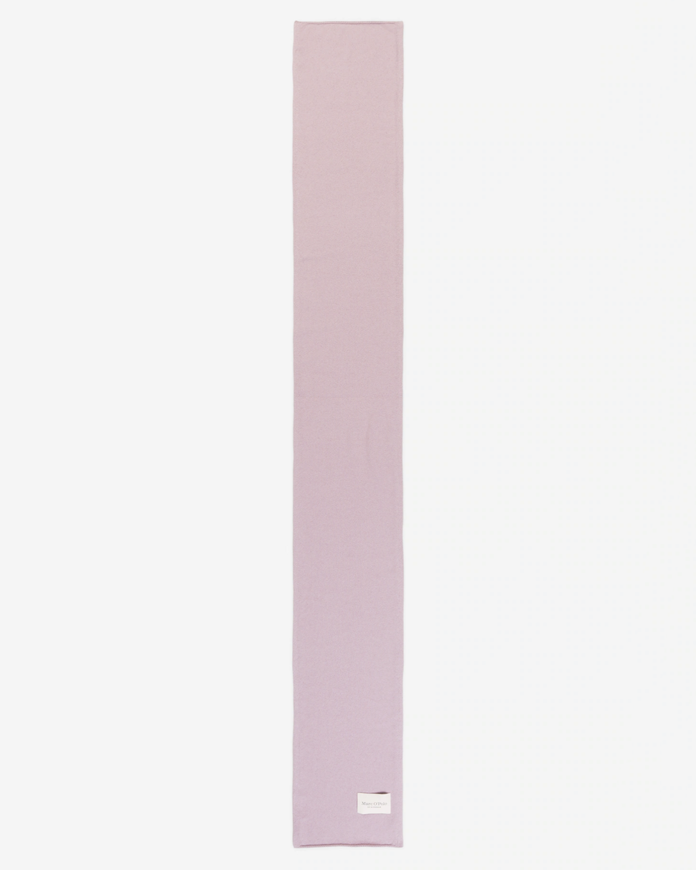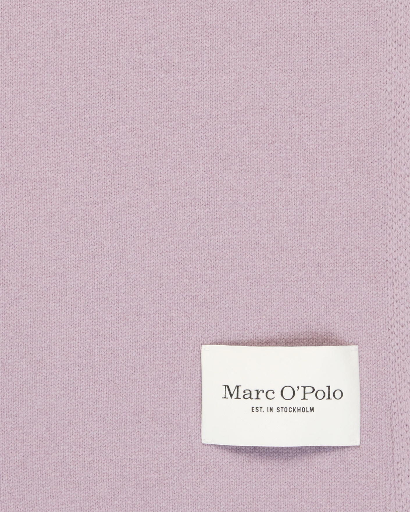 Шарф Marc O'Polo светло-сиреневого цвета в крапинку. Модель в строчный рисунок, прямоугольной вытянутой формы и нашивкой в виде логотипа бренда. Теплый шарф - незаменимый аксессуар на холода.