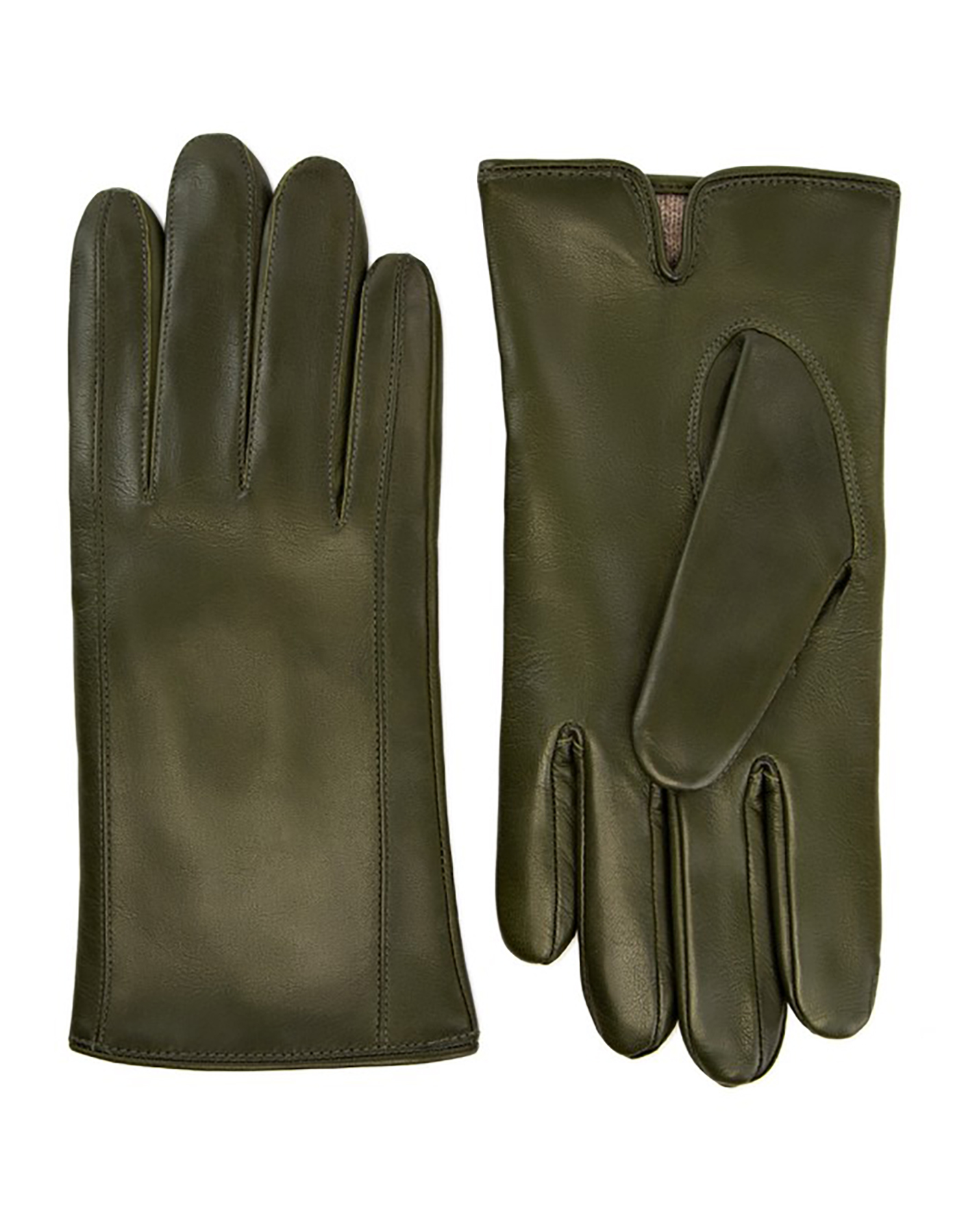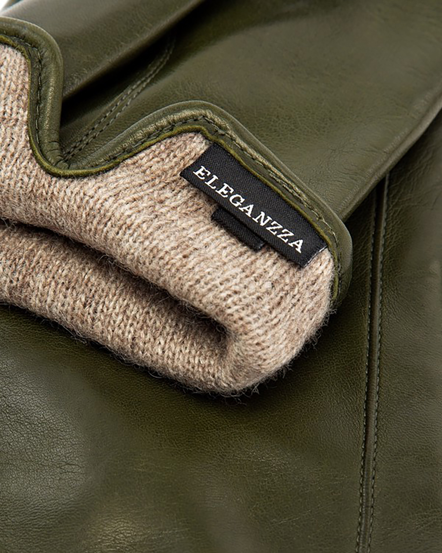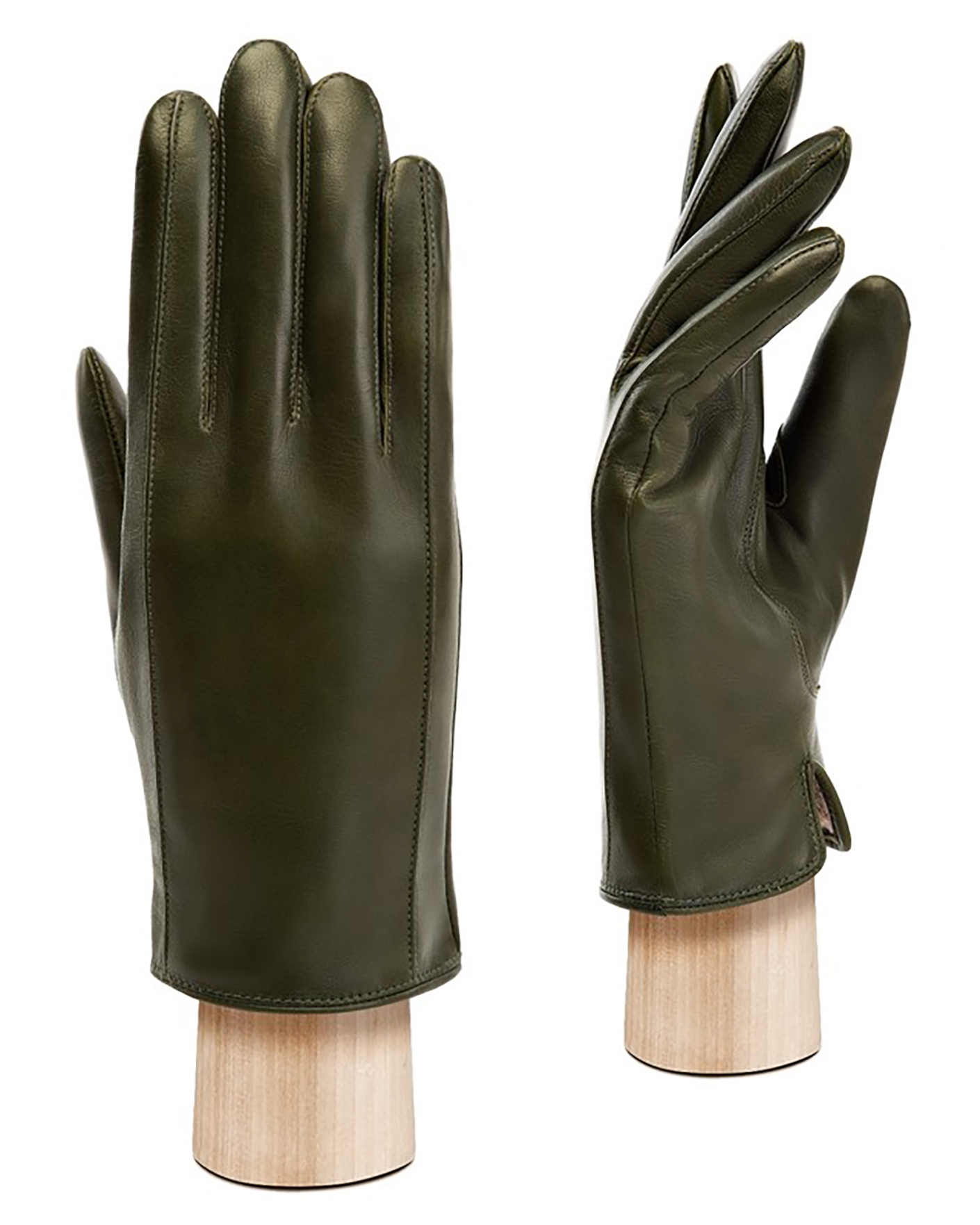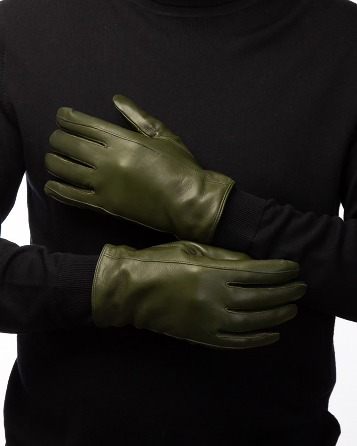 Мужские перчатки Eleganzza темно-оливкового цвета выполнены из 100% кожи ягненка. Модель с декоративными швами в тон, нижний край перчатки и разрез на ладонной стороне окантованы. Стильный аксессуар на каждый день.