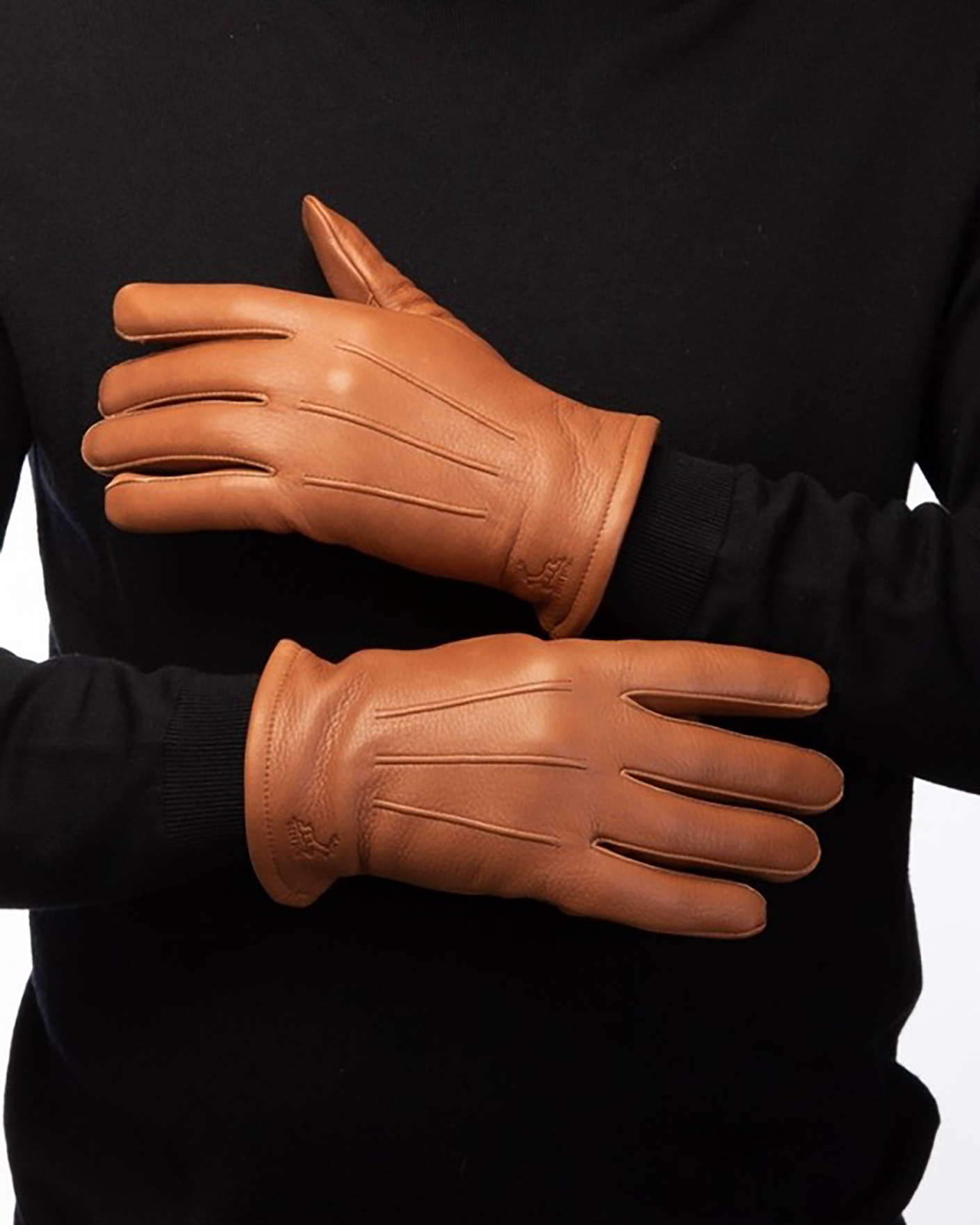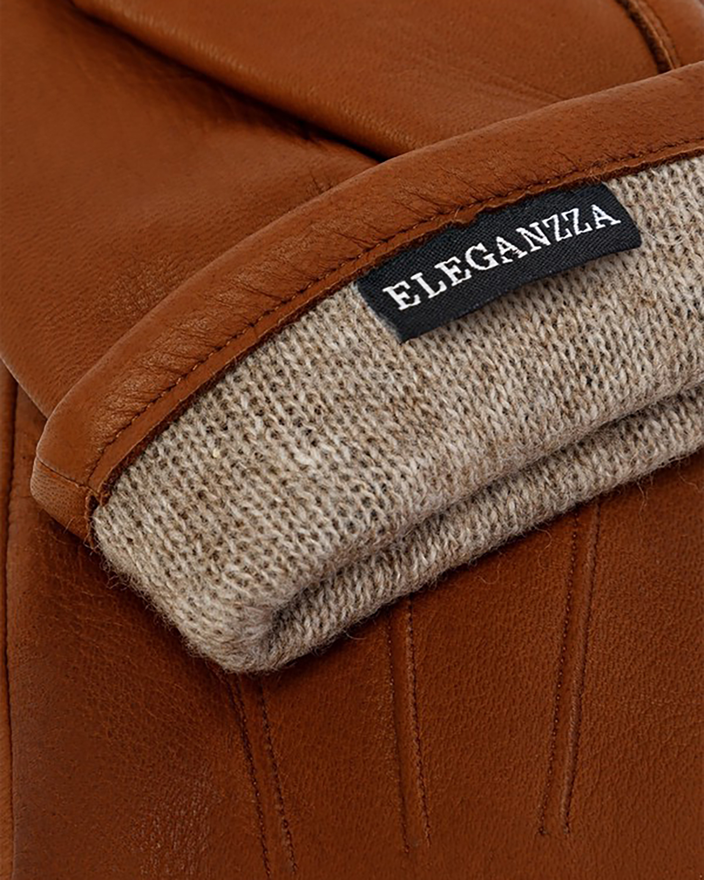 Перчатки Eleganzza коричневого цвета выполнены из 100% кои оленя. Отделка – машинная строчка “три луча”. Перчатки особенно устойчивы к атмосферным воздействиям и защищает от холода.