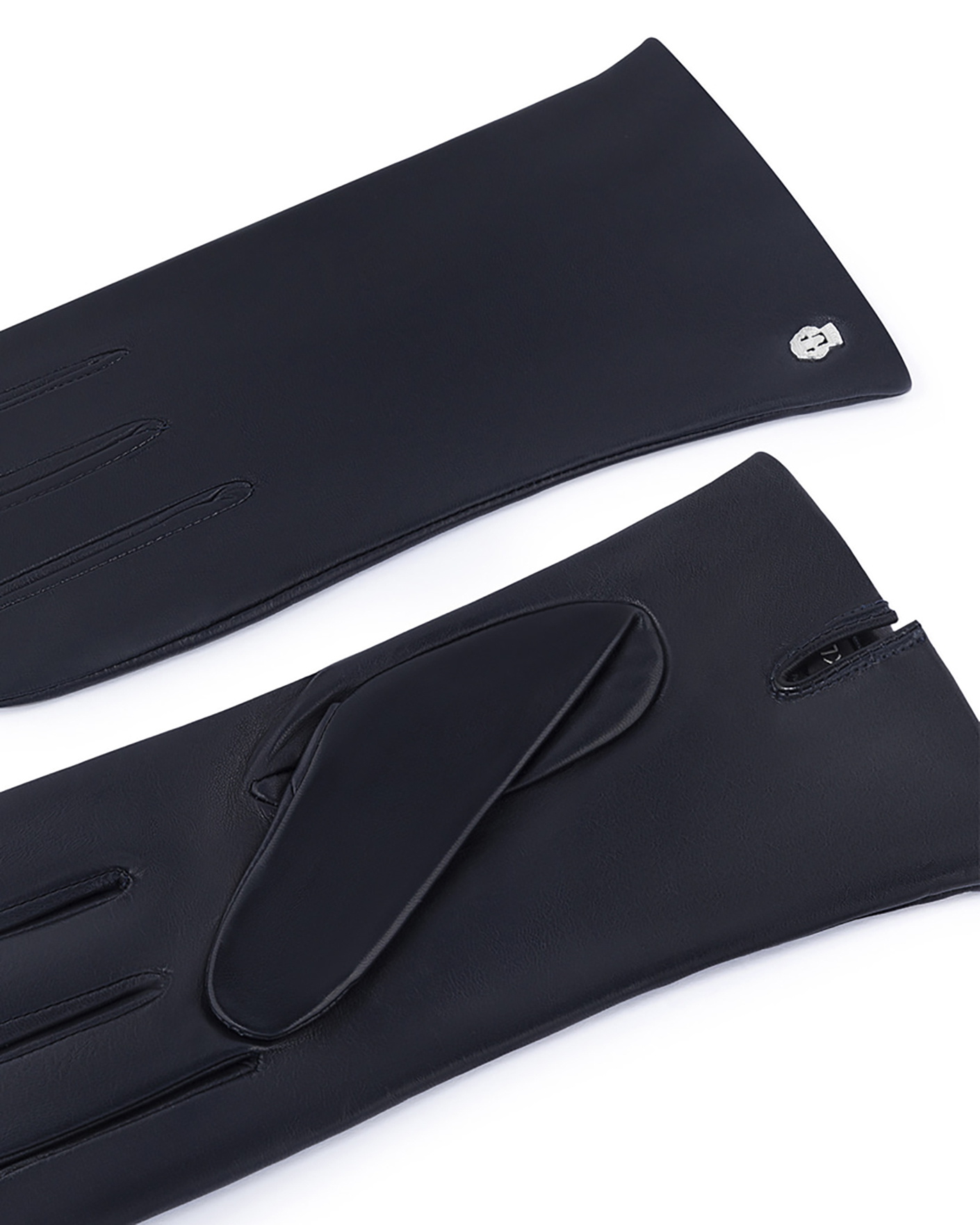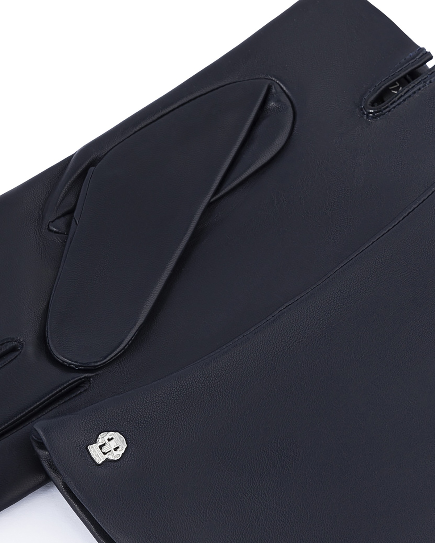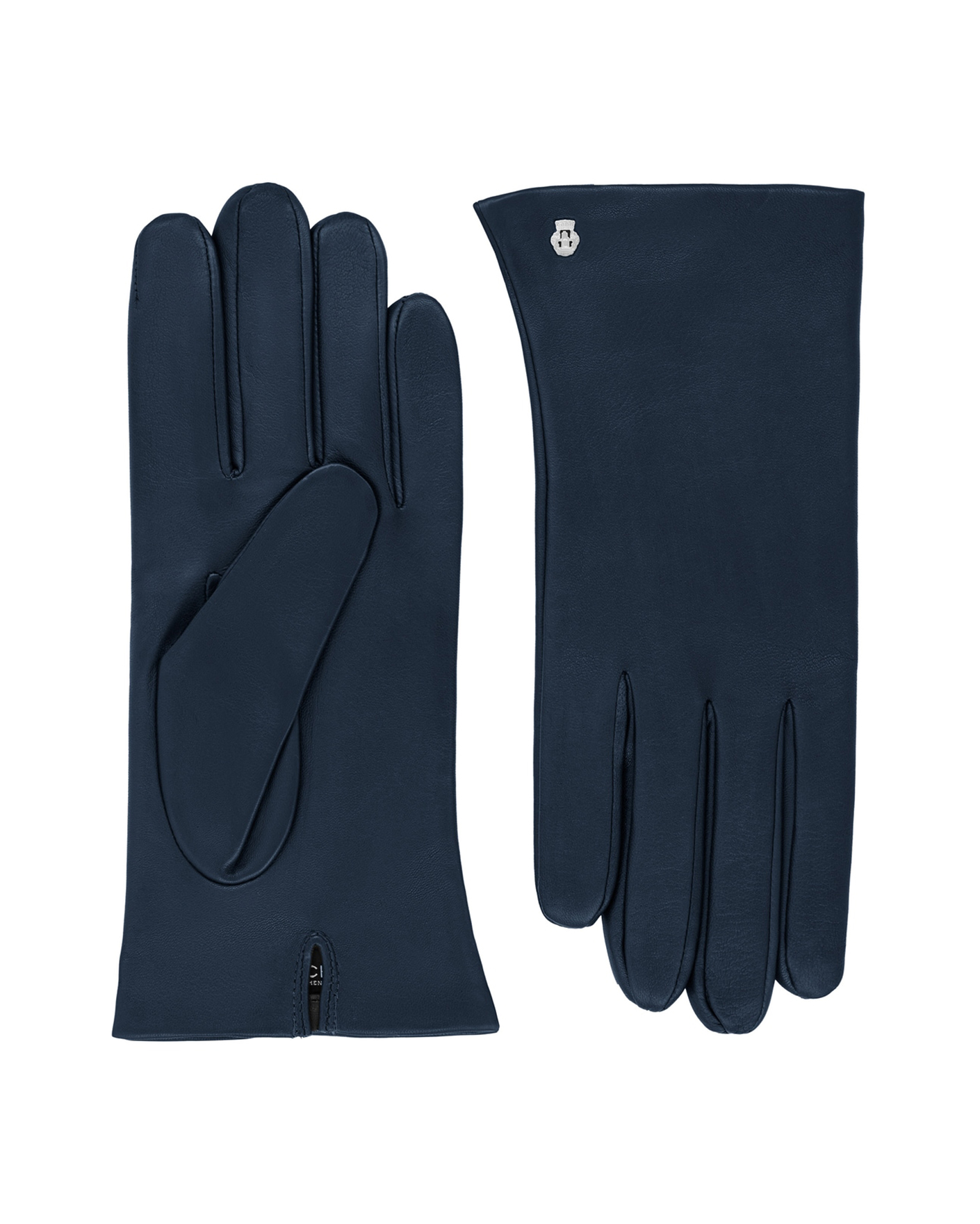 Классические перчатки Roeckl темно-синего цвета. Модель из 100% кожи, разрез для ладони и подкладка из чистого шелка облегчают надевание. Перчатки станут настоящим универсалом в любое время года.