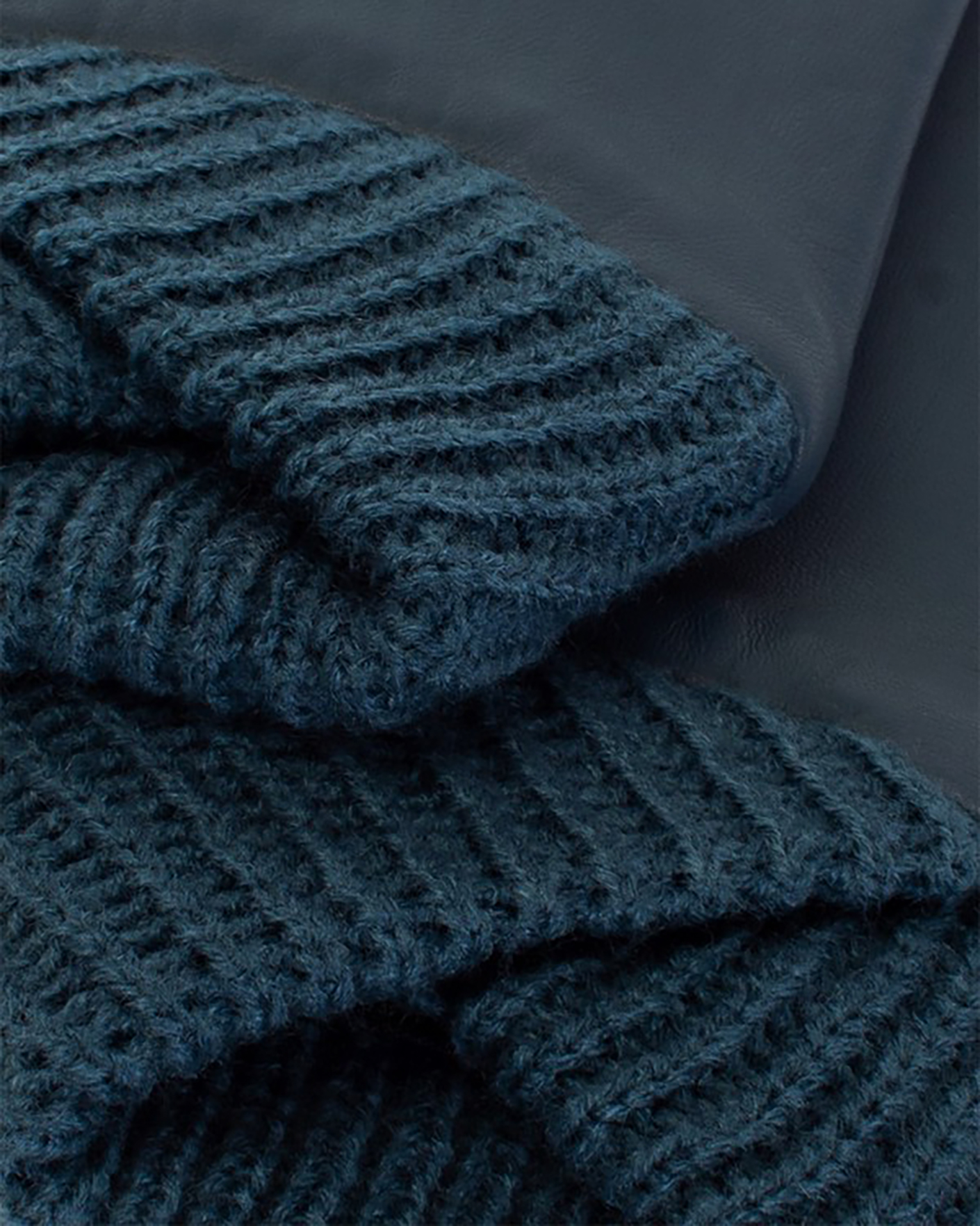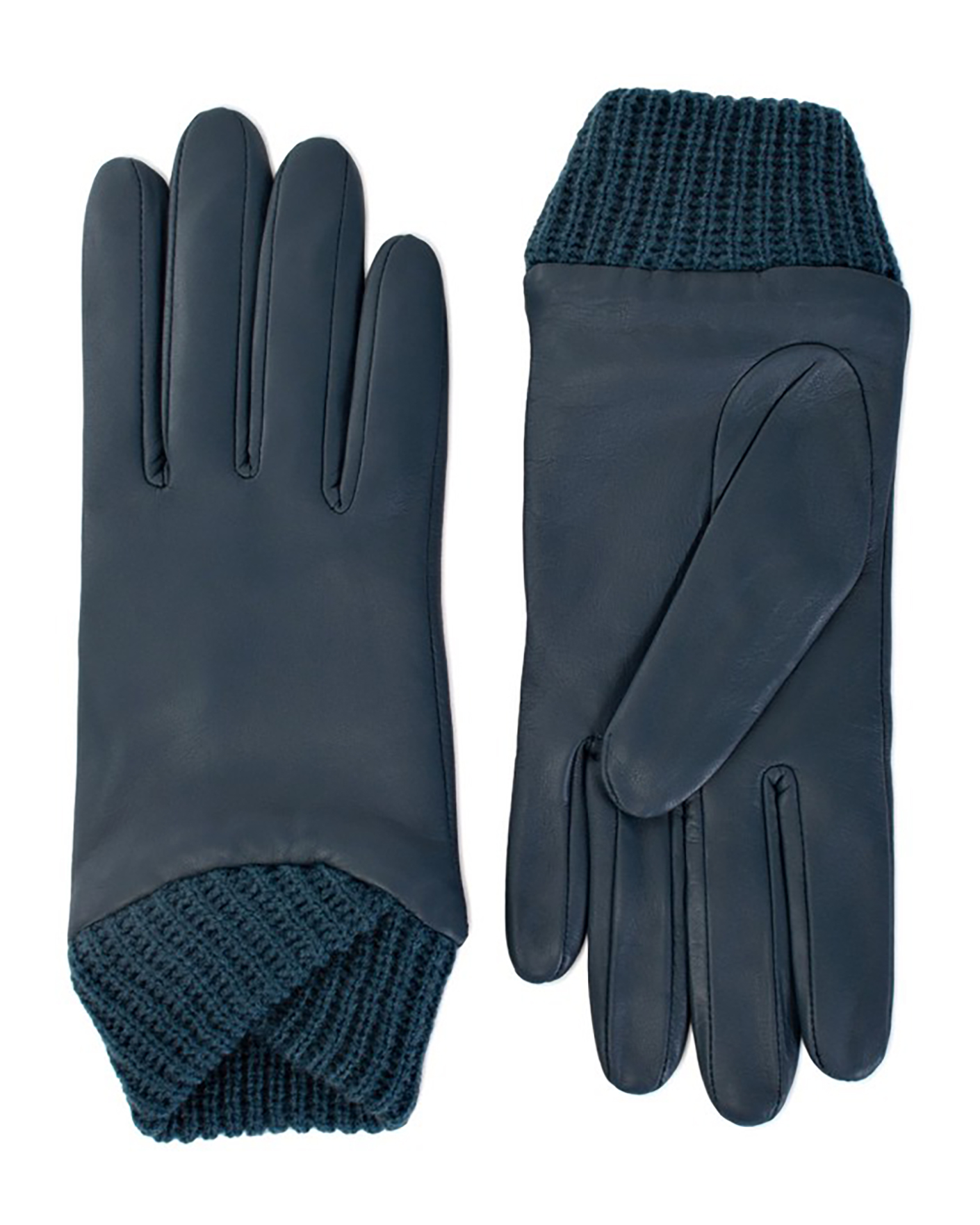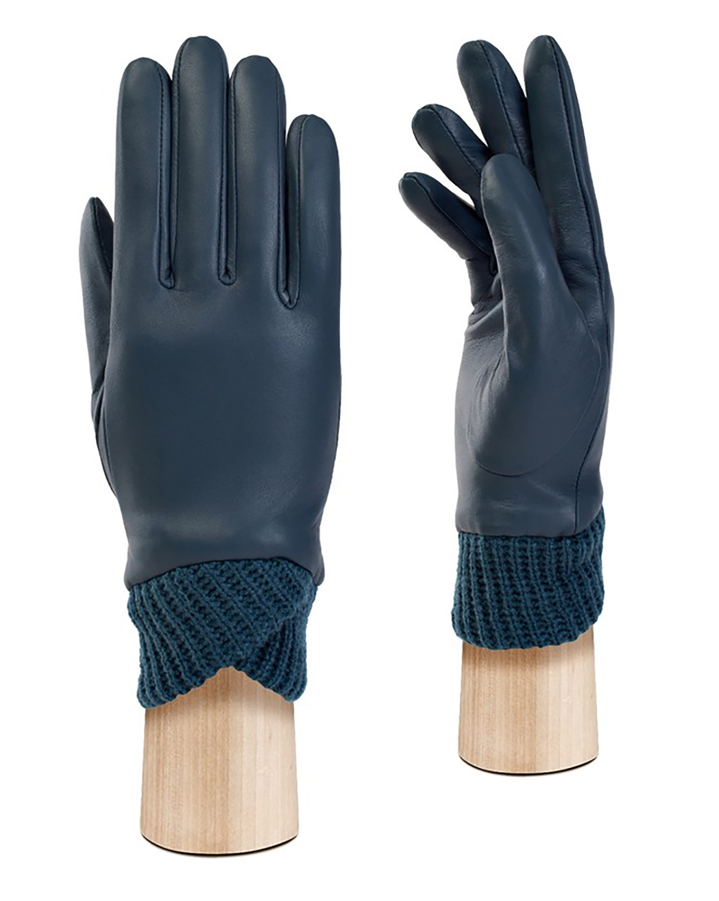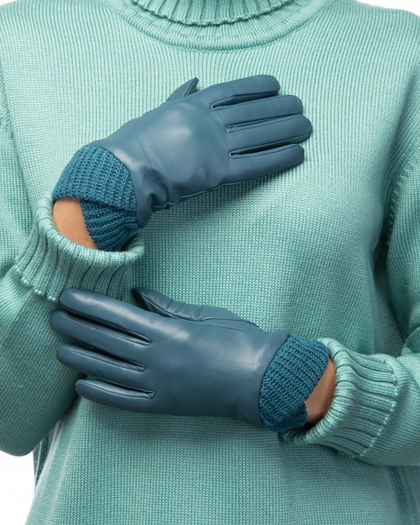 Перчатки Eleganzza сине-зеленого цвета выполнены из 100% кожи ягненка с трикотажем. Модель с ассиметричной ребристой резинкой. Стильные и теплые перчатки - актуальный аксессуар на каждый день.