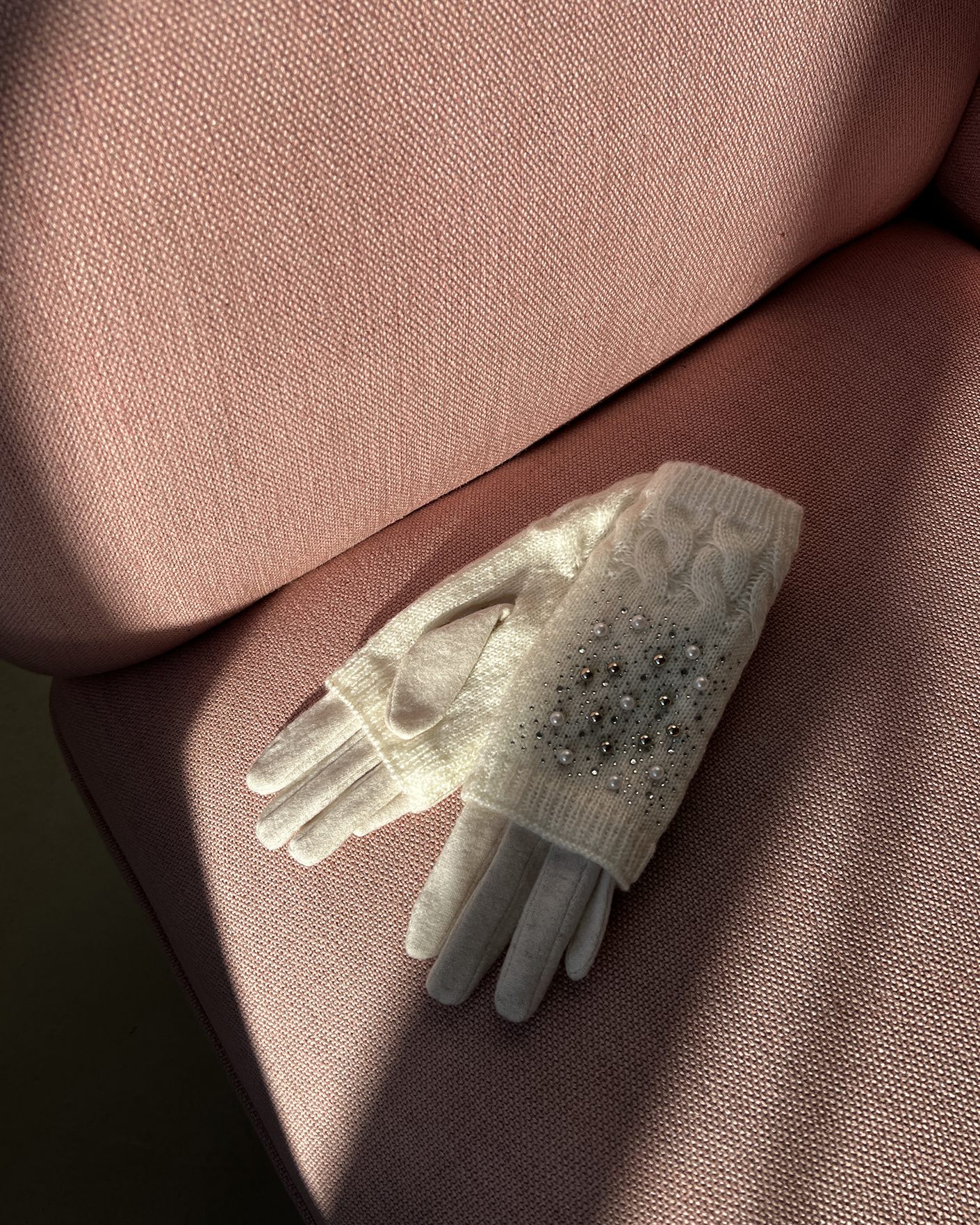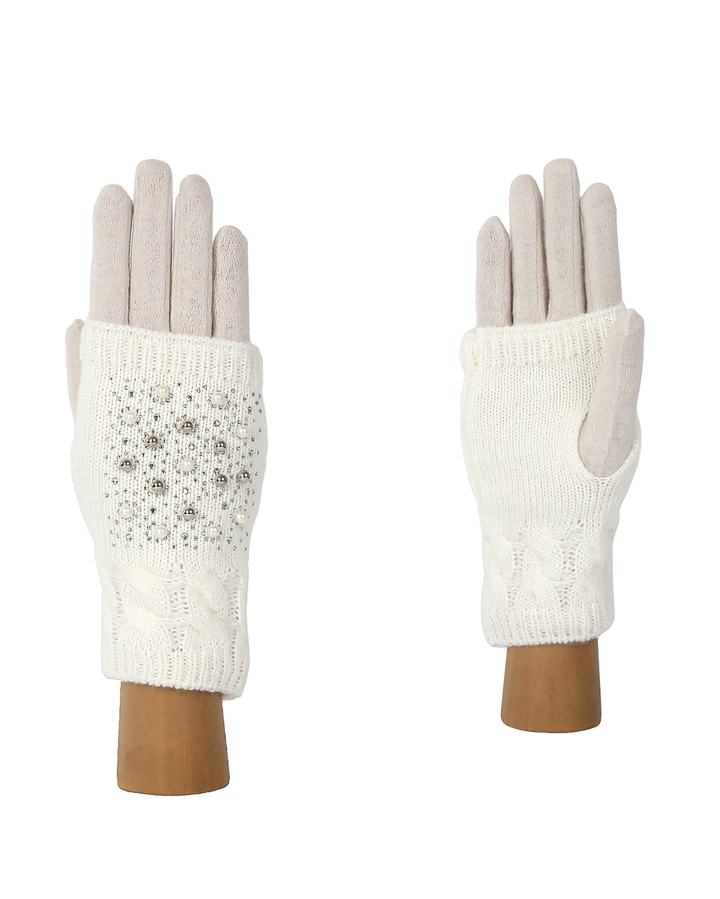 Текстурные двойные перчатки-митенки Fabretti белого цвета. Шерстяная модель с декором в виде страз и бусин. Стильные перчатки - теплый и незаменимый аксессуар.