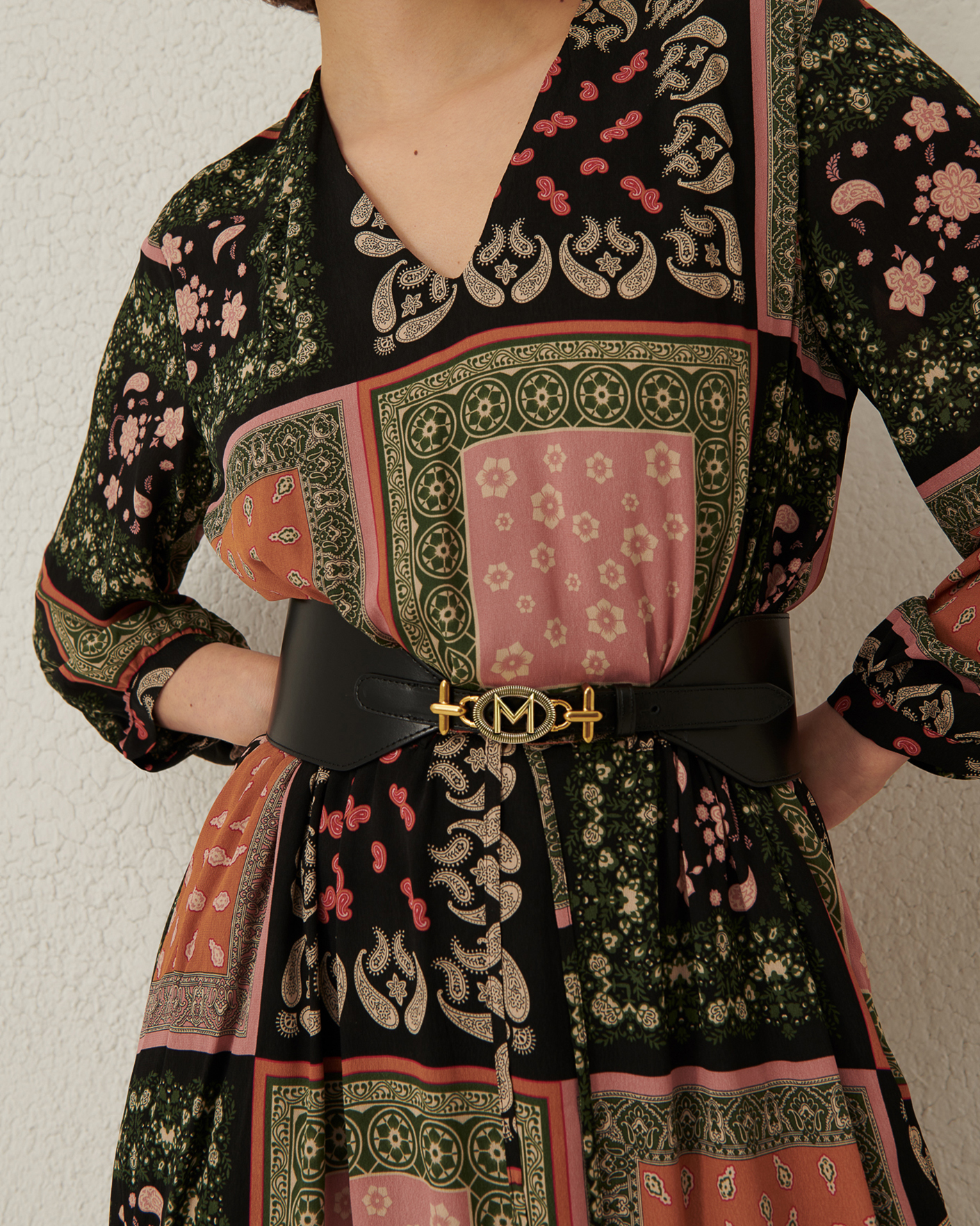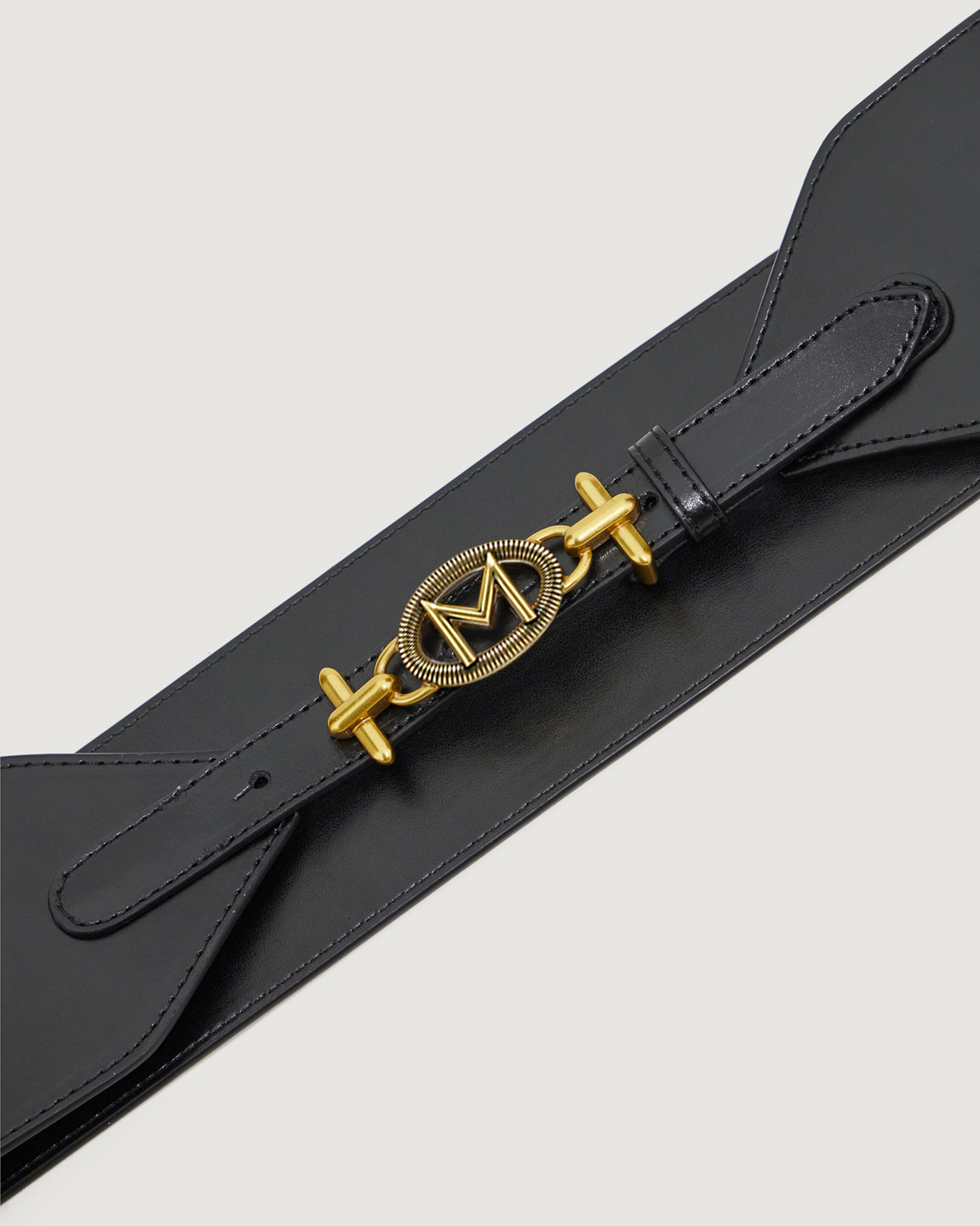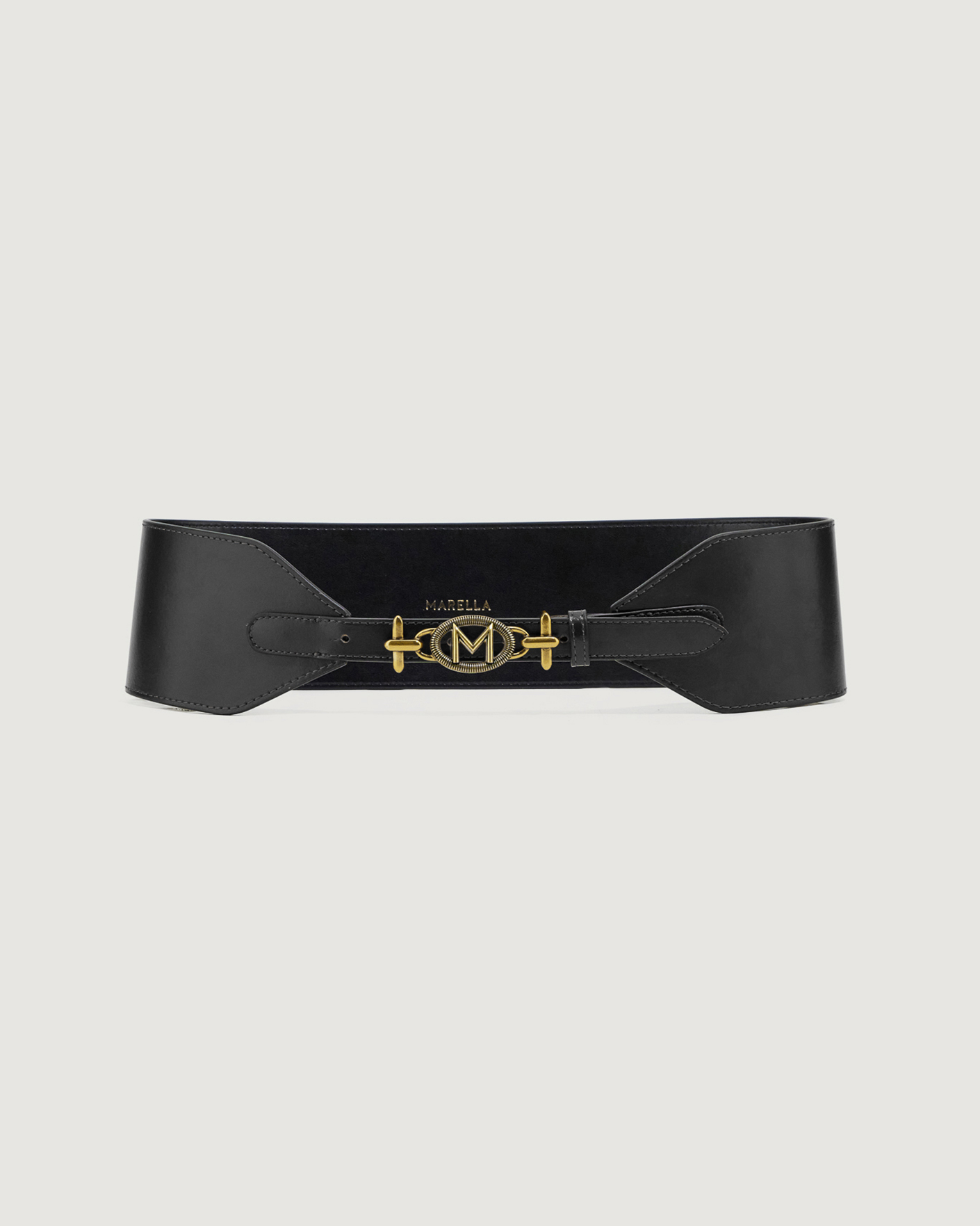 Ремень поясной от Marella в черном цвете выполнен из 100% кожи. Широкая модель с металлической пряжкой с логотипом. Ремень станет отлчиным аксессуаром на каждыйдень, который можно надевать поверх свитера, жакета и платья.