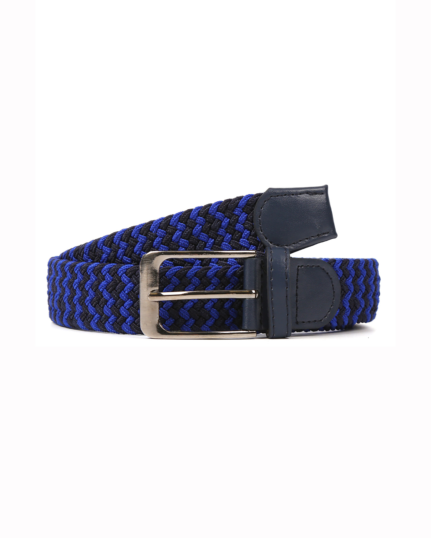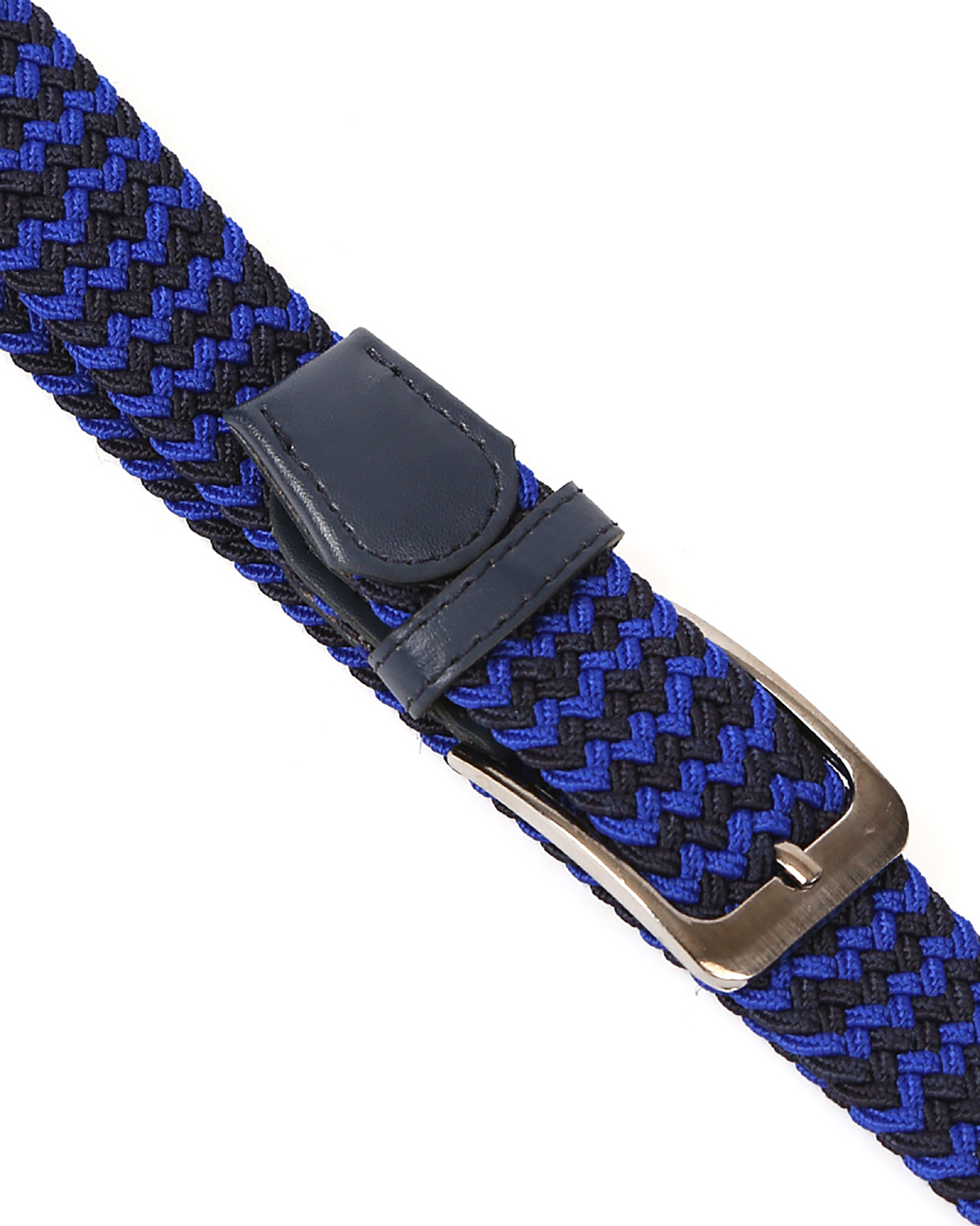 Ремень-резинка FABRETTI черно-синего цвета в геометрическое плетение - косичка. Модель универсальна и подойдет как мужчинам, так и женщинам. Квадратная пряжка и отделка из экокожи. Ремень прекрасно дополнит образы в стиле casual.