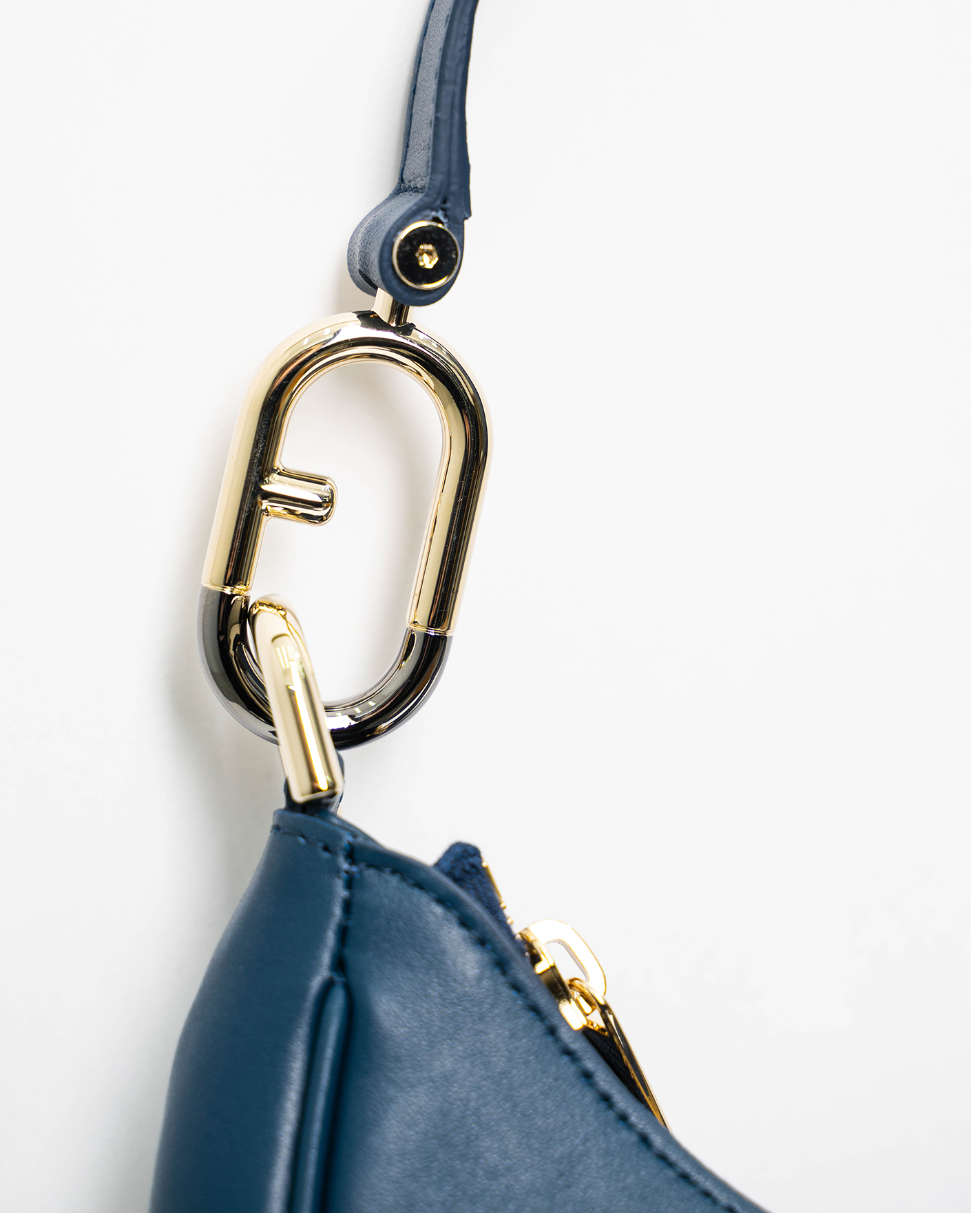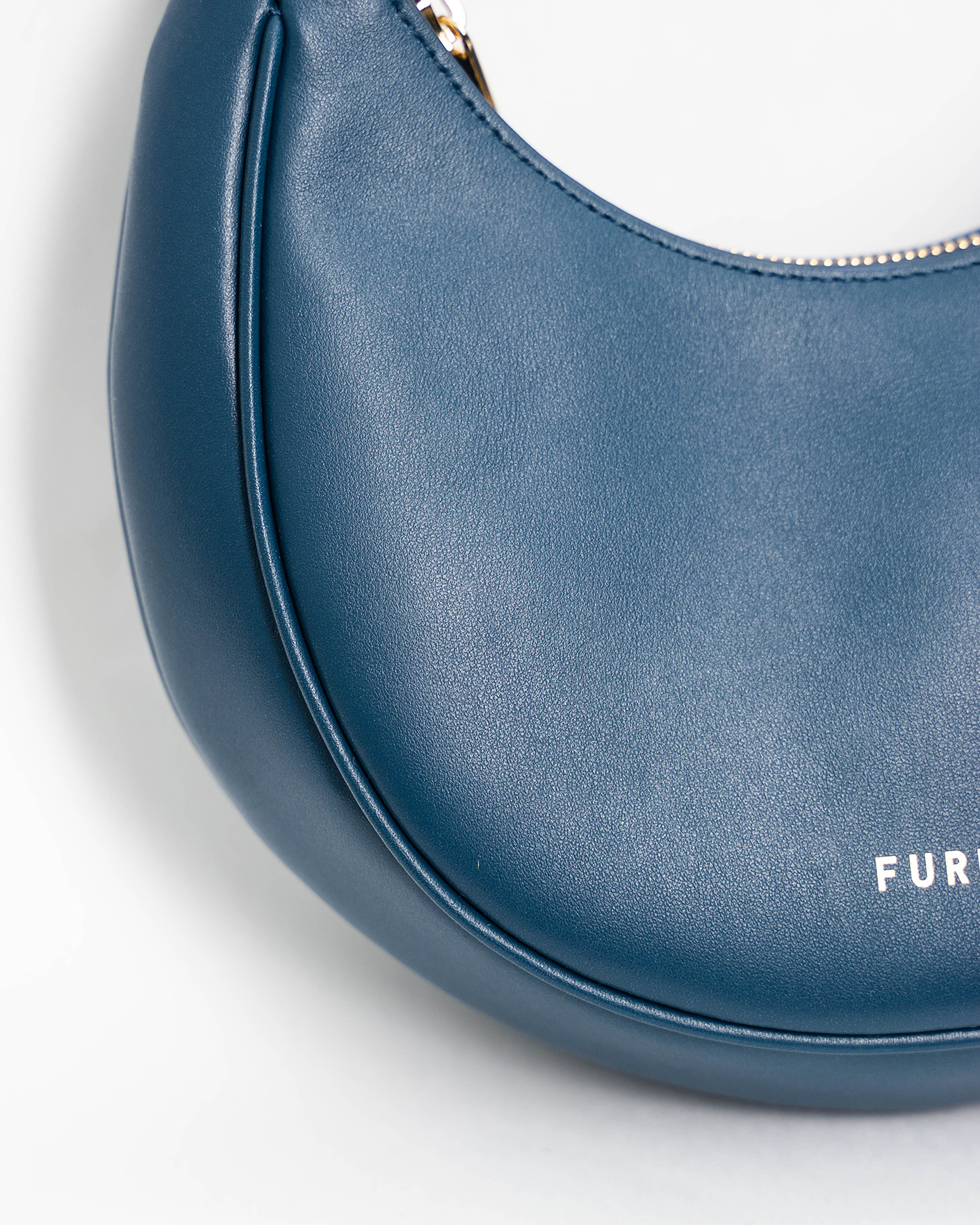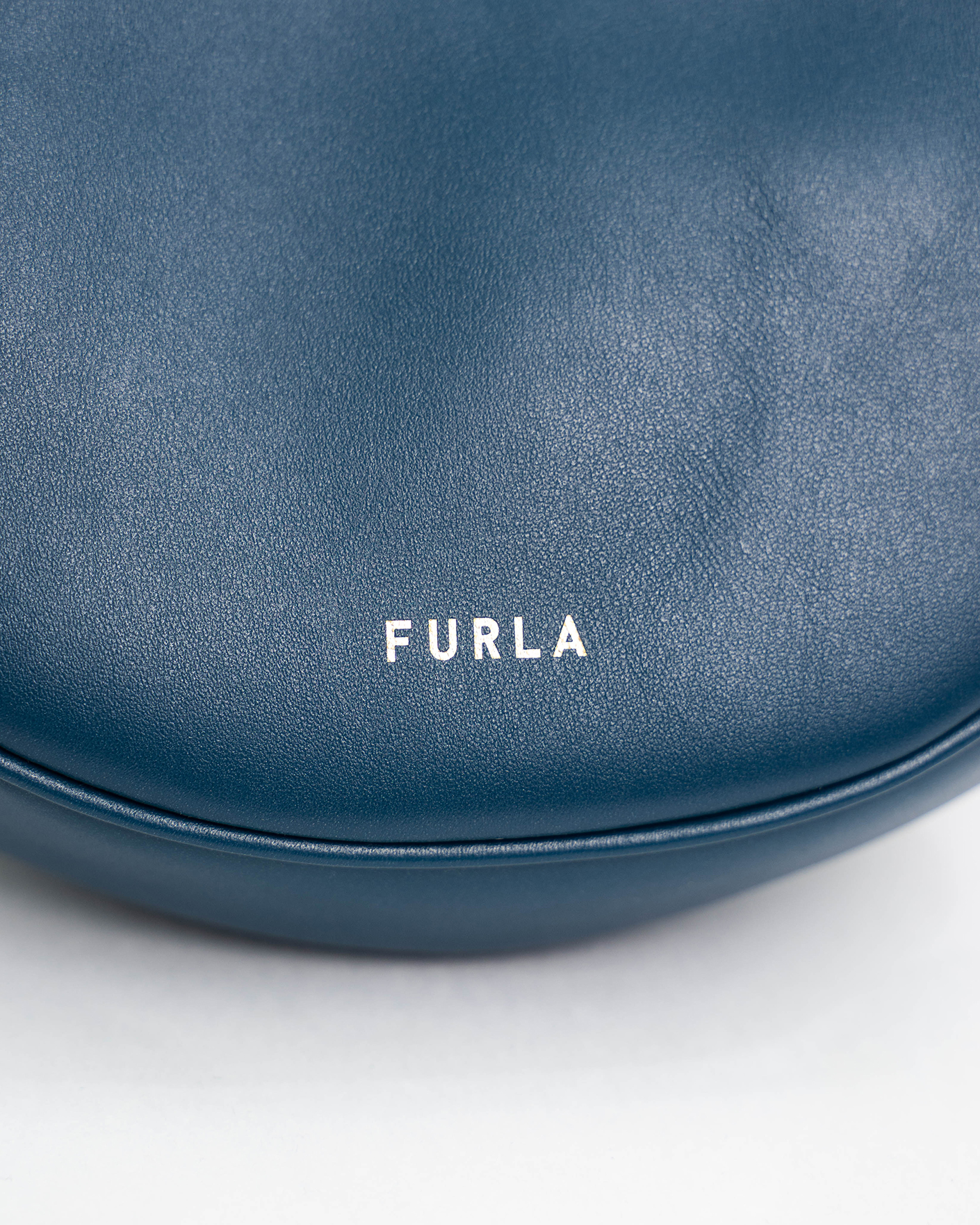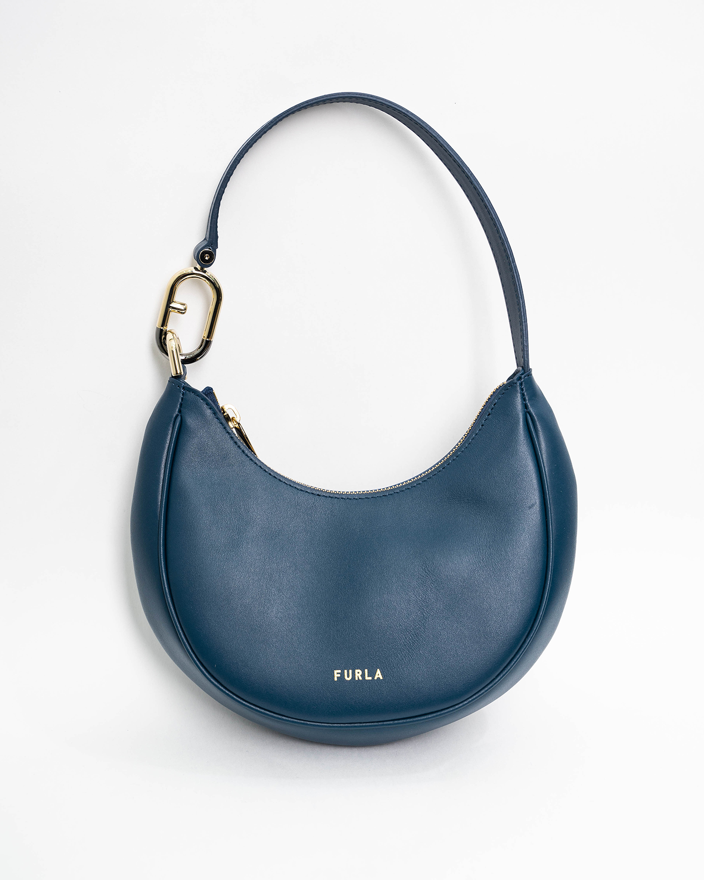 Полукруглая сумка Furla Primavera серо-синего цвета из зернистой мягкой кожи. Небольшой однотонный аксессуар из весенне-летней коллекции марки, основанной Альдо Фурланетто, дополнен короткой ручкой с металлической пряжкой. Форма этой детали вдохновлена парадным входом виллы Беллария, резиденции бренда в Болонье.