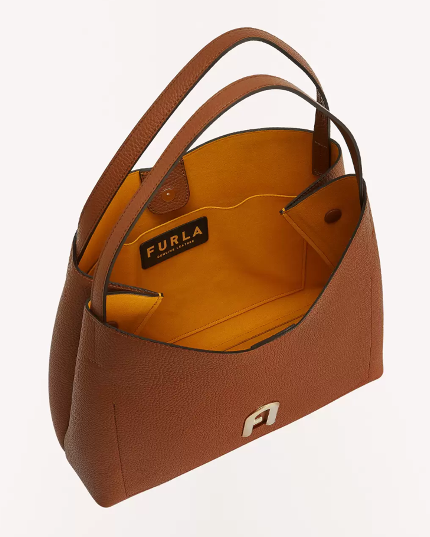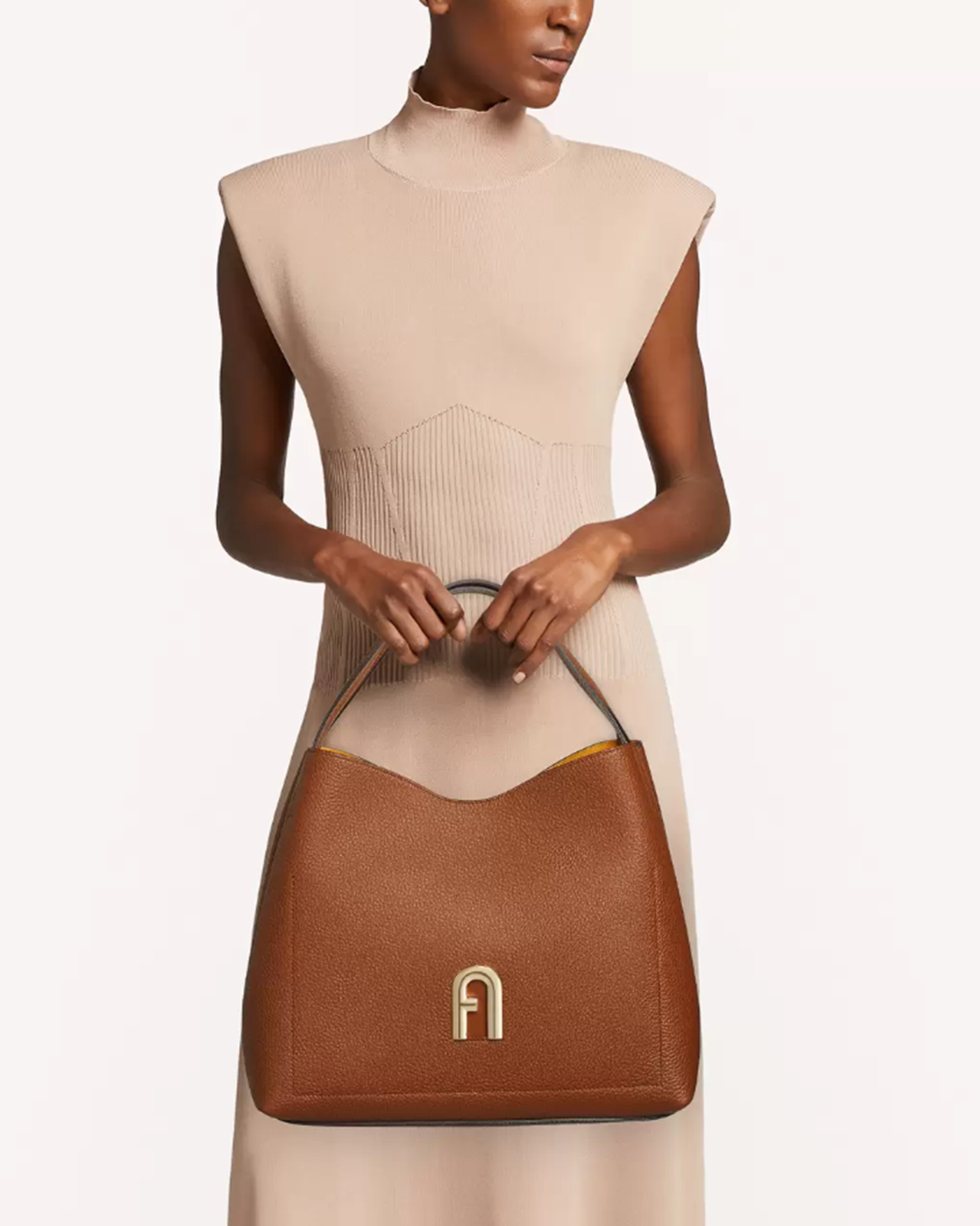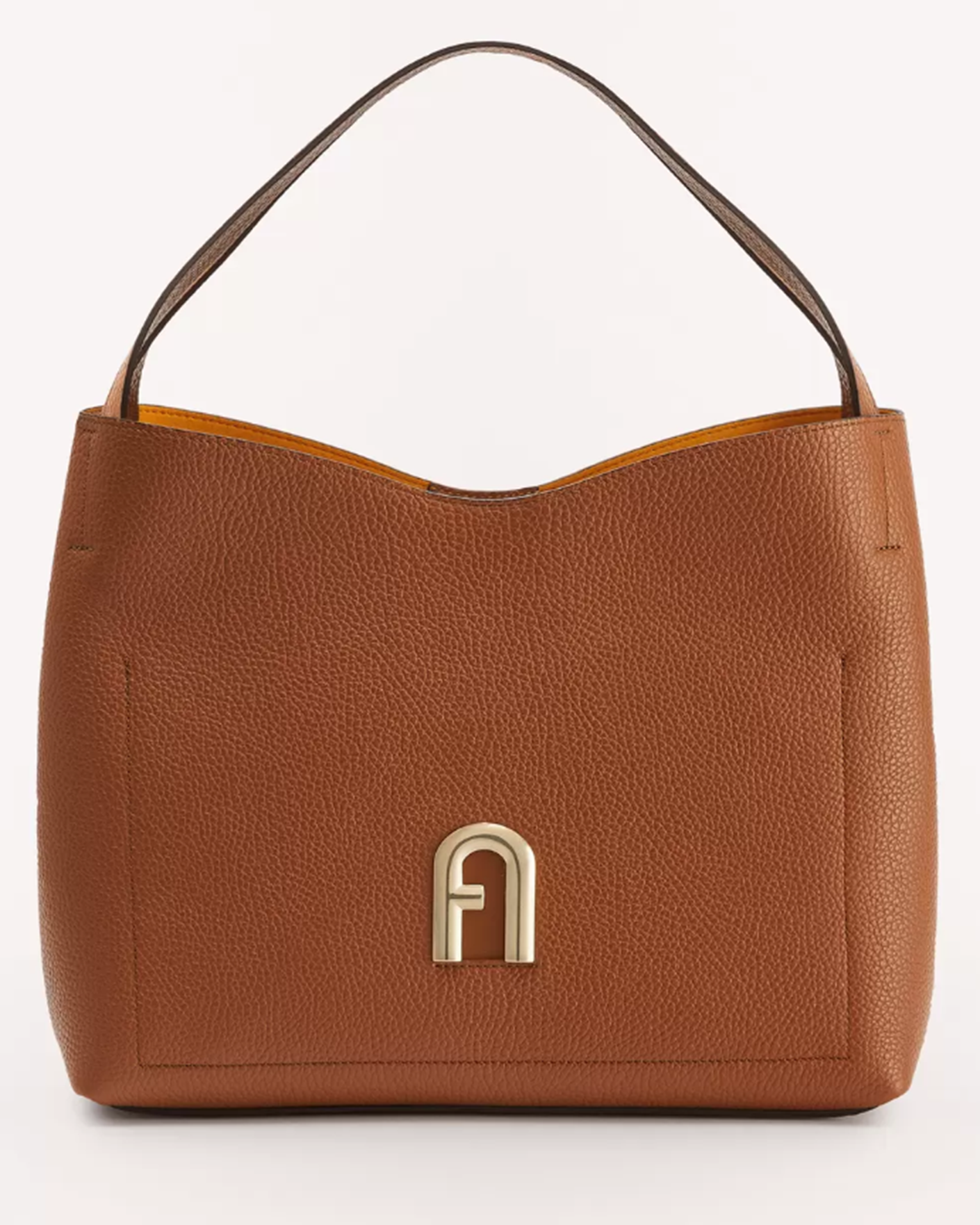 Сумка Furla Primula светло-коричневого цвета выполнена из зерненой телячьей кожи с контрастной внутренней подкладкой. Большой размер позволяет всегда иметь под рукой все самое необходимое. Модель с мягкой конструкцией, металлическими деталями и фирменным логотипом Arch с гальваническим золотистым покрытием и тисненым логотипом Furla сзади.