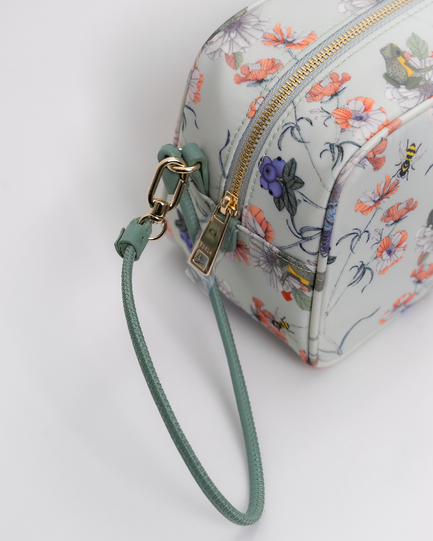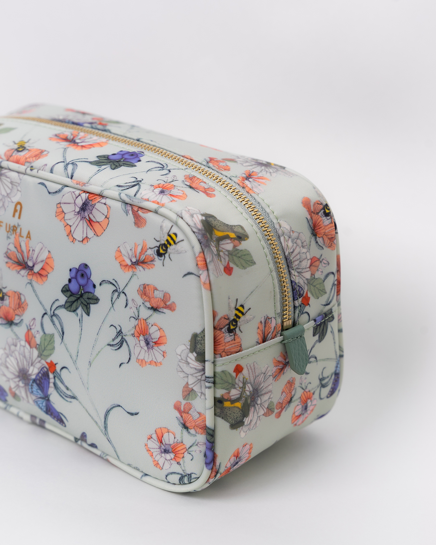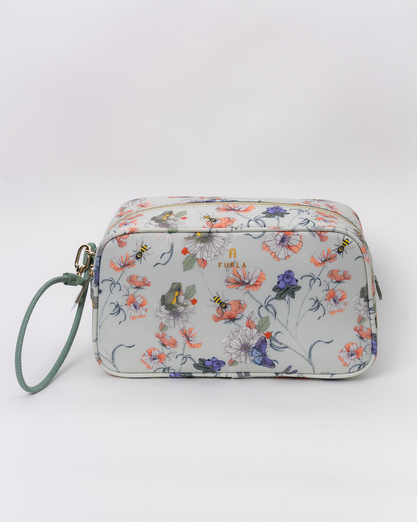 Косметичка Furla Camelia мятного цвета в цветочный летний принт. Модель с открытым внутренним карманом на молнии, вощеный шнурок для ношения на запястье, принт в виде логотипов Arch и Furla спереди. Косметичка подарит весеннее настроение и станет незаменимым аксессуаром в любой поездке благодаря своему большому размеру и практичному дизайну.