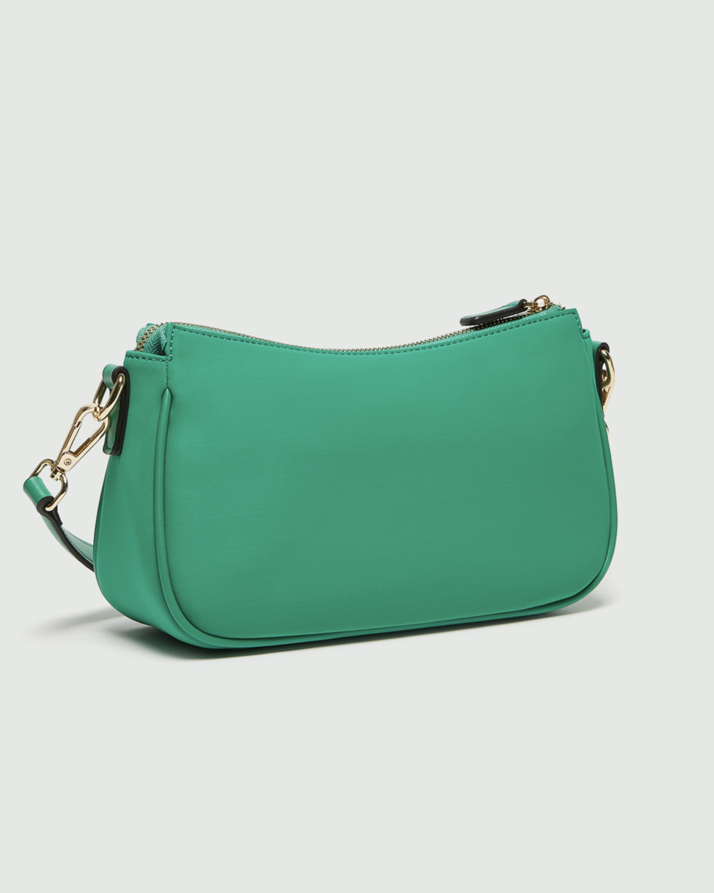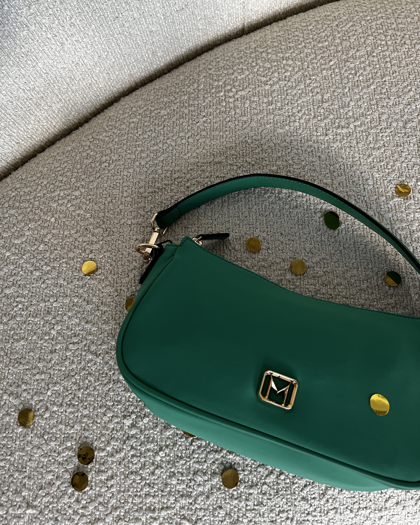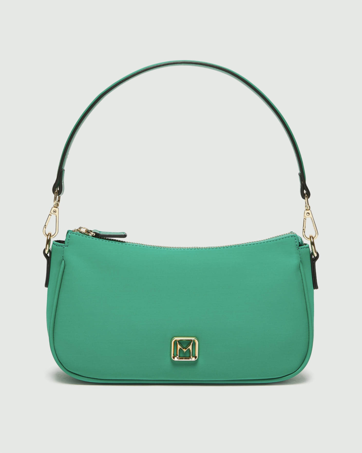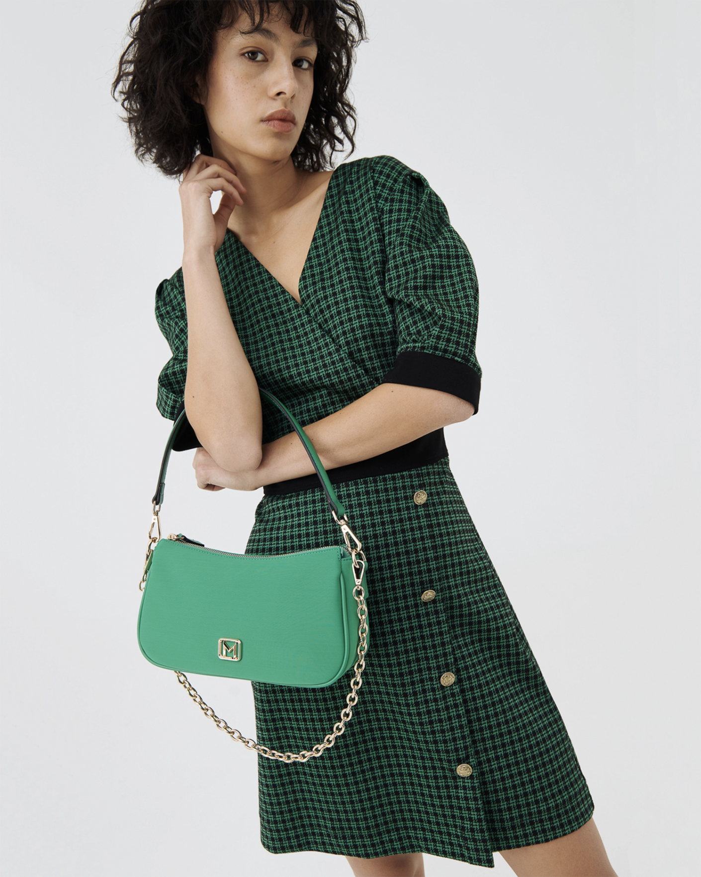Маленькая сумка-багет Marella зеленого цвета с металлическим логотипом. Модель с вместительным карманом на молнии, короткой ручкой, а также со съемным ремешком-цепочкой. Сумка - яркий и незаменимый аксессуар на каждый день.