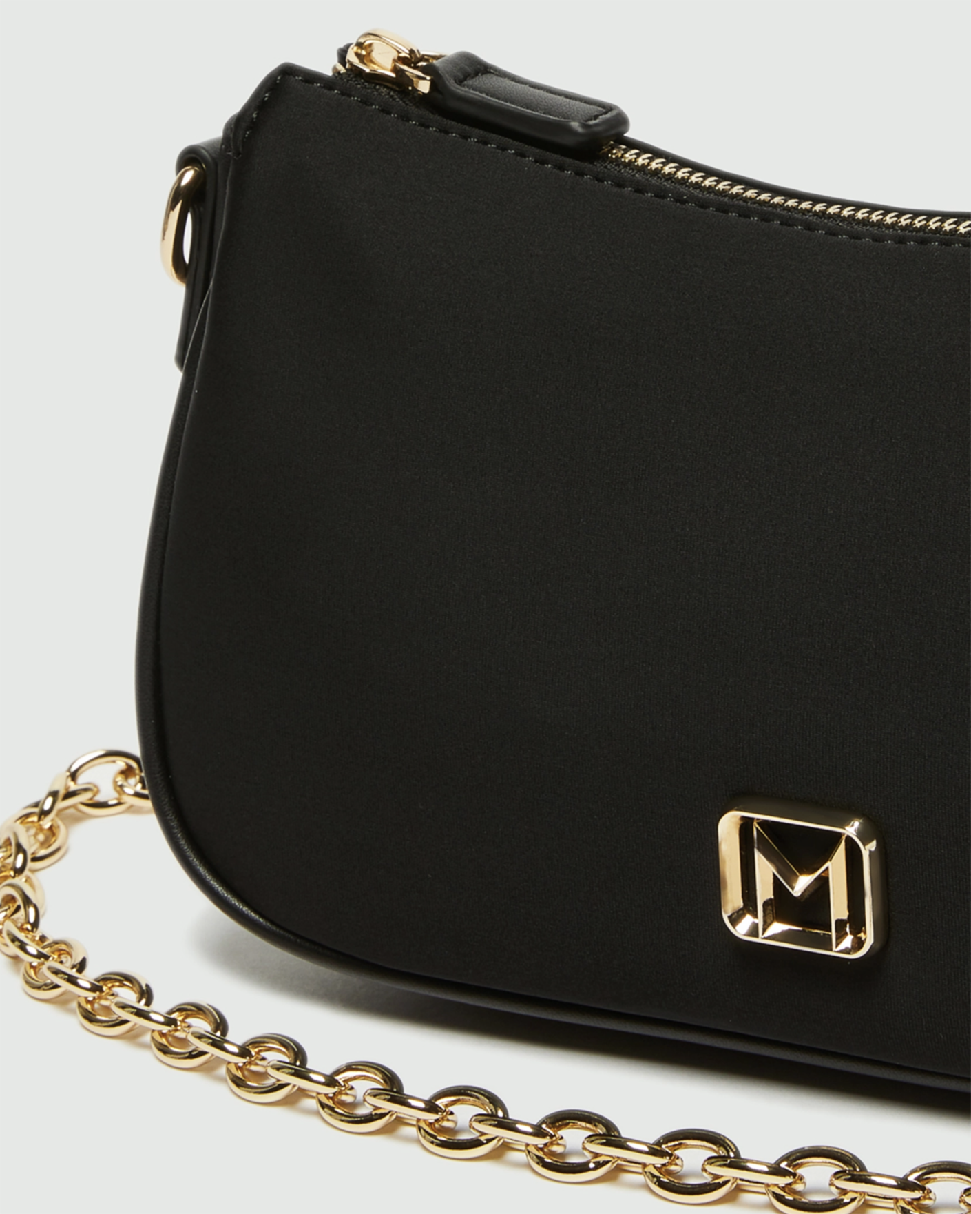 Маленькая сумка-багет Marella черного цвета с металлическим логотипом. Модель с вместительным карманом на молнии, короткой ручкой, а также со съемным ремешком-цепочкой. Сумка - яркий и незаменимый аксессуар на каждый день.