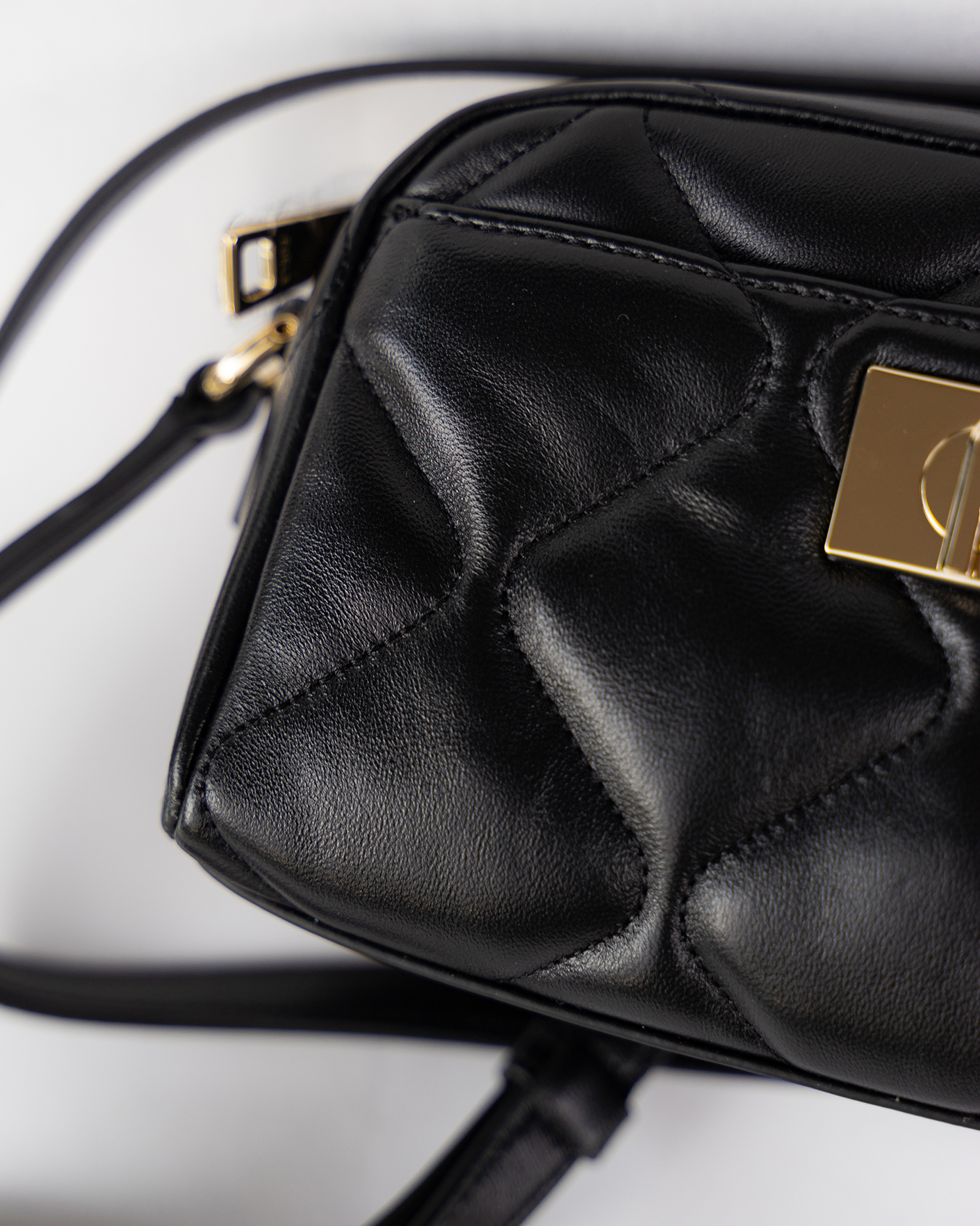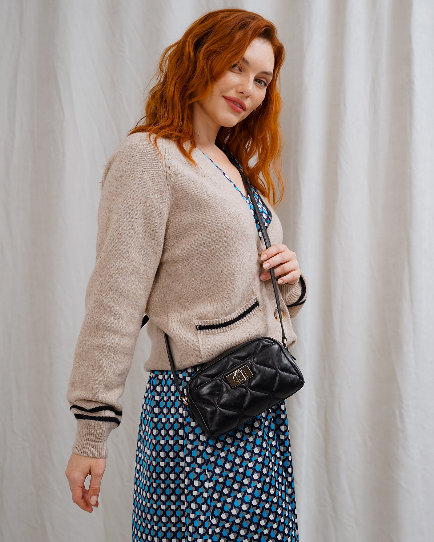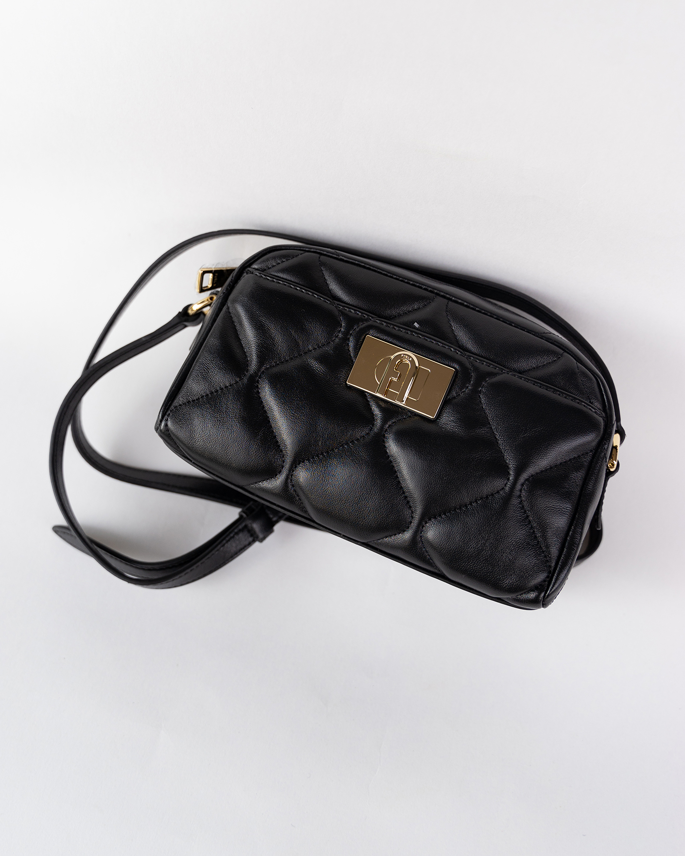 Мини-сумка Furla белого цвета в геометрическую стежку. Кожаная модель прямоугольной формы с внутренним карманом на молнии, врезным с культовой застежкой с поворотным замком и логотипом Arch. Регулируемый ремешок позволяет носить сумку через плечо.