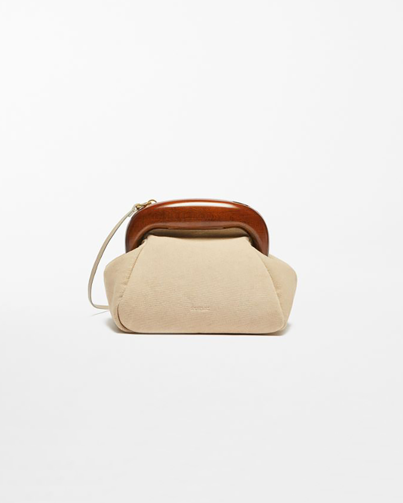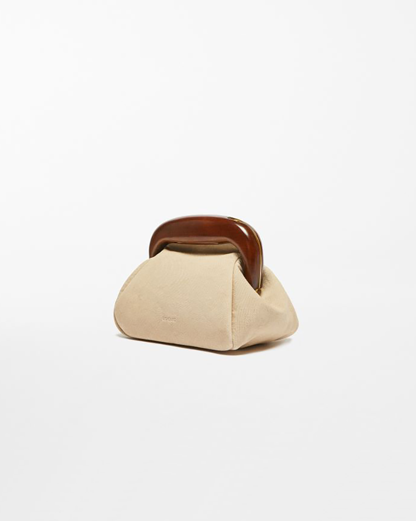 Мини сумка Sportmax бежевого цвета в строчный рисунок. Мягкая модель из 100% хлопка. Крупная деревянная рама дополнена вставкой с латунной отделкой с сатиновым эффектом. Можно носить в руке как клатч или через плечо благодаря регулируемому и съемному плечевому ремню.