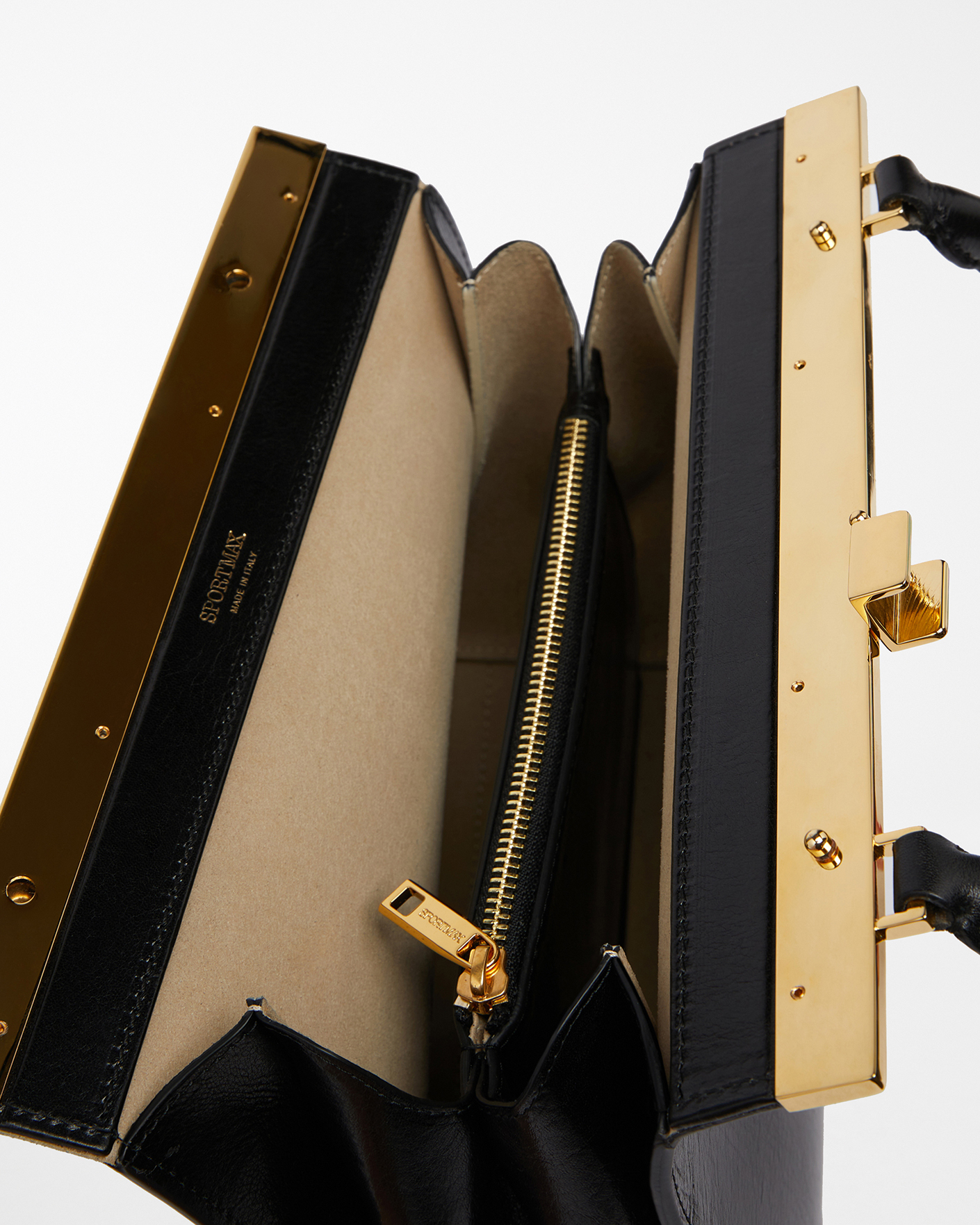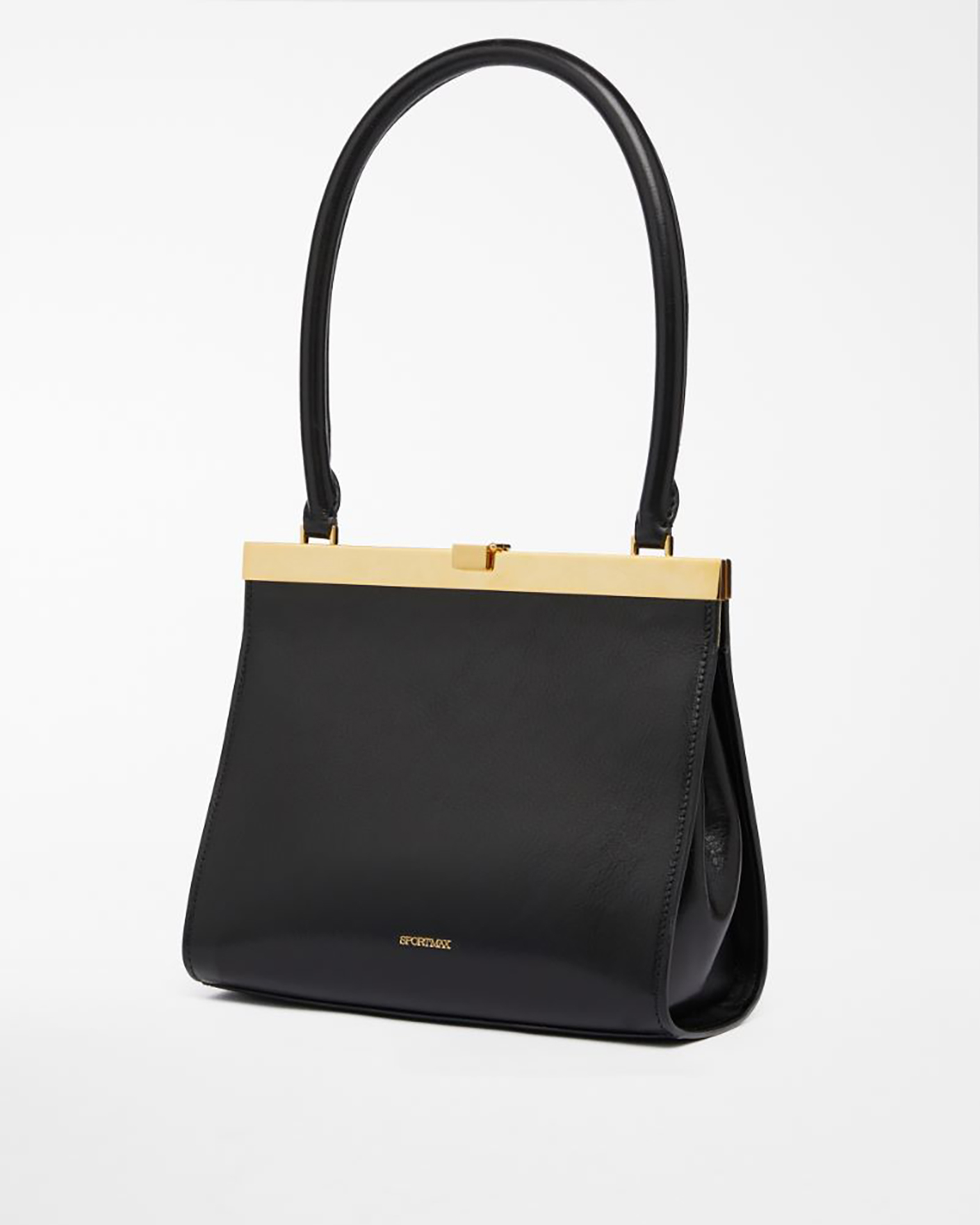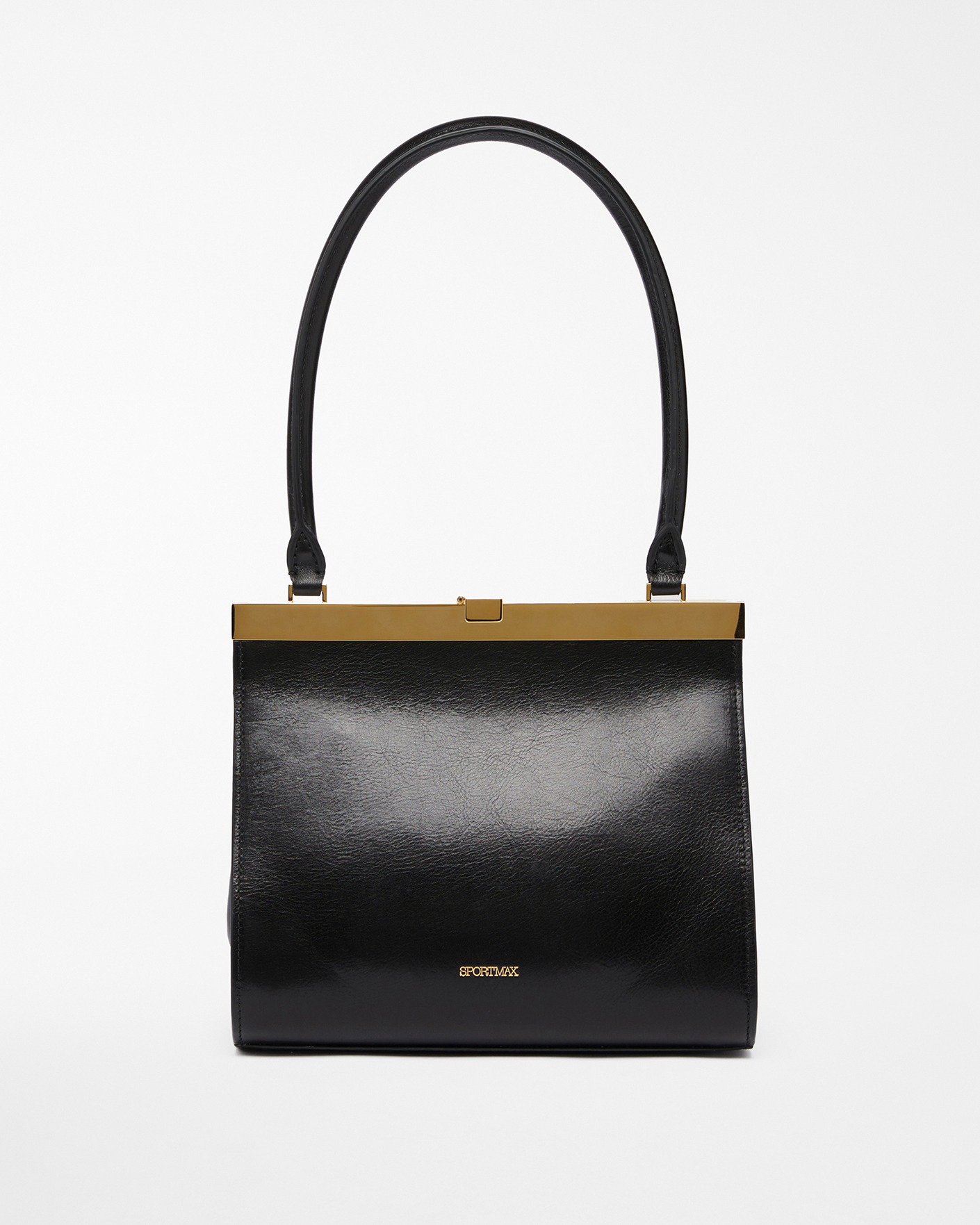 Сумка Sportmax черного цвета. Модель строгой структурированной конструкцией, с прямоугольной застежкой из блестящего металла с гальваническим покрытием в верхней части. Два отделения, центральный карман на молнии. Сумку можно носить на плече с помощью круглого ремешка. Сумка идеально завершит ваш образ как на каждый день, так и на вечернее мероприятие.