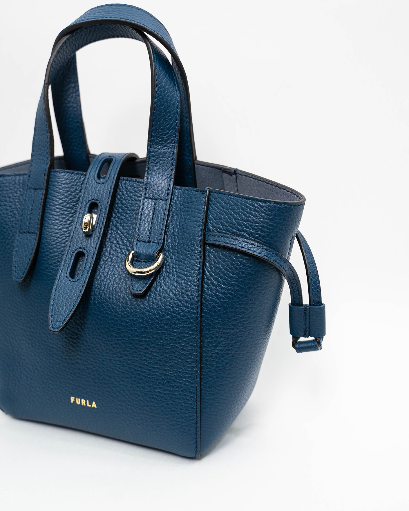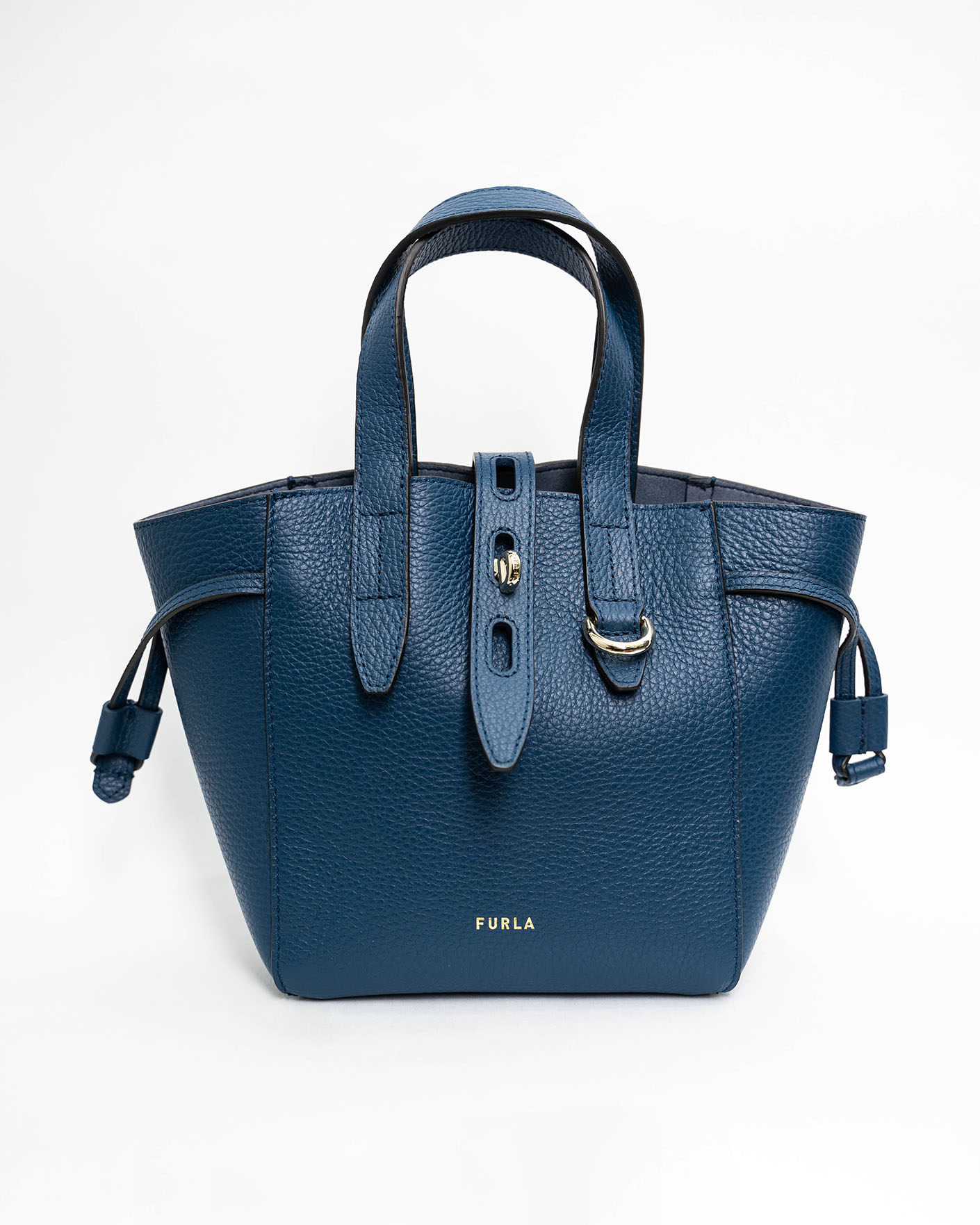 Сумка-тоут Furla Net серо-синего цвета выполнена из 100% зерненой кожи. Компактная модель с контрастной внутренней подкладкой. Объем изделия регулируется с помощью кулиски, которая затягивается по бокам. Дизайн сумки завершает металлическая поворотная застежка и овальными отверстиями на кожаной петле.