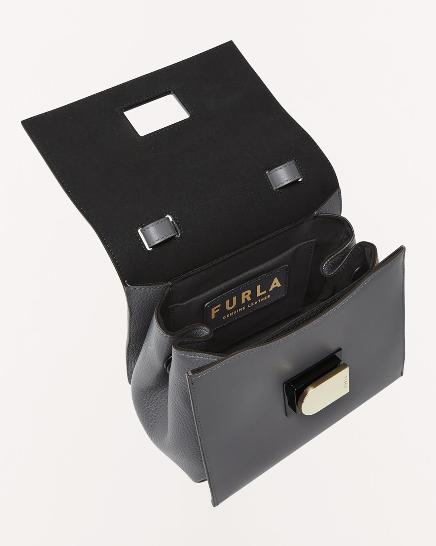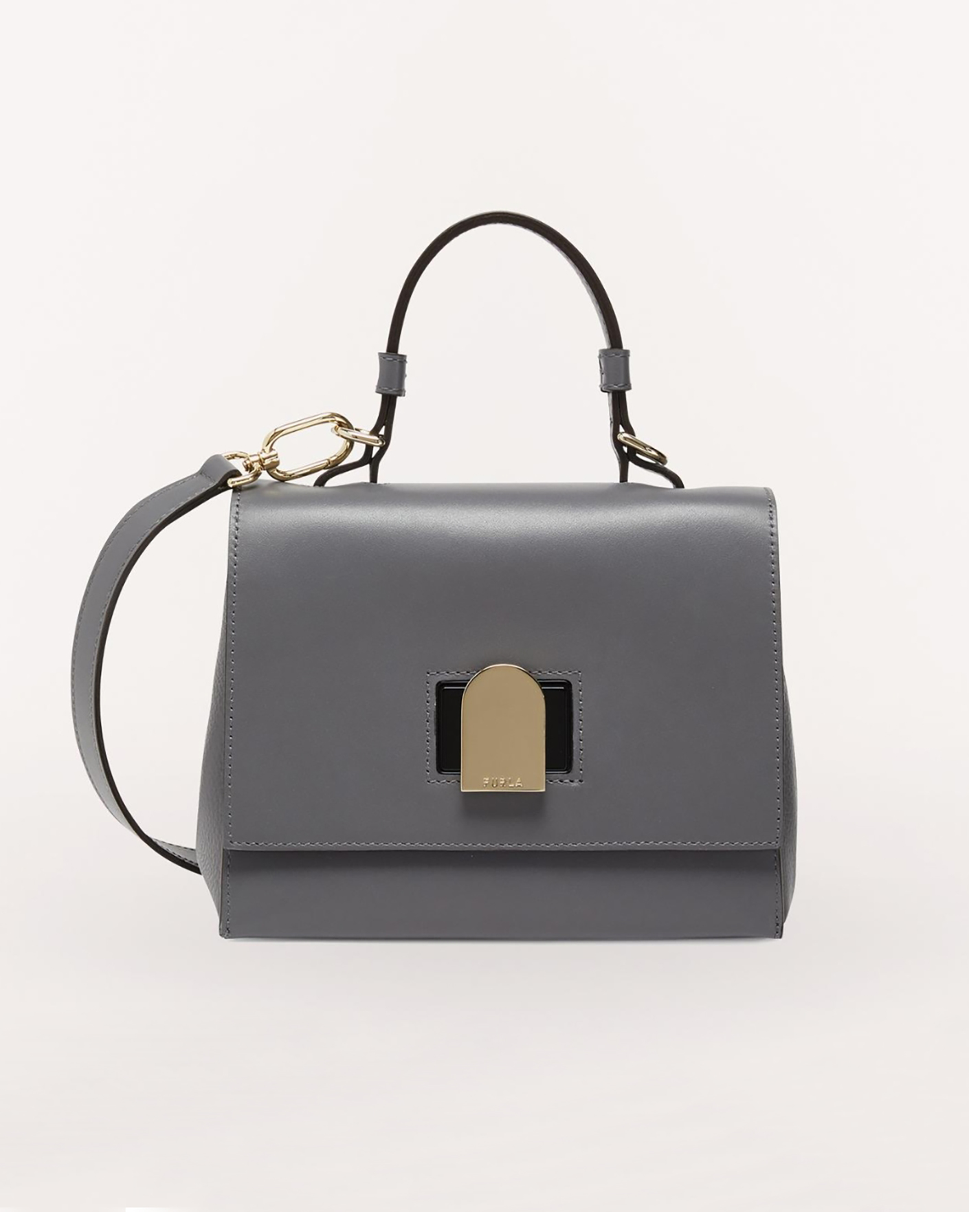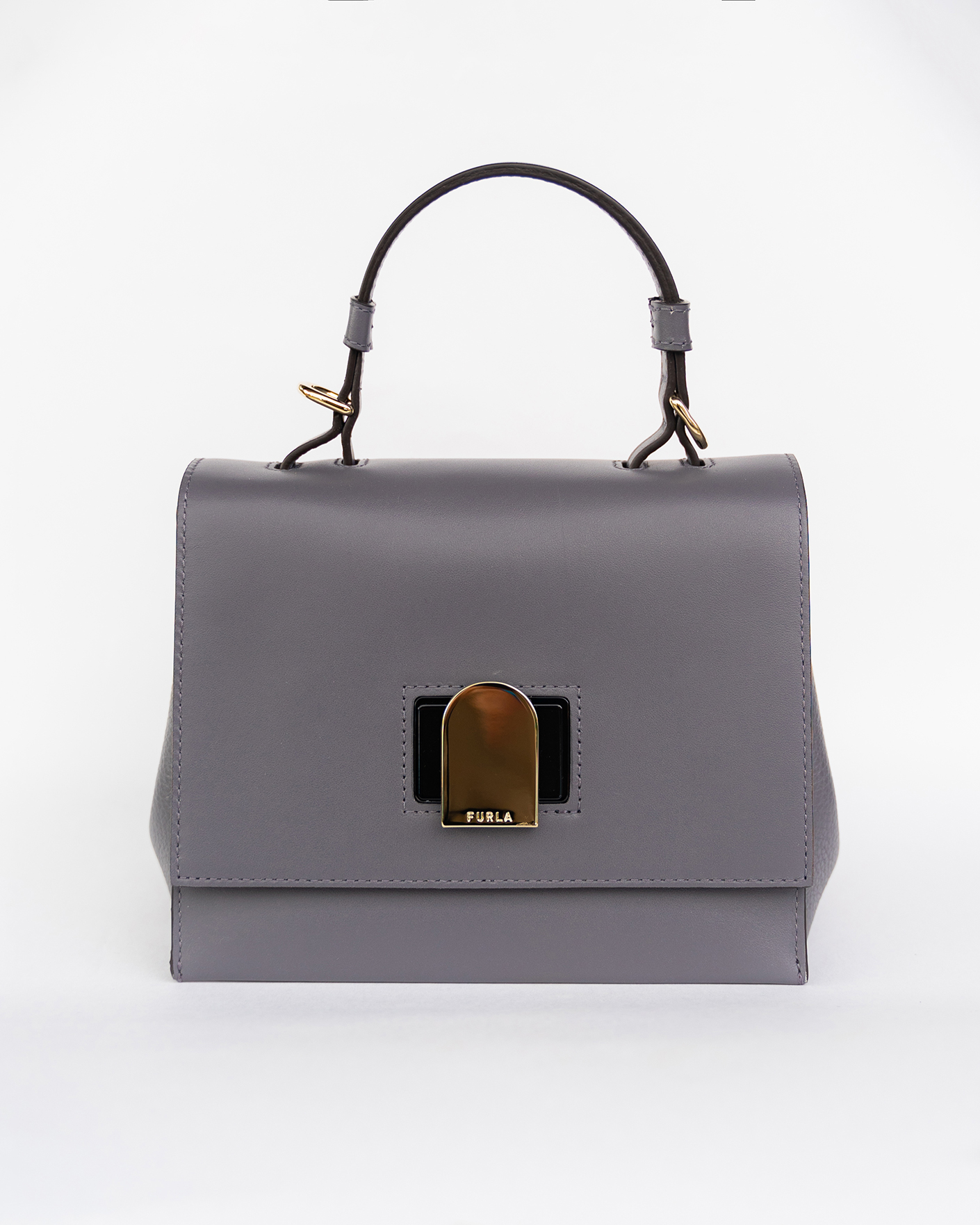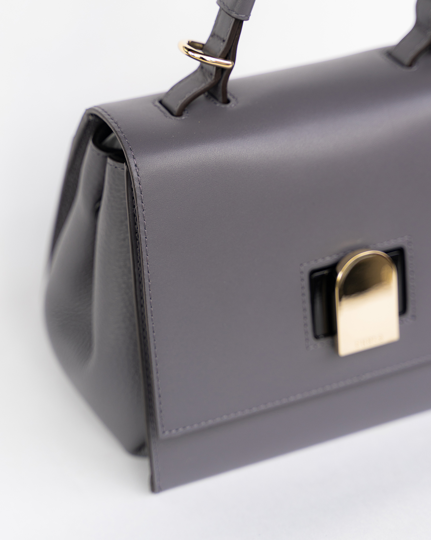 Мини-сумка Furla Emma серого цвета выполнена из 100% кожи. Модель с круглой кожаной ручкой сверху, имеется съемный регулируемый ремешок, что позволяет носить сумку на и через плечо. При необходимости размер изделия регулируется с помощью практичных боковых кнопок. Сумка оснащена характерной застежкой с поворотным замком и логотипом Arch спереди.