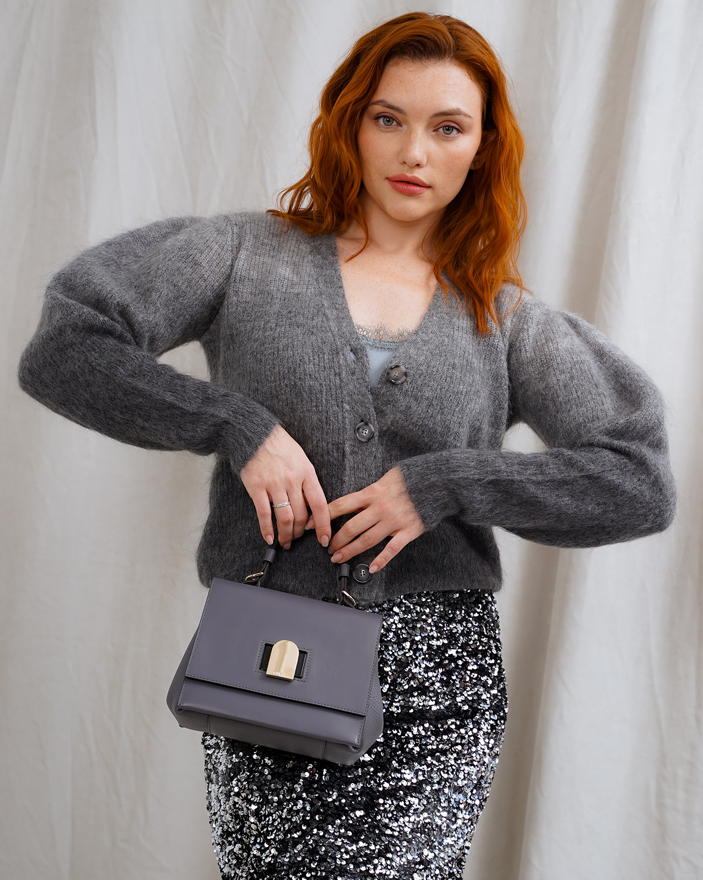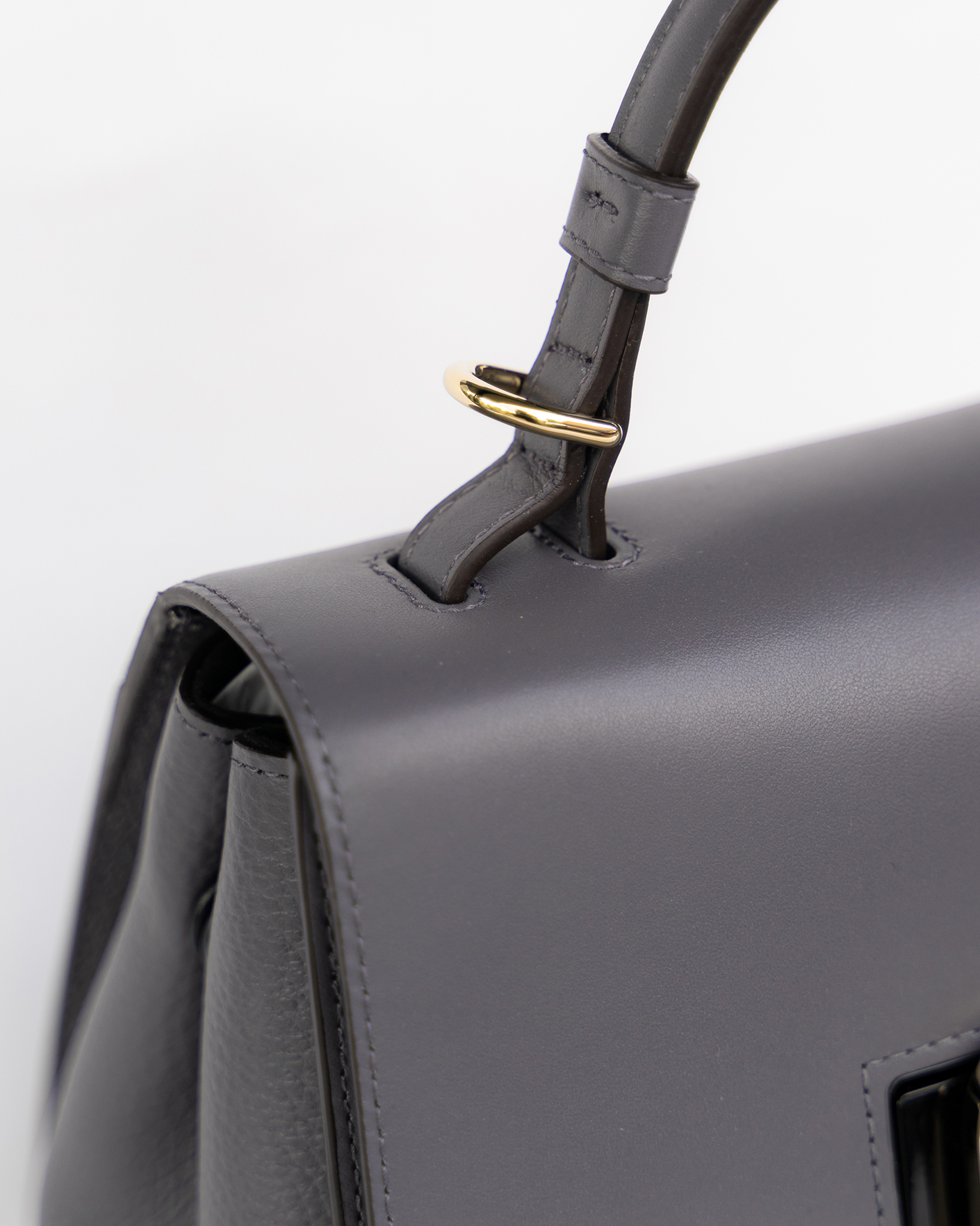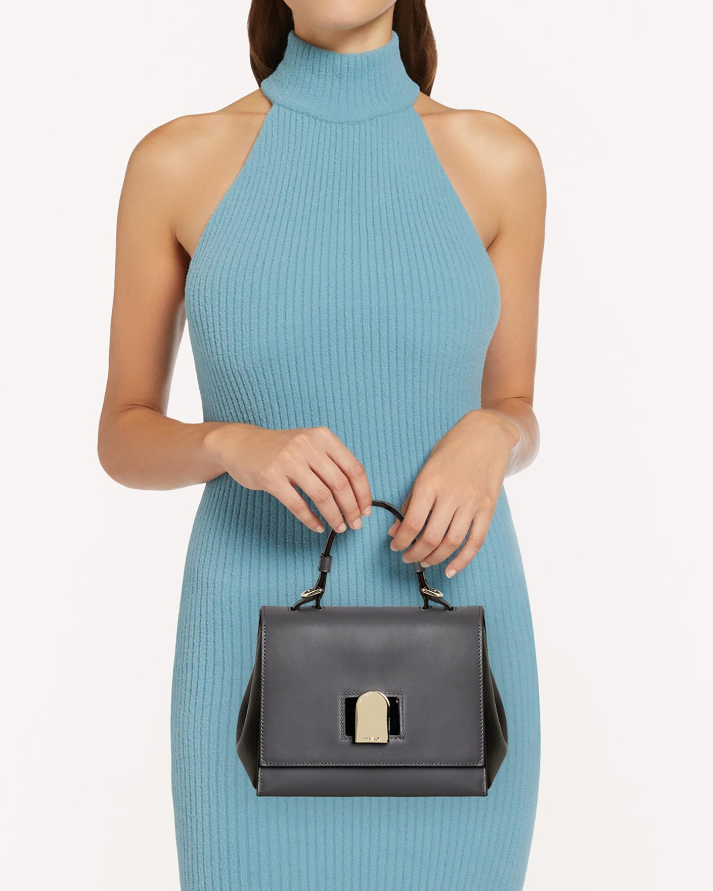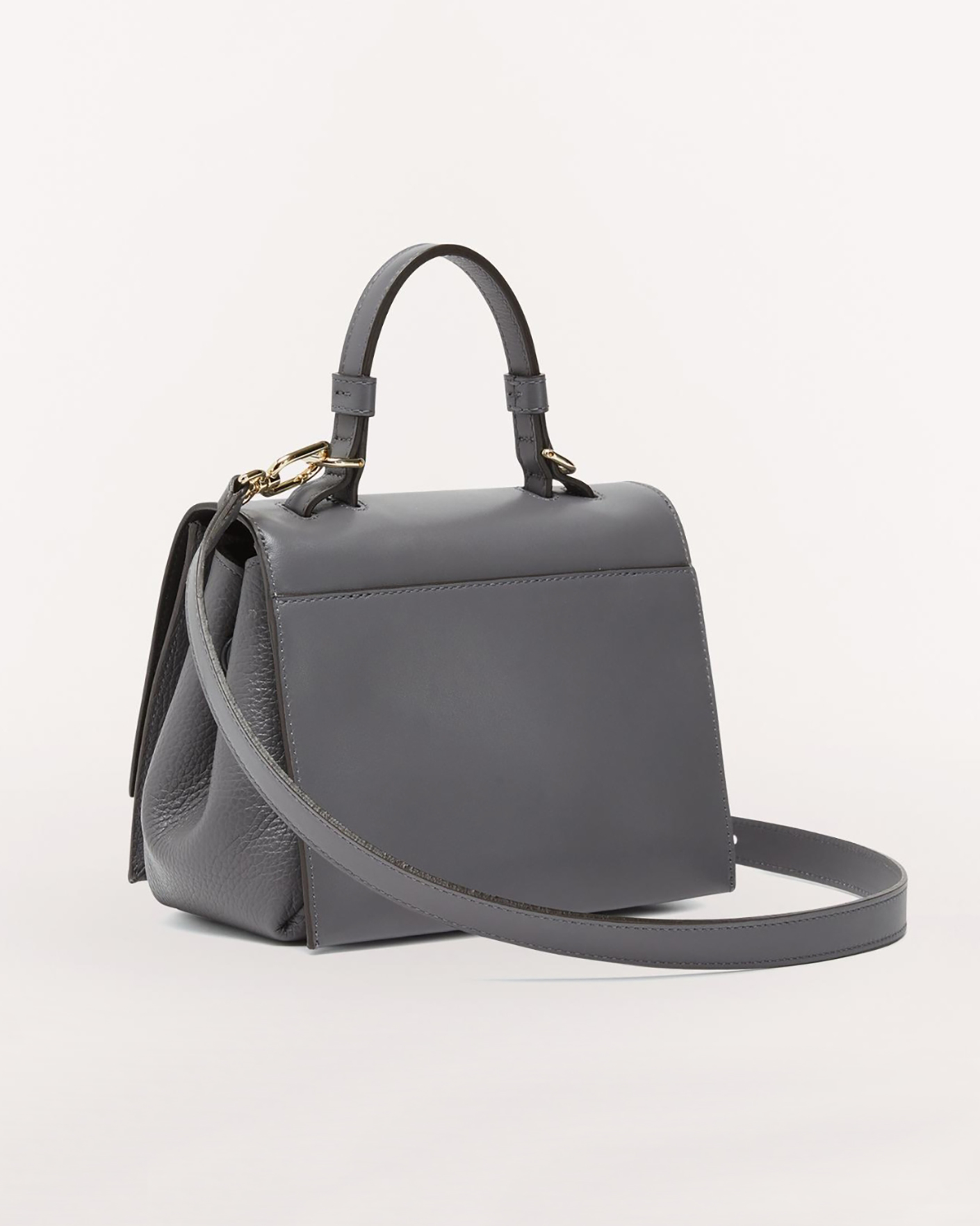 Мини-сумка Furla Emma серого цвета выполнена из 100% кожи. Модель с круглой кожаной ручкой сверху, имеется съемный регулируемый ремешок, что позволяет носить сумку на и через плечо. При необходимости размер изделия регулируется с помощью практичных боковых кнопок. Сумка оснащена характерной застежкой с поворотным замком и логотипом Arch спереди.