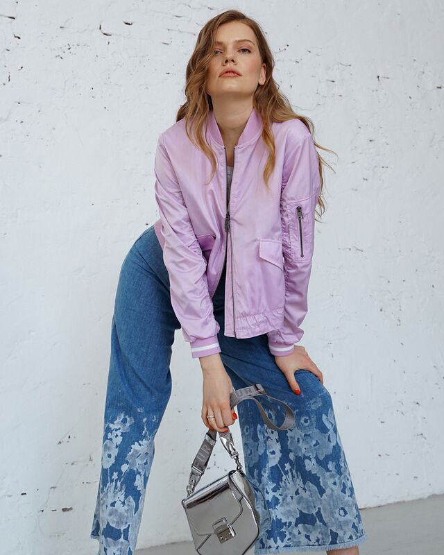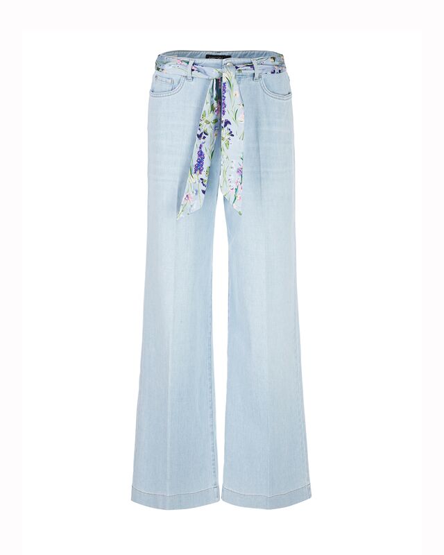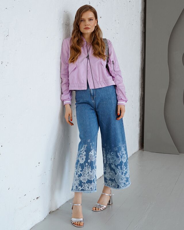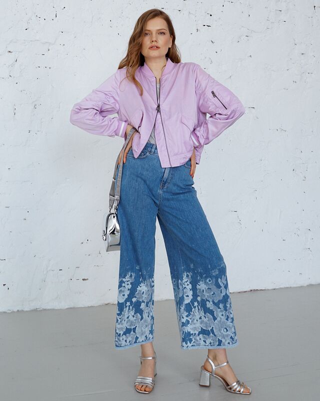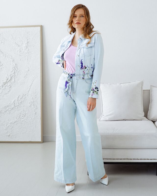 В сезоне весна-лето 2024 все еще актуальны широкие брюки/джинсы. Например, голубые джинсы с акварельным цветочным принтом будут отлично сочетаться как с классическими жакетами и лоферами, так и со свободными пуловерами и кедами.