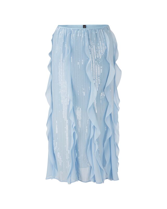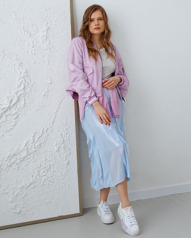В стиле юбок новой коллекции преобладает весенняя воздушность. Голубая юбка длины миди выполнена из легкой, почти невесомой ткани и отлично дополнит летящие женственные образы.