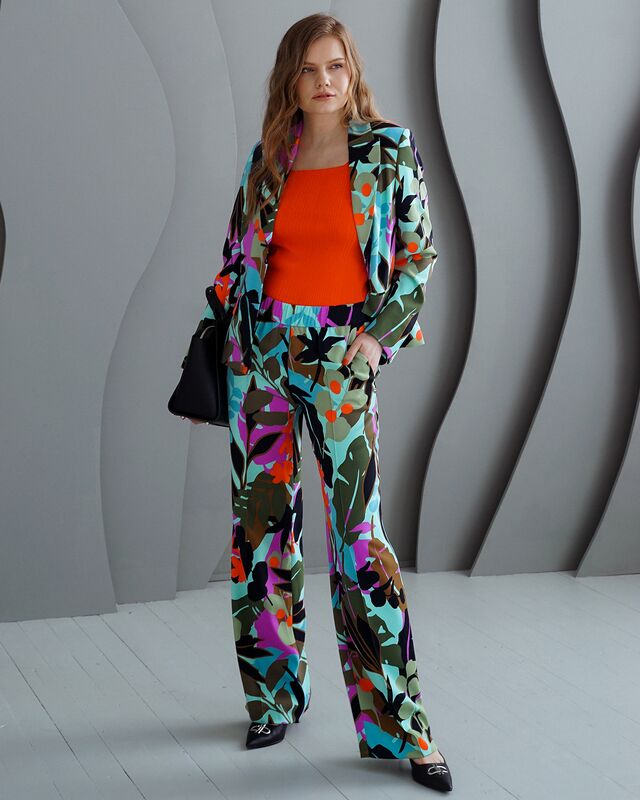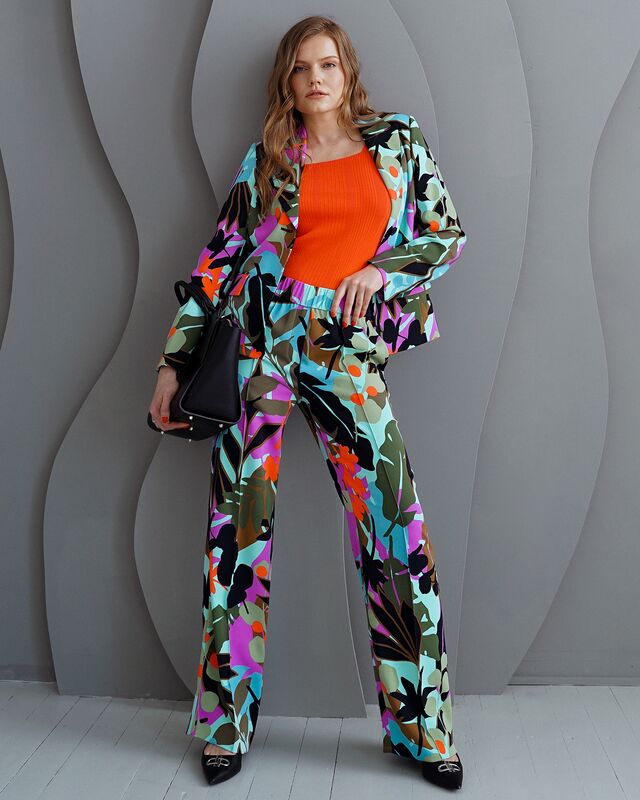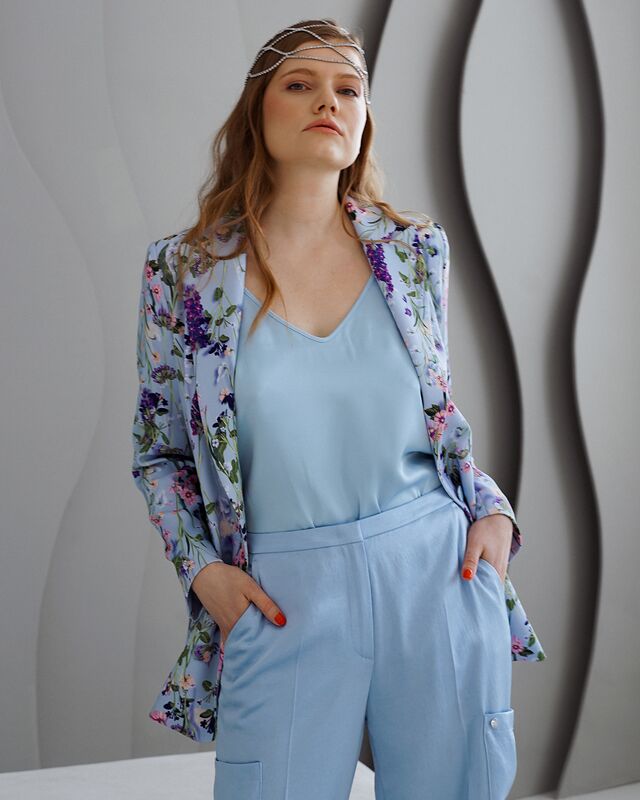 Голубые брюки с красочным цветочным принтом станут изящным акцентом и в сдержанном, и в расслабленном повседневном образе.