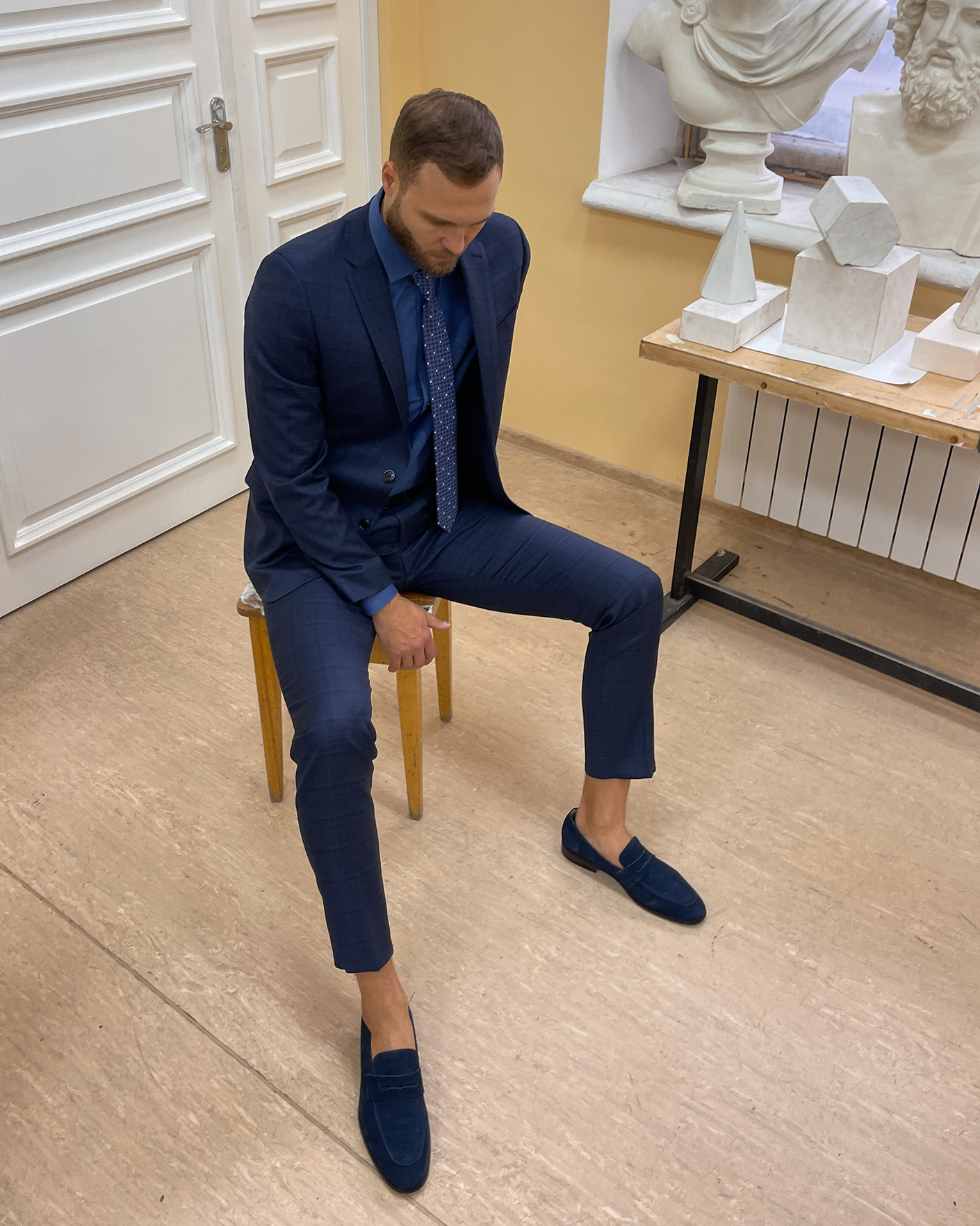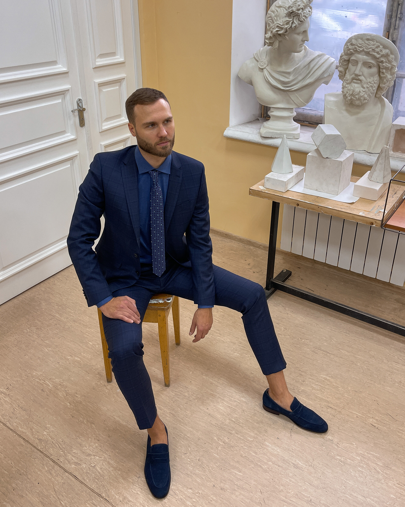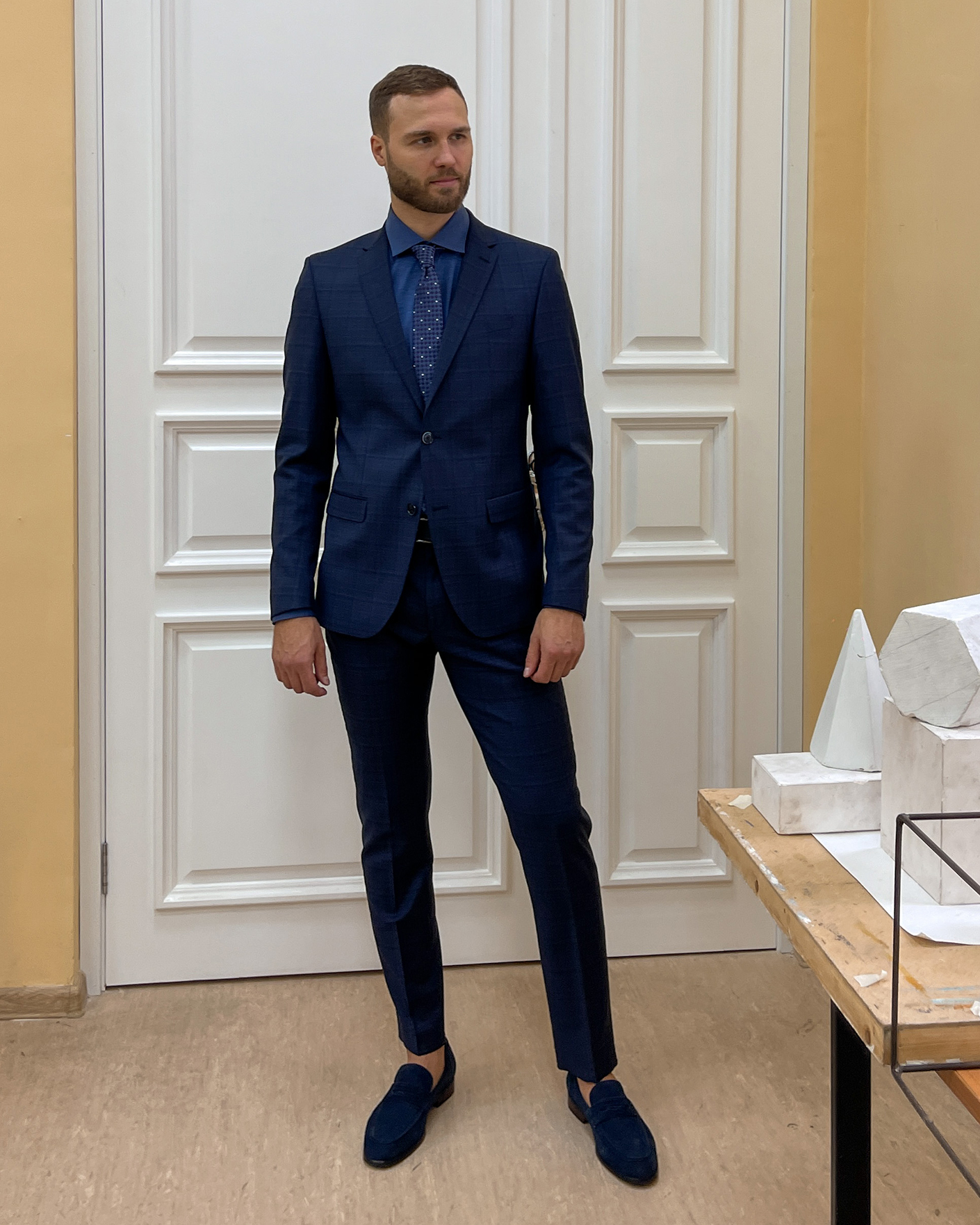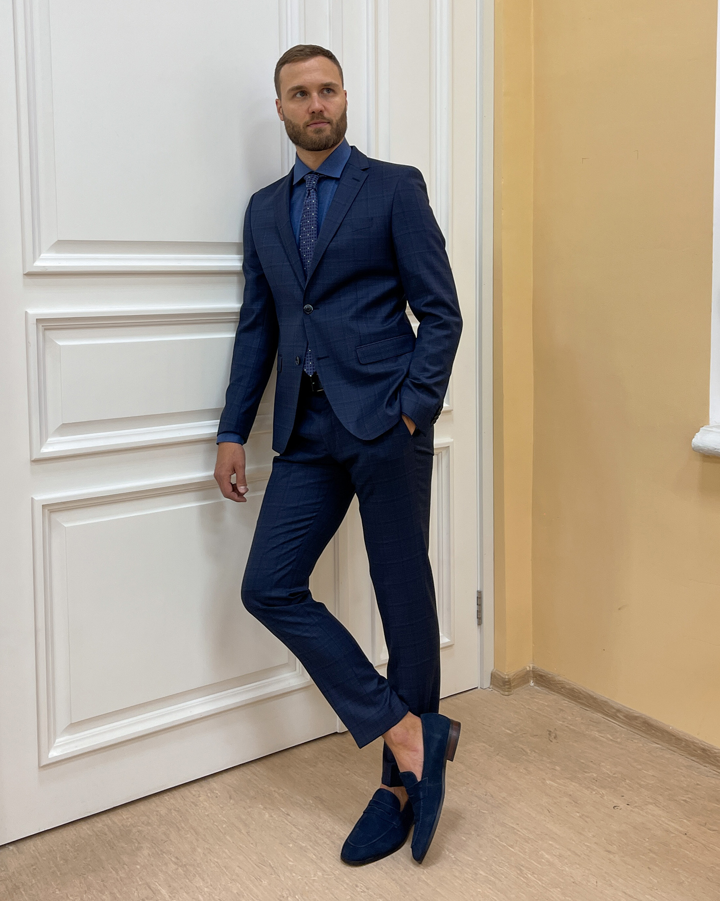 Элегантный образ Digel для работы в офсие или на вечернее мероприятие состоит из шерстяного пиджака и зауженных брюк фиолетово-синего цветов в оптическую клетку, из повседневной темно-синей рубашки из высококачественного хлопка и шелкового гарлстука с принтом.