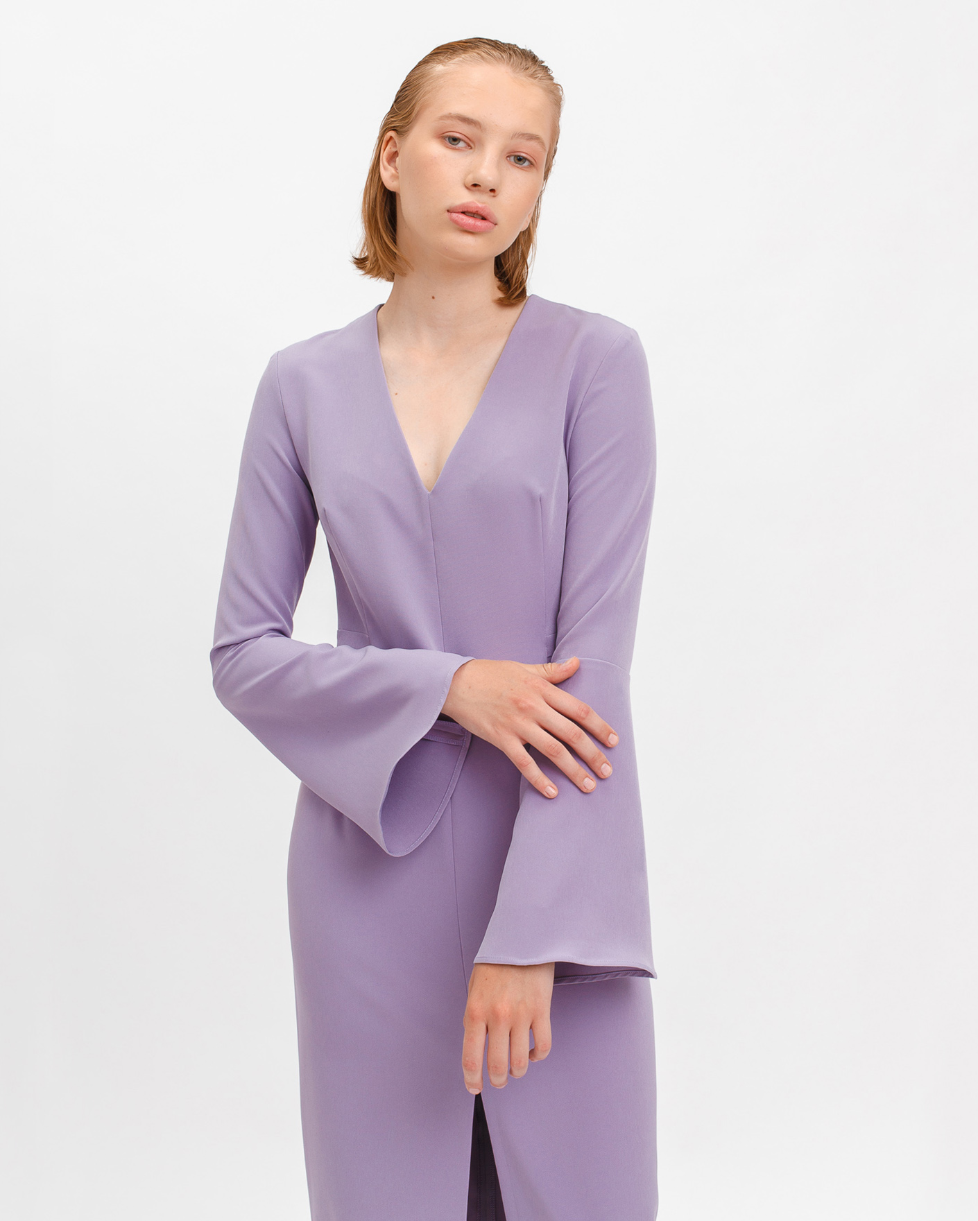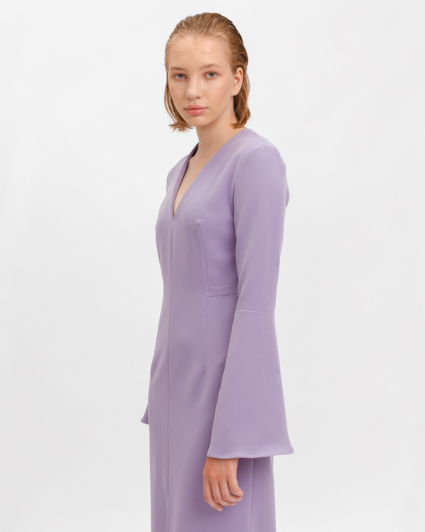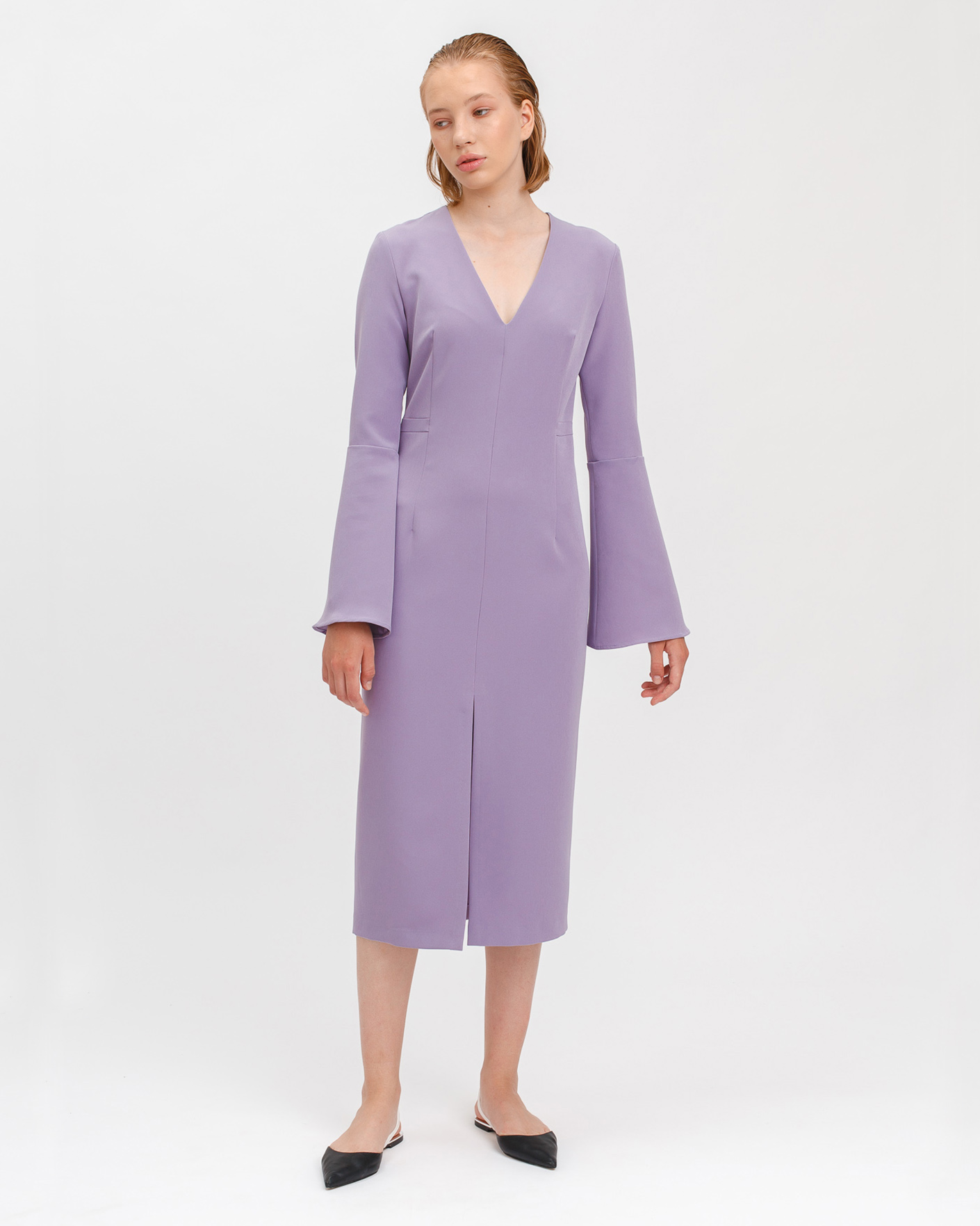 Элегантный образ на вечернее мероприятие состоит из платья-футляр сиреневого цвета с V-образным вырезом и расклешенными рукавами. Образ можно завершить яркими аксессуарами и обувью как на каблуке, так и на плоском ходу.