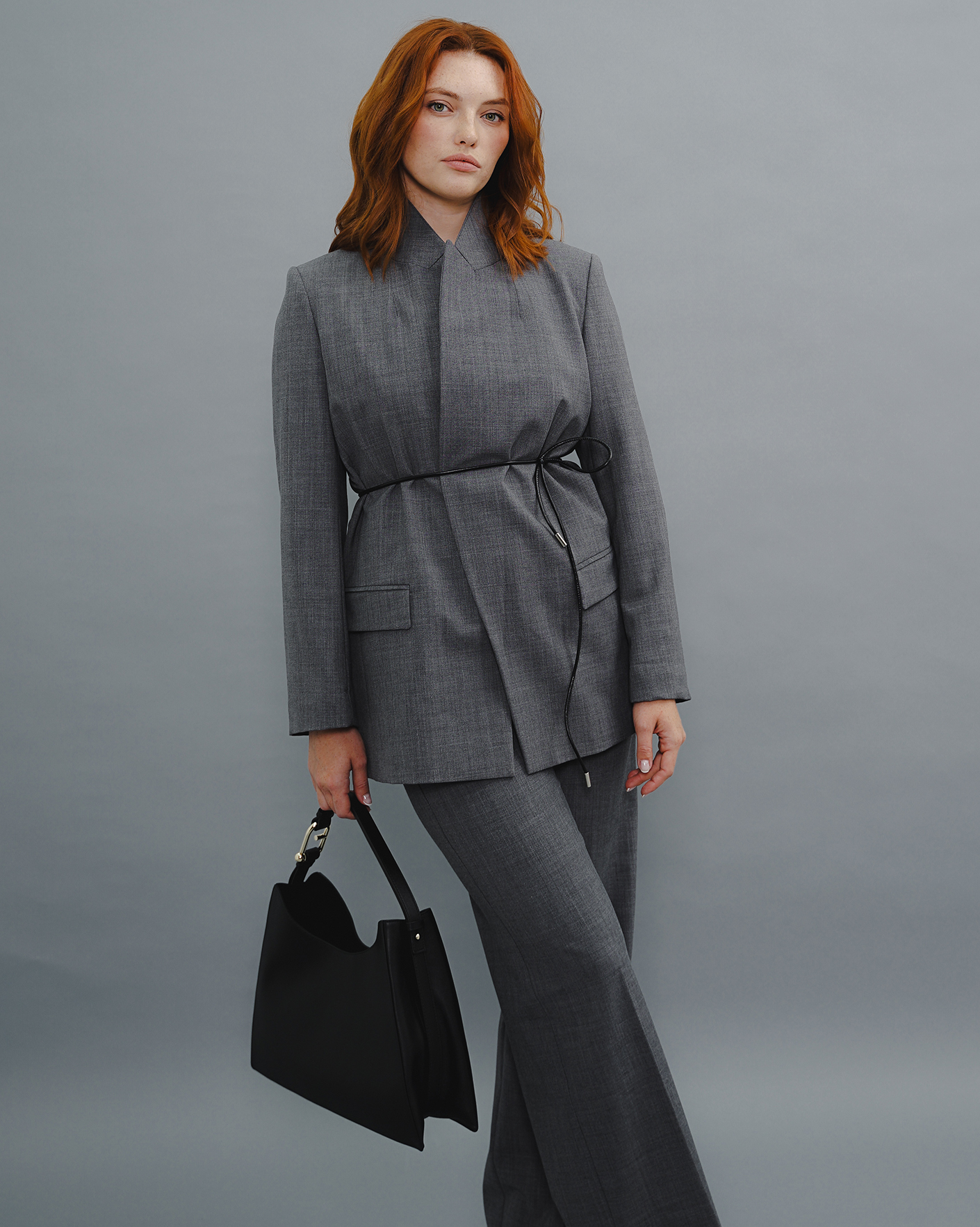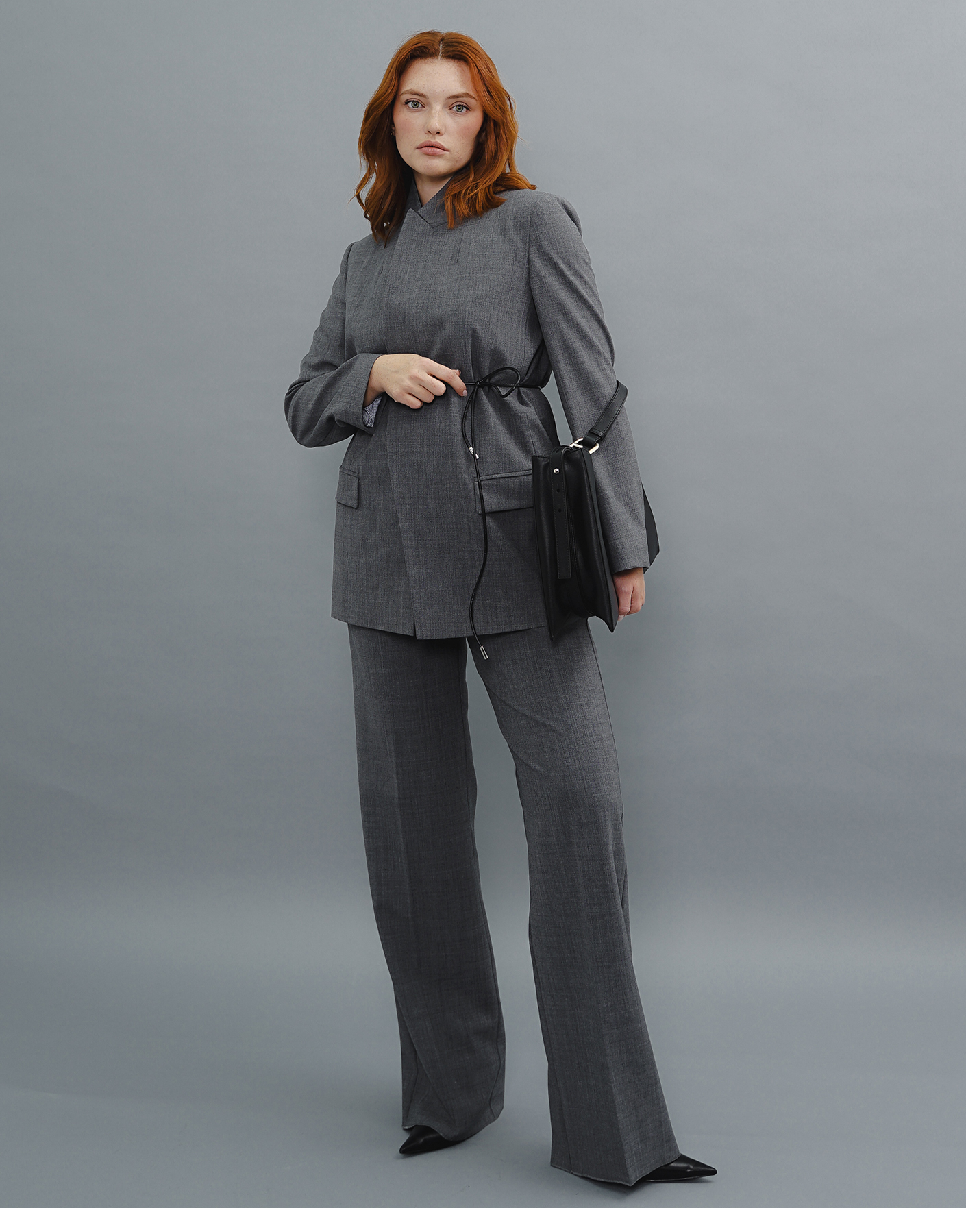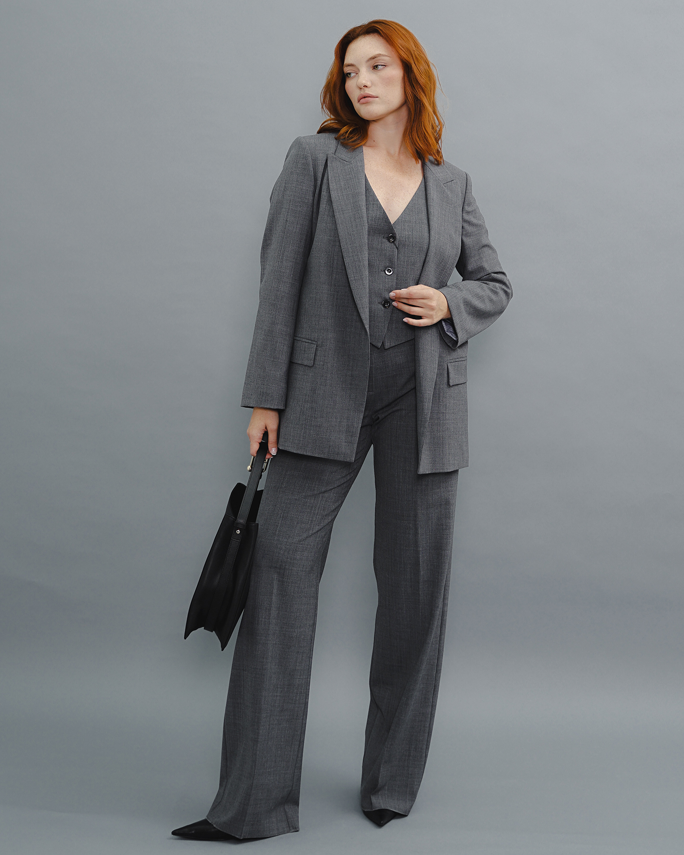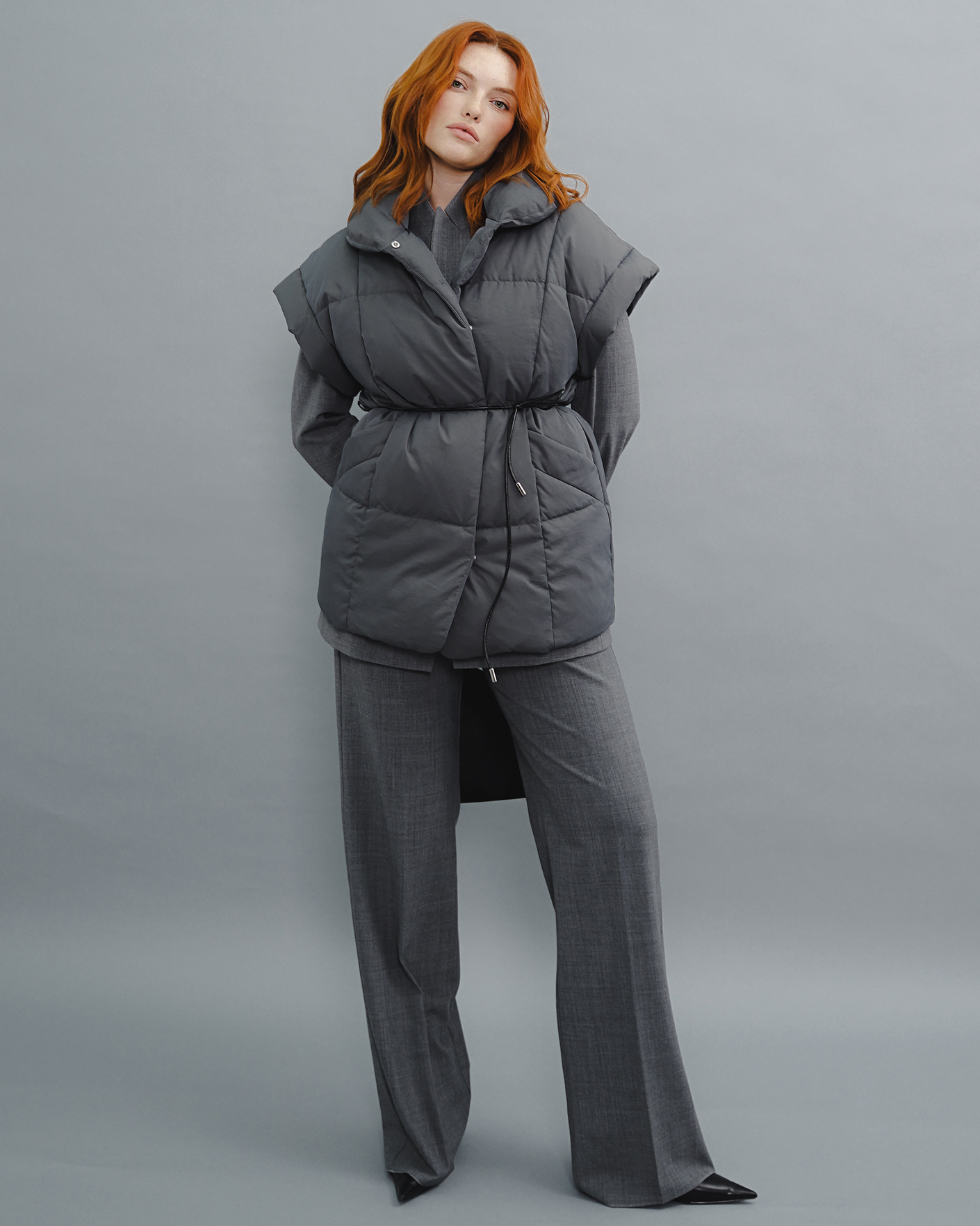 Идеальный деловой образ на каждый день от Marella состоит из объемного стеганого жилета в сером цвете, из серого жакета в строчный рисунок без застежки, из классического жилета с V-образным вырезом, также из брюк прямого кроя серого цвета в строчный рисунок.