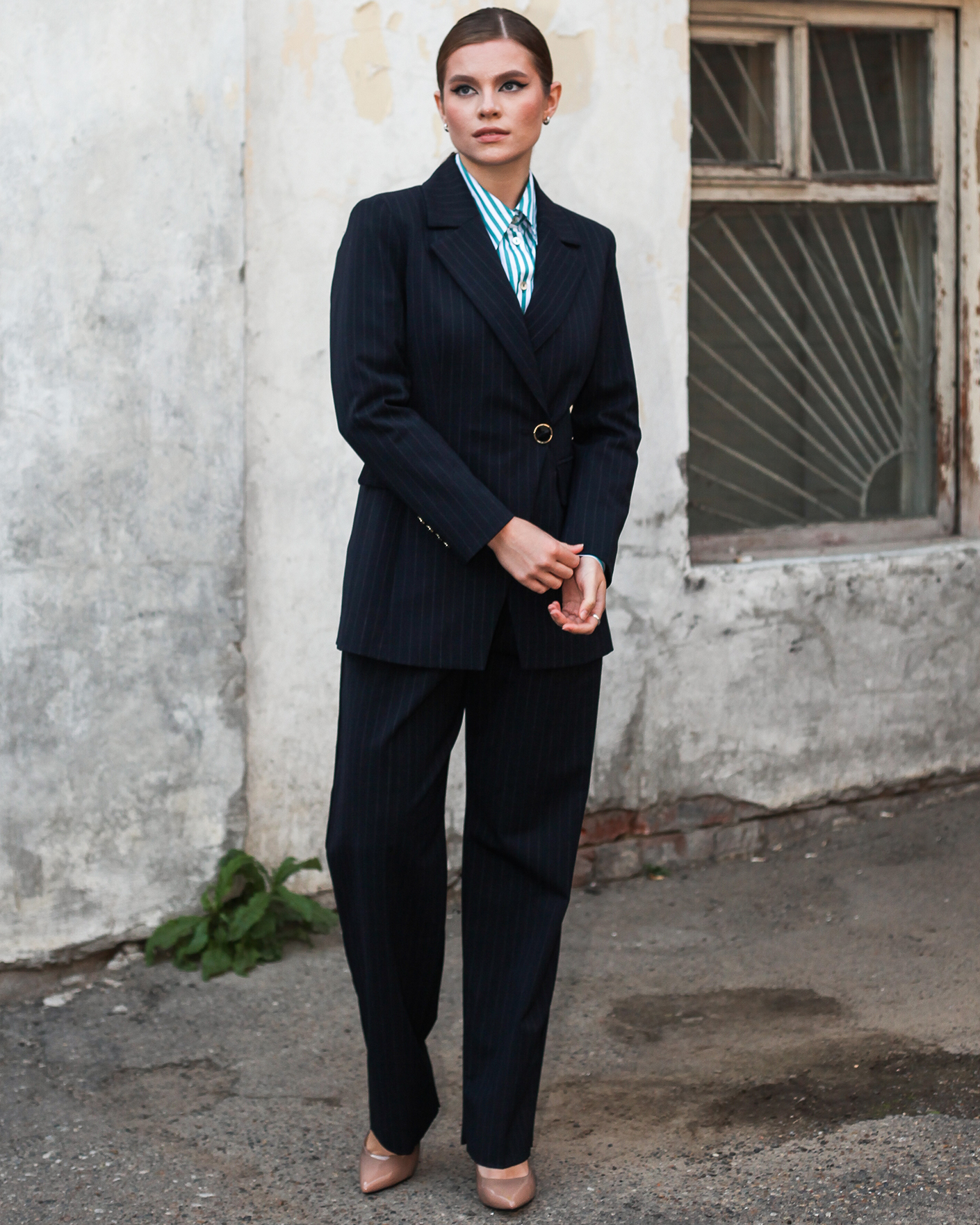 Идеальный деловой образ от Marella состоит из приталенного жакета темно-синего цвета в узкую вертикальную полосу, из хлопковой рубашки бело-зеленого цвета в вертикальную полосу, а также из классических брюк на защипах в узкую вертикальную полосу.
