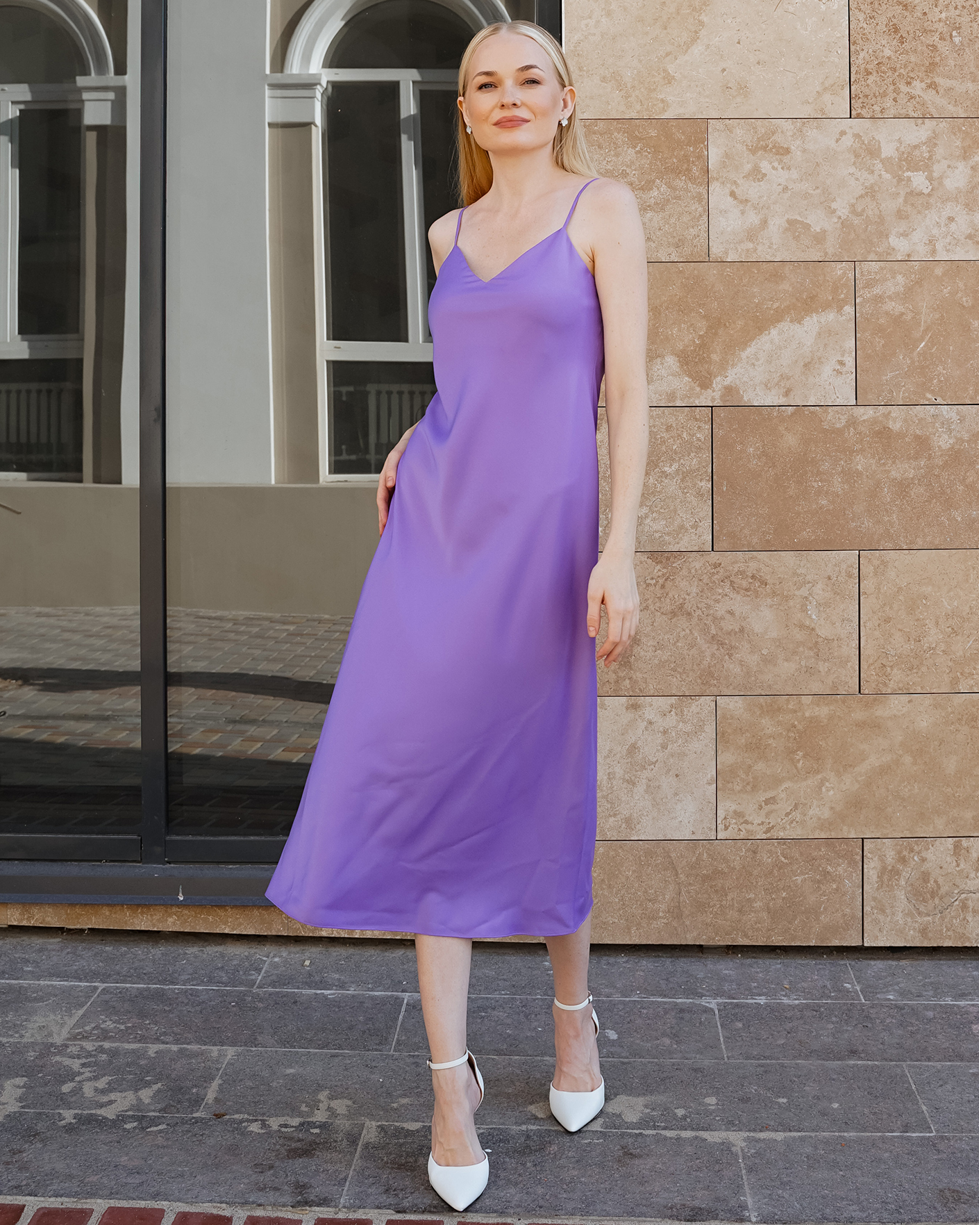 Идеальный образ Emka состоит из платья-комбинации сиреневого цвета на тонких бретелях, которое можно дополнить как свободным жакетом, так и свитером или рубашкой.