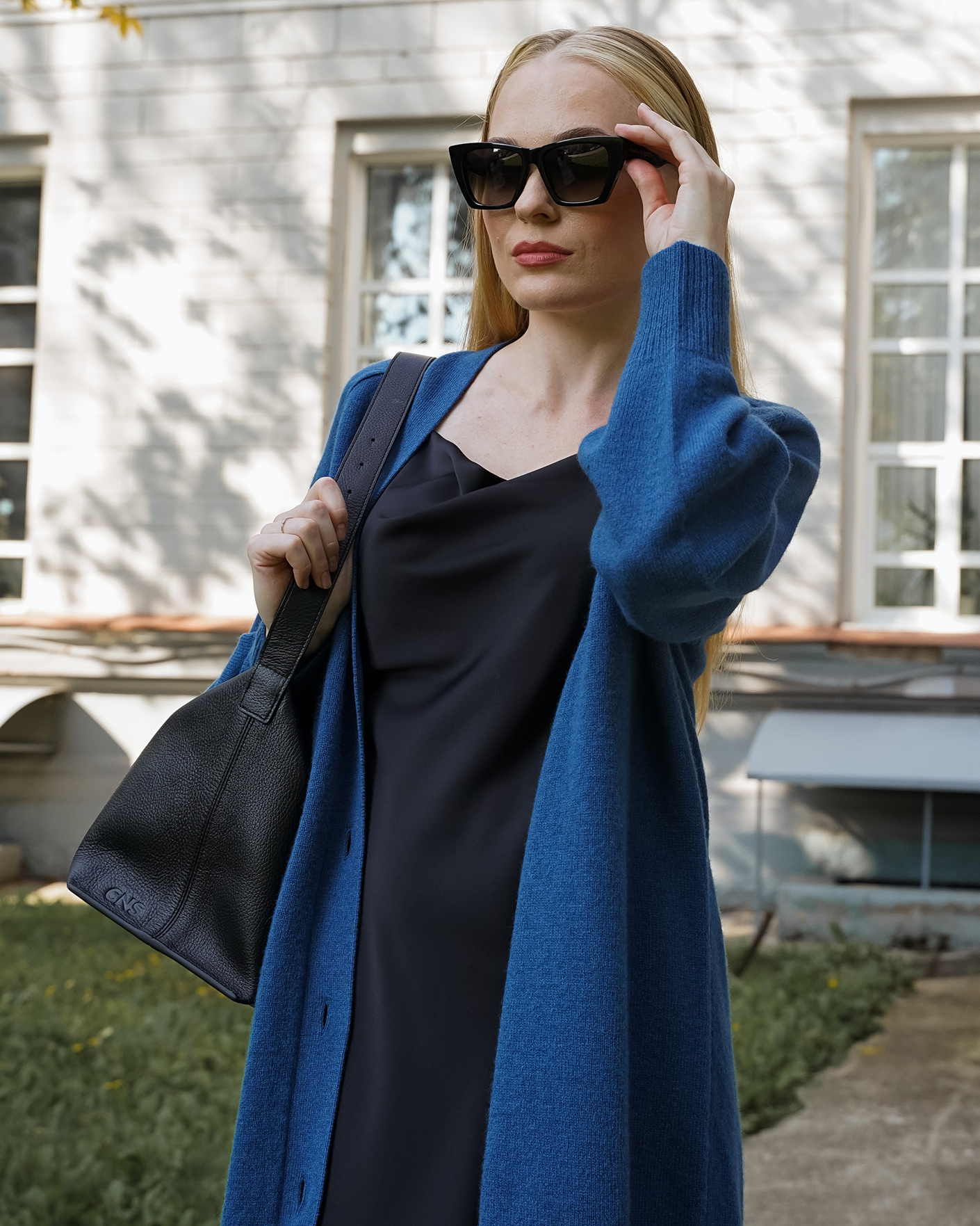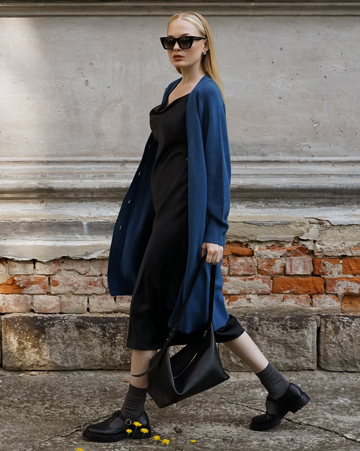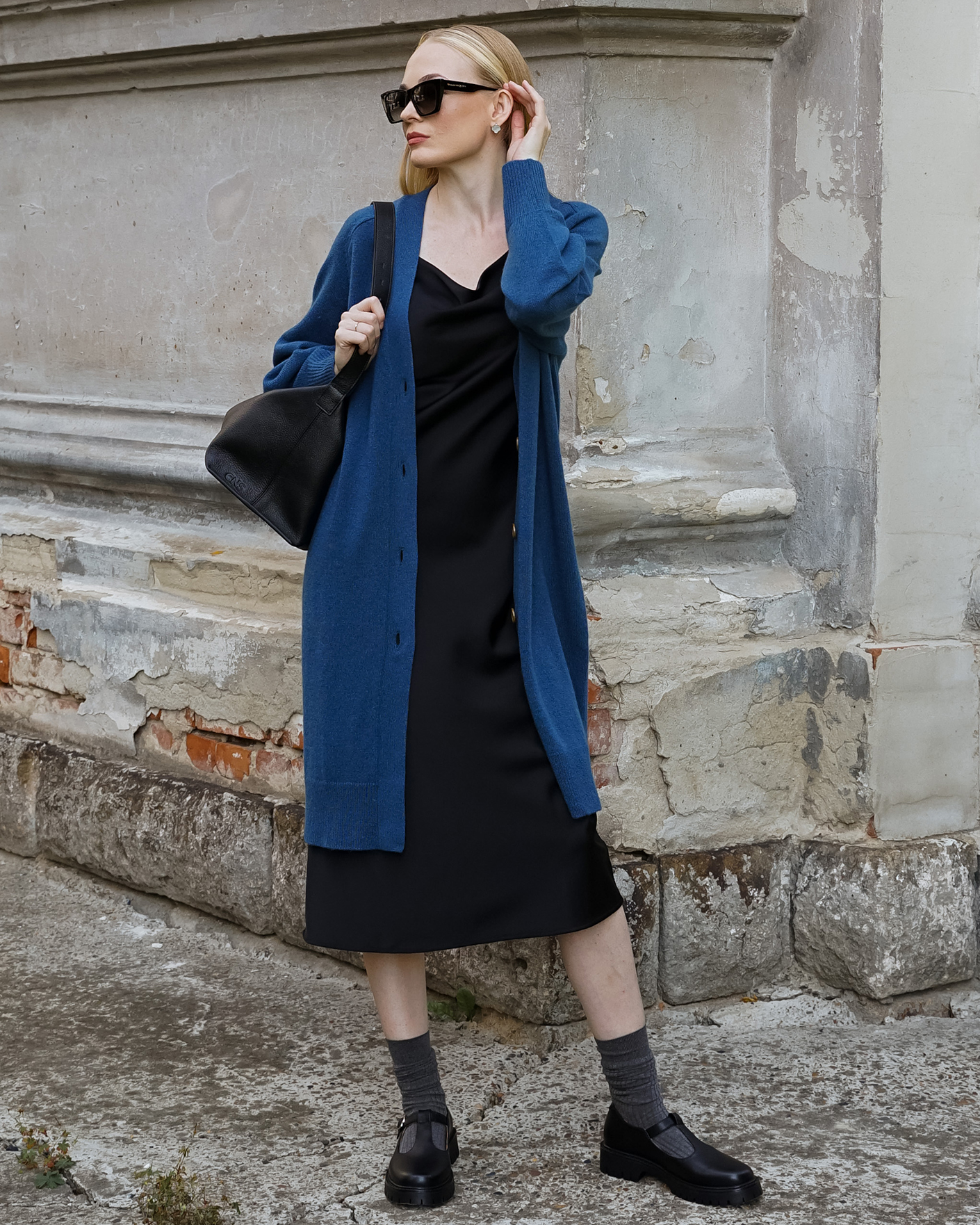 Идеальный образ на каждый день от Emka состоит из удлиненного серо-голубого кардигана на пуговицах и из классического платья-комбинации в черном цвете на тонких бретелях.