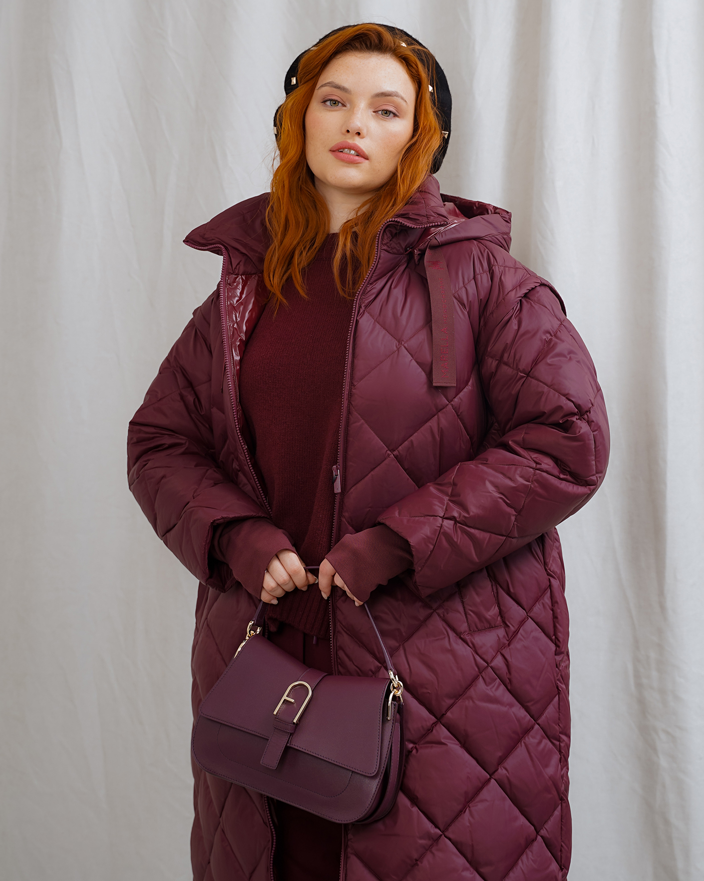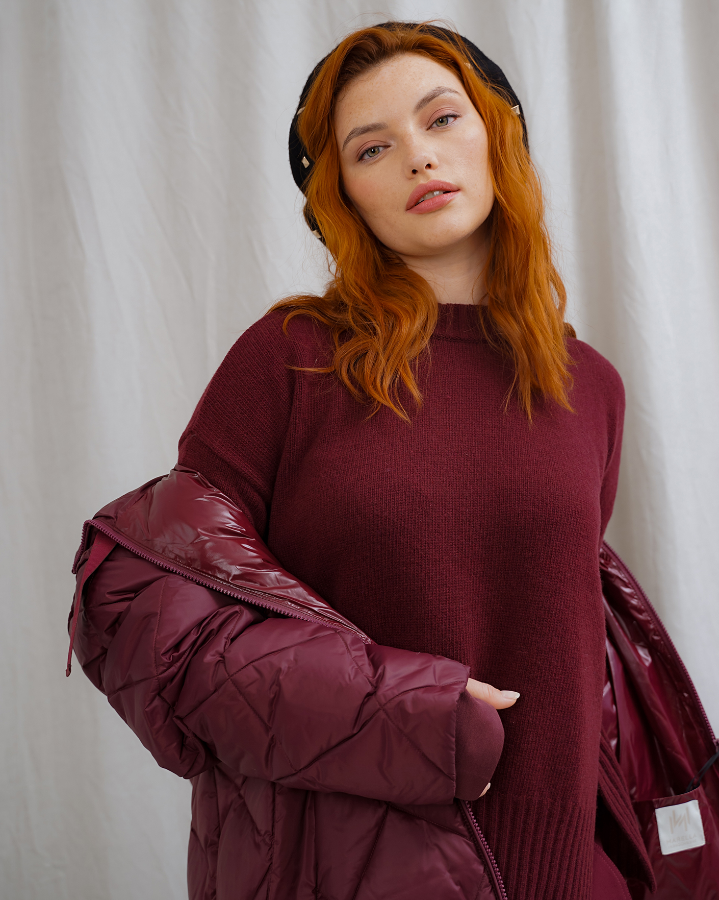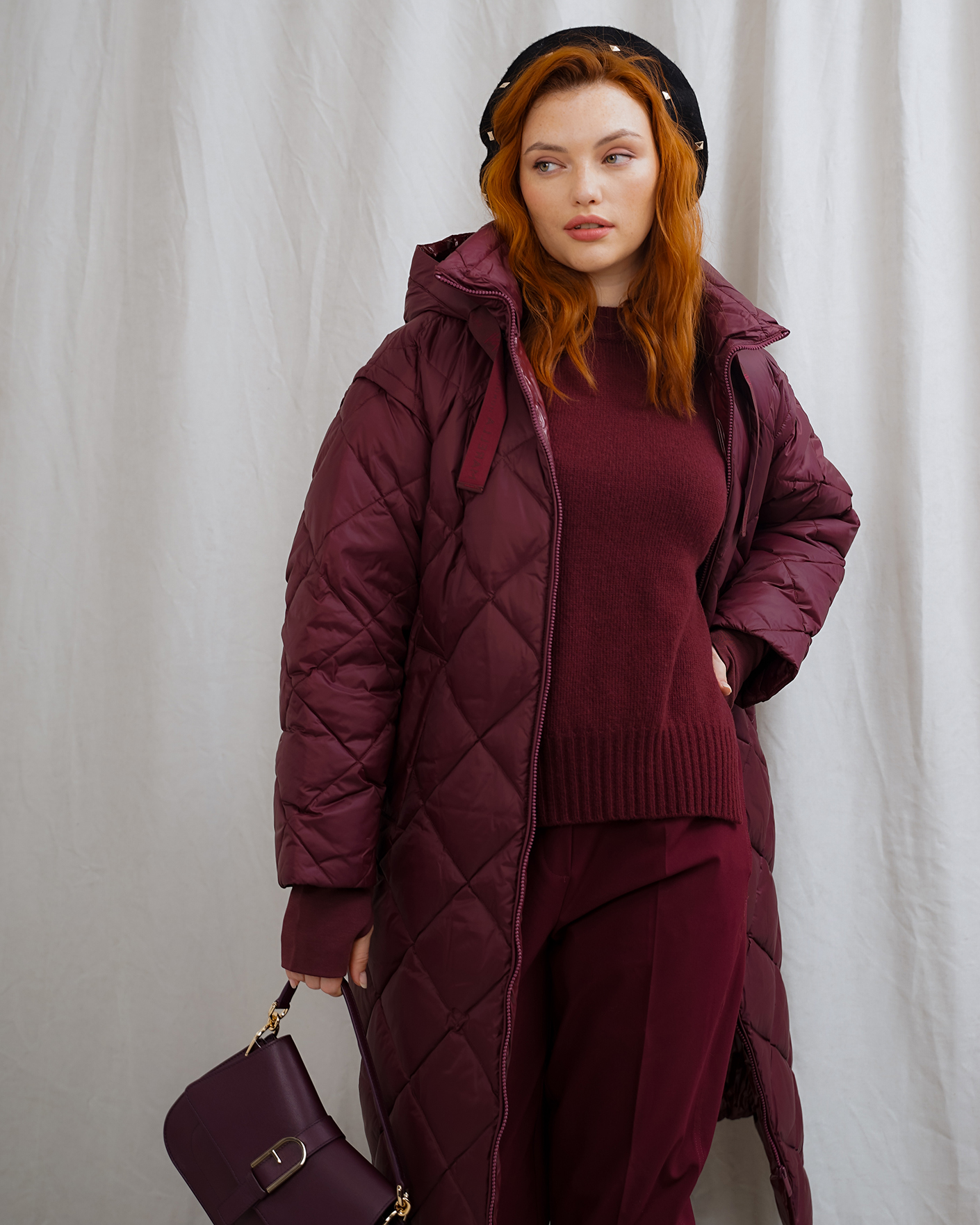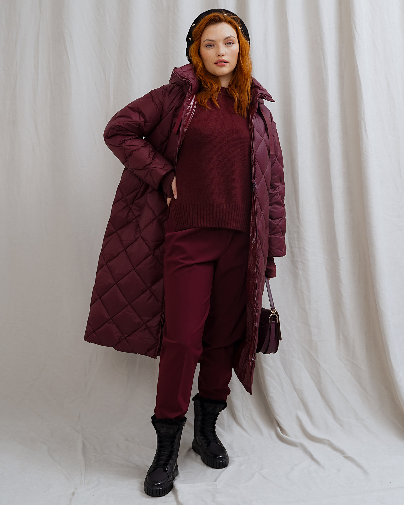 Идеальный теплый образ Marella для прогулок состоит из стеганого пальто-жилет вишневого цвета на молнии, из свободного джемпера в строчный рисунок, а также из зауженных джоггеров на эластичном поясе со вставным шнурком.