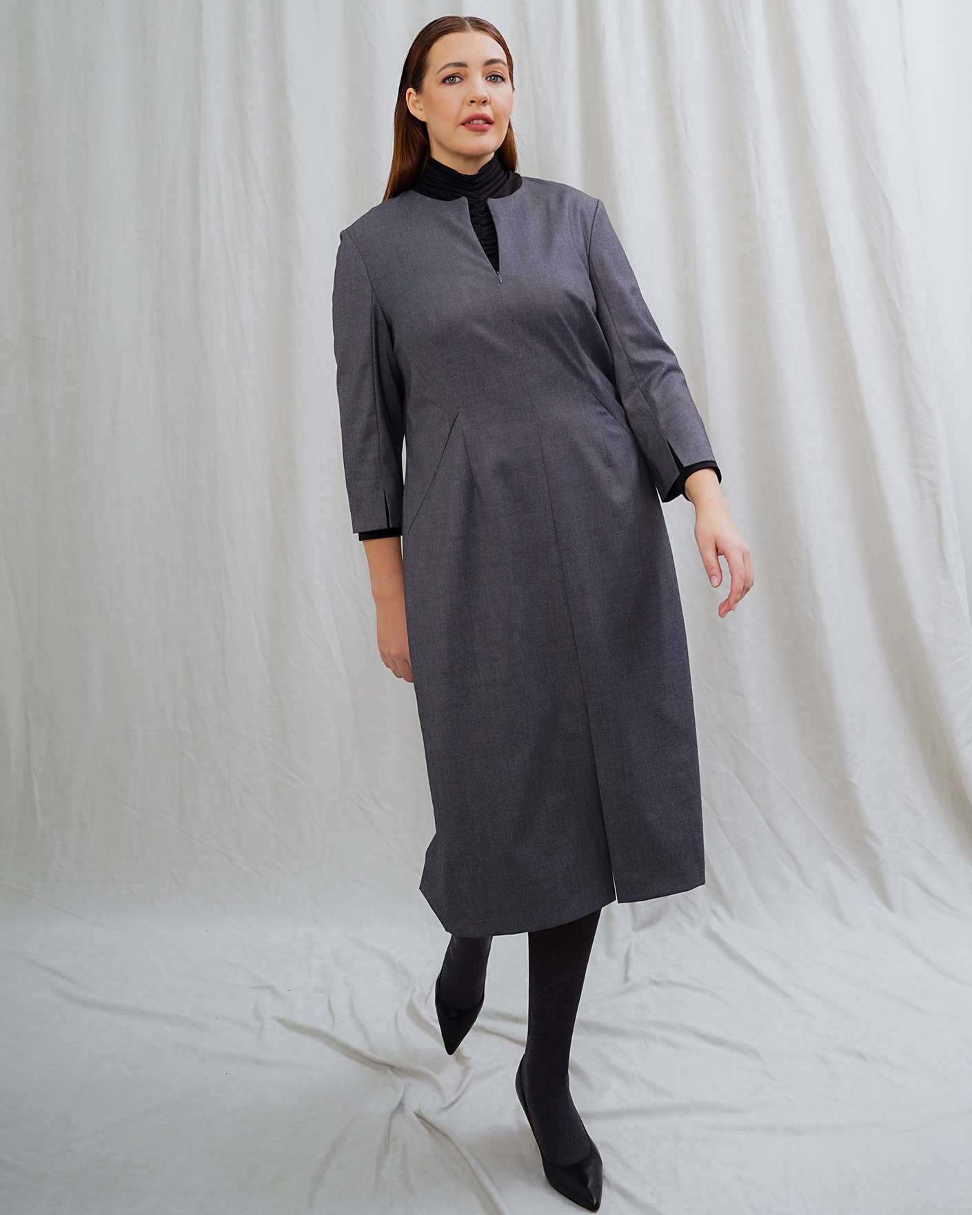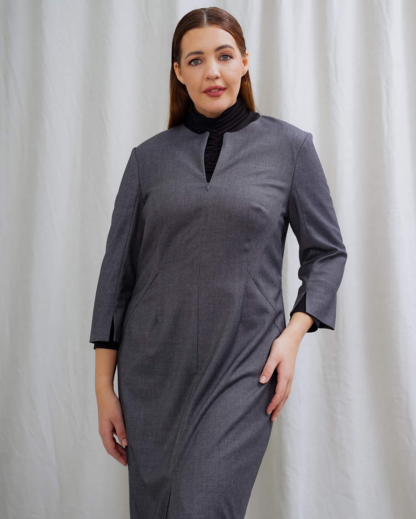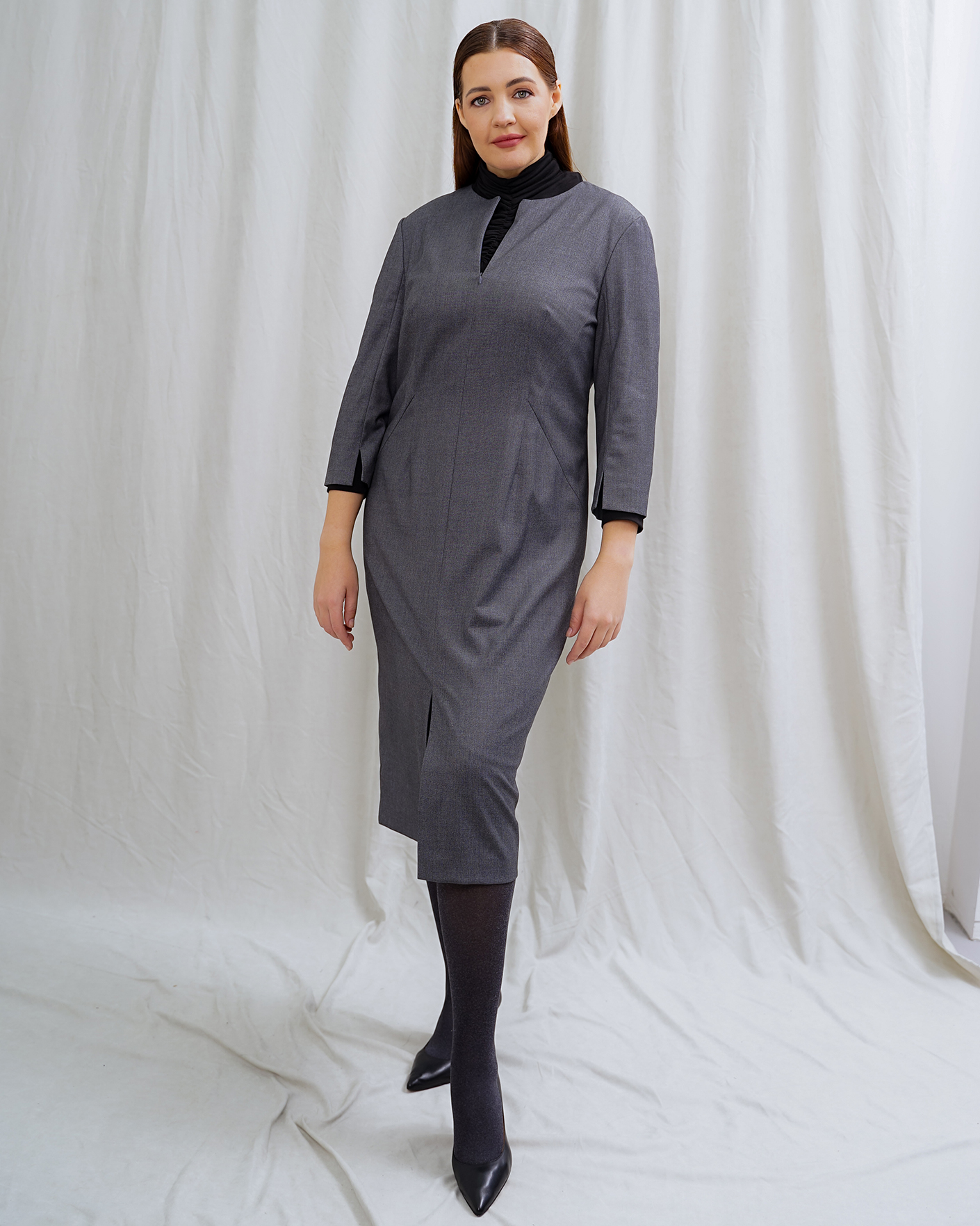 Классический образ для работы в офисе состоит из серого платья-футляр с разрезом по центру и из черной водолазки с аккуратной сборкой по центру.