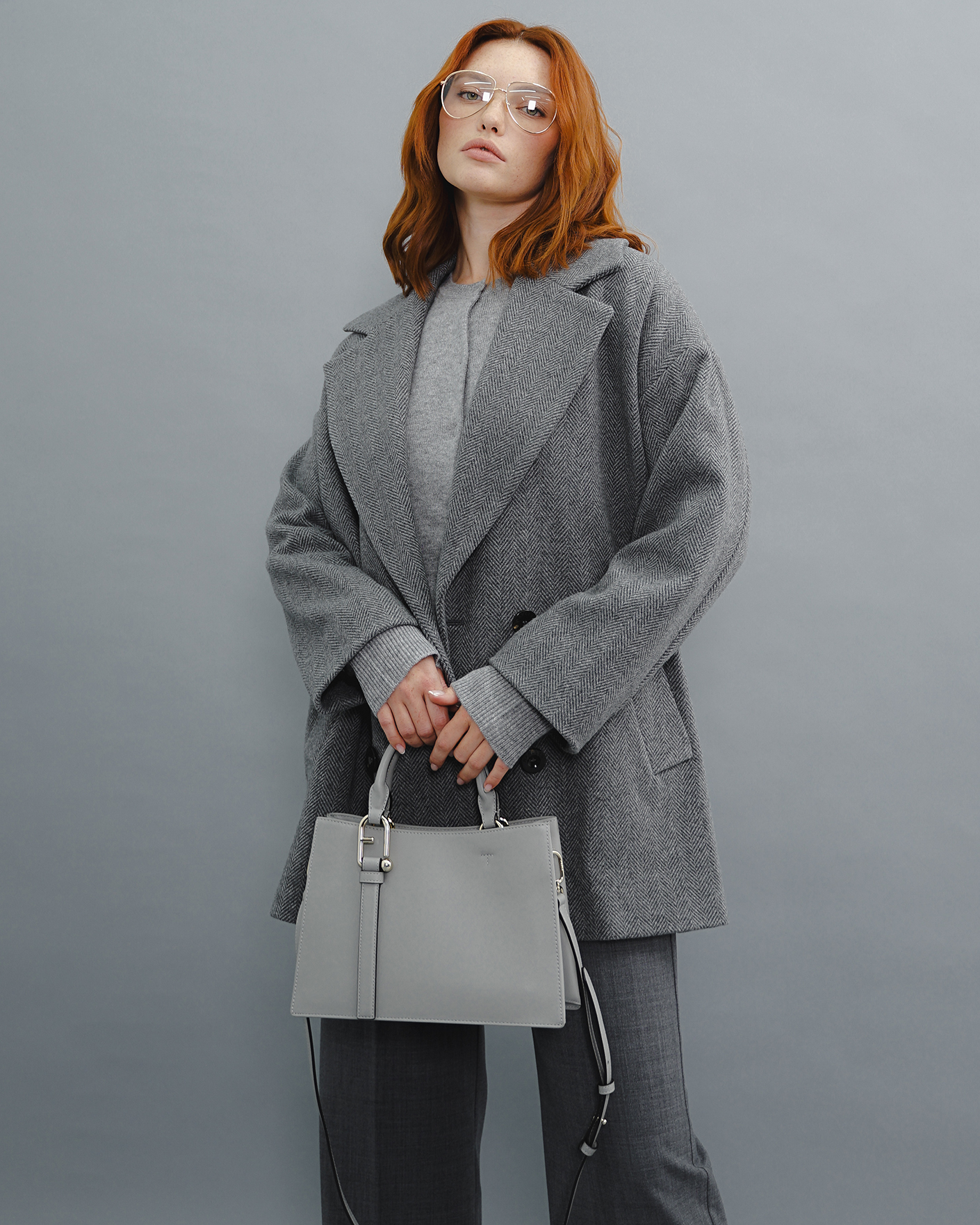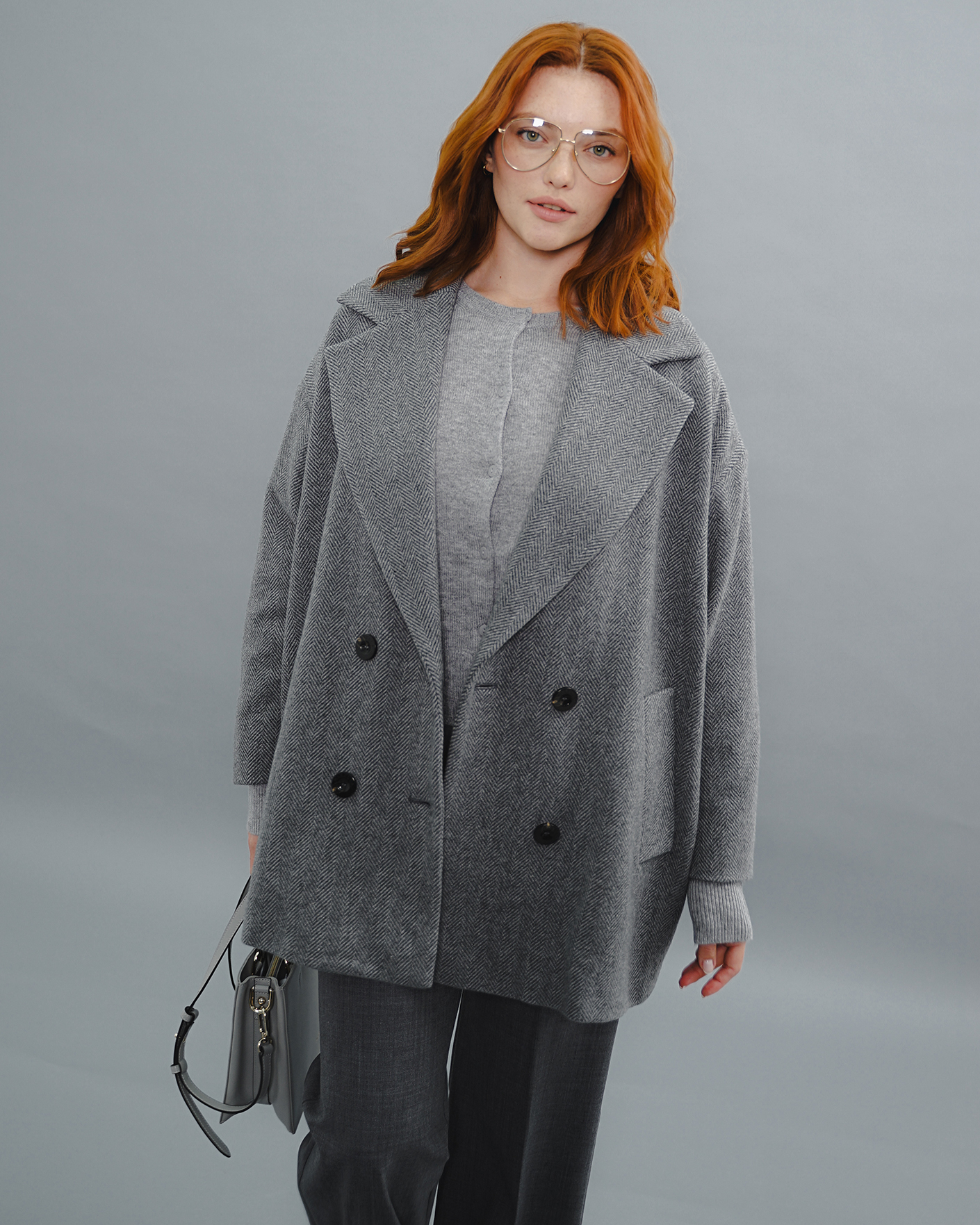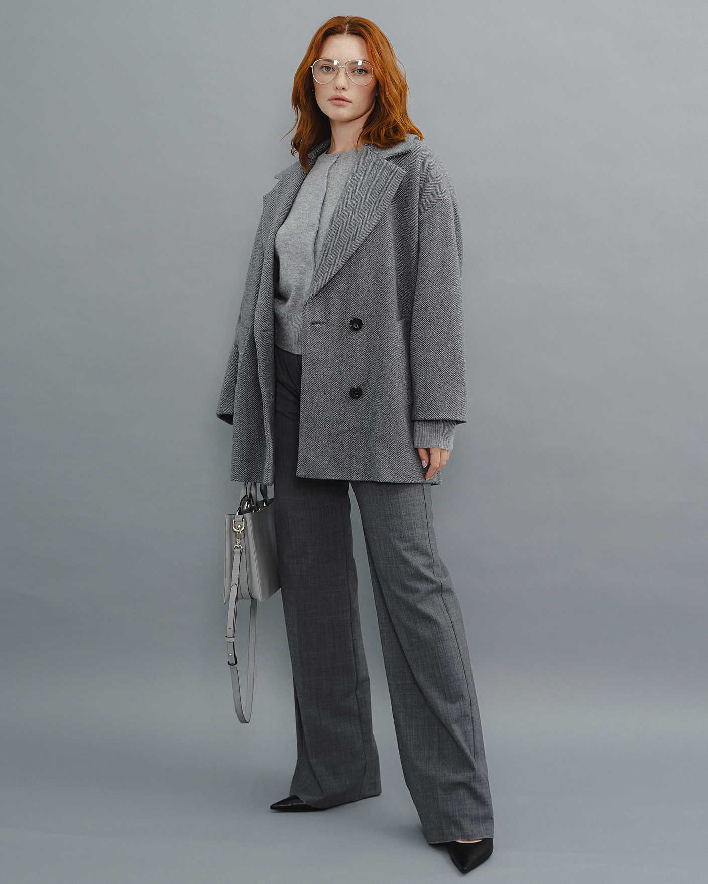 Классический образ для работы в офисе состоит из шерстяного полупальто бело-черного цвета в рисунок елочка, из серого кардигана с застежкой на пуговицы, а также из брюк прямого кроя в строчный рисунок.