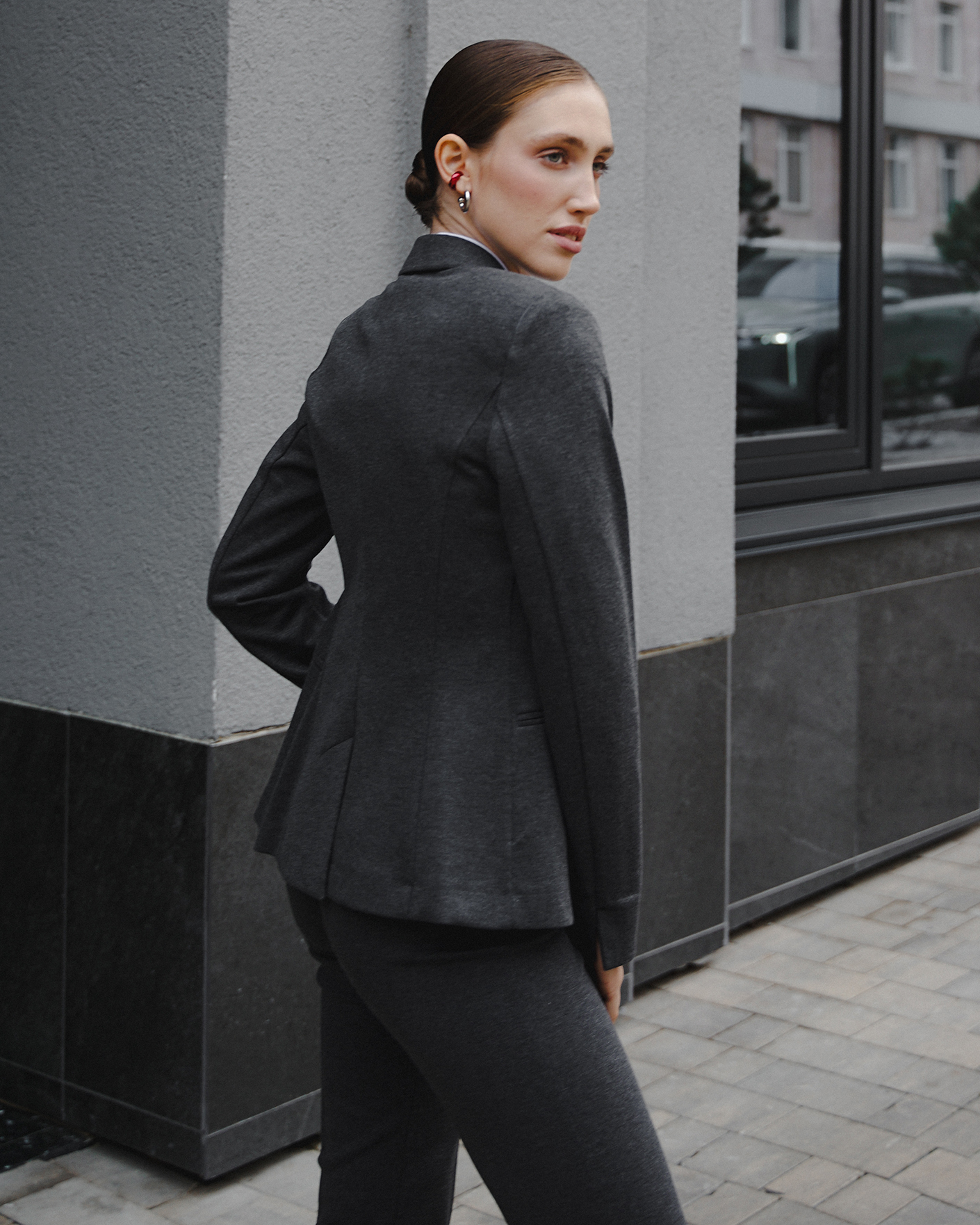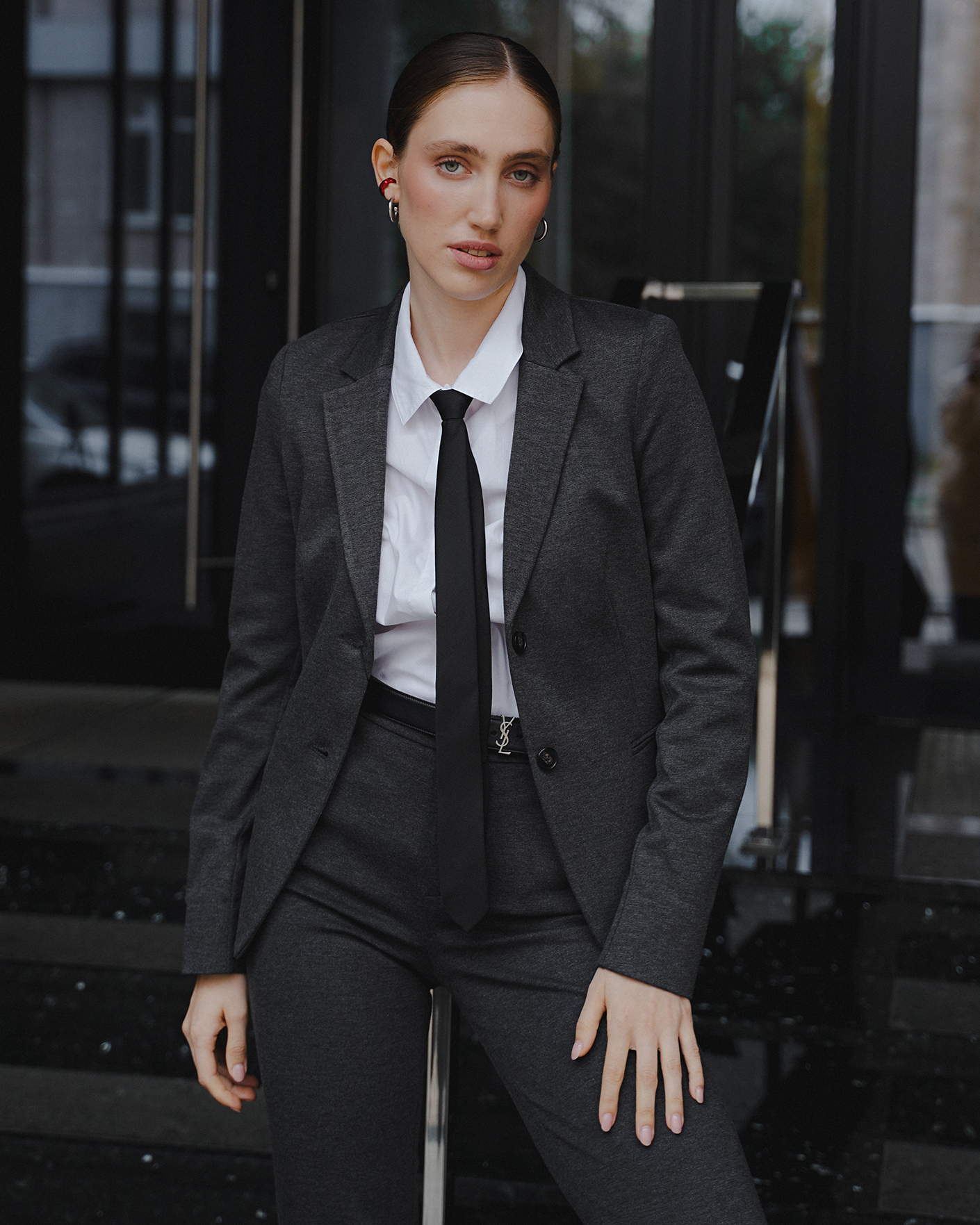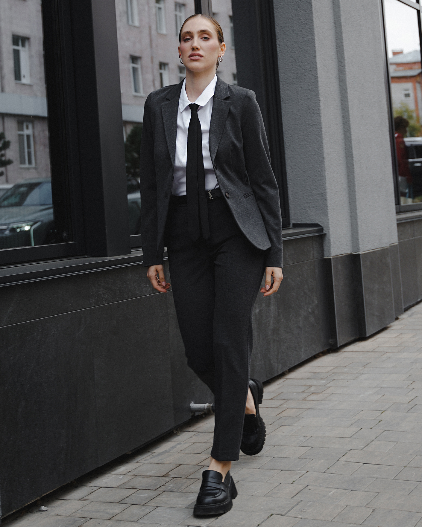 Классический образ для деловых встреч состоит из жакета серого цвета в строчный рисунок, из базовой хлопковой рубашки белого цвета, а также из зауженных брюк серого цвета в строчный рисунок.