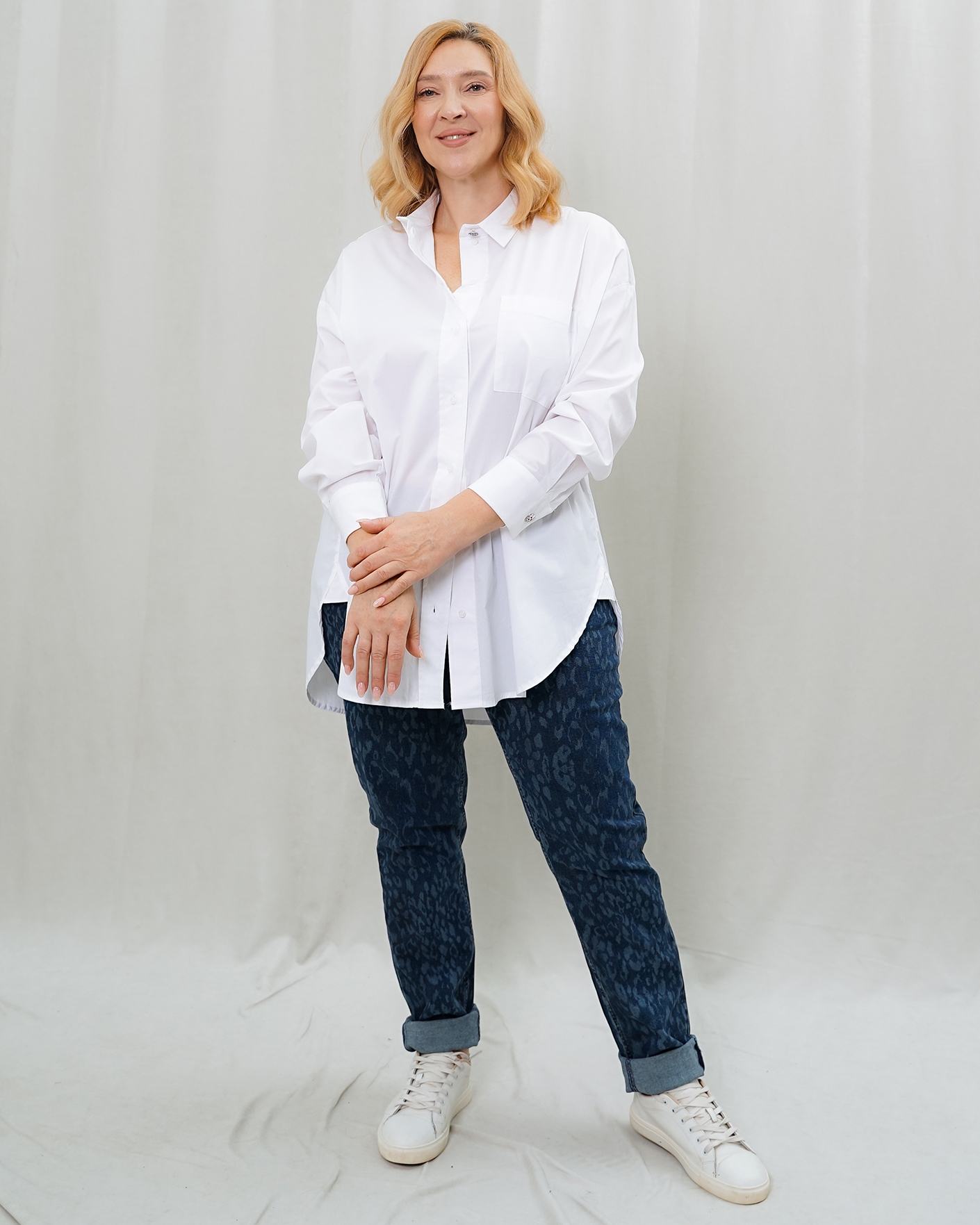 Комфортный образ на каждый день и для прогулок состоит из двусторонней куртки серо-бежевого цвета в геометрическую стежку, из хлопковой рубашки белого цвета, также из хлопковых джинс slim сине-голубого цвета в леопардовый принт.