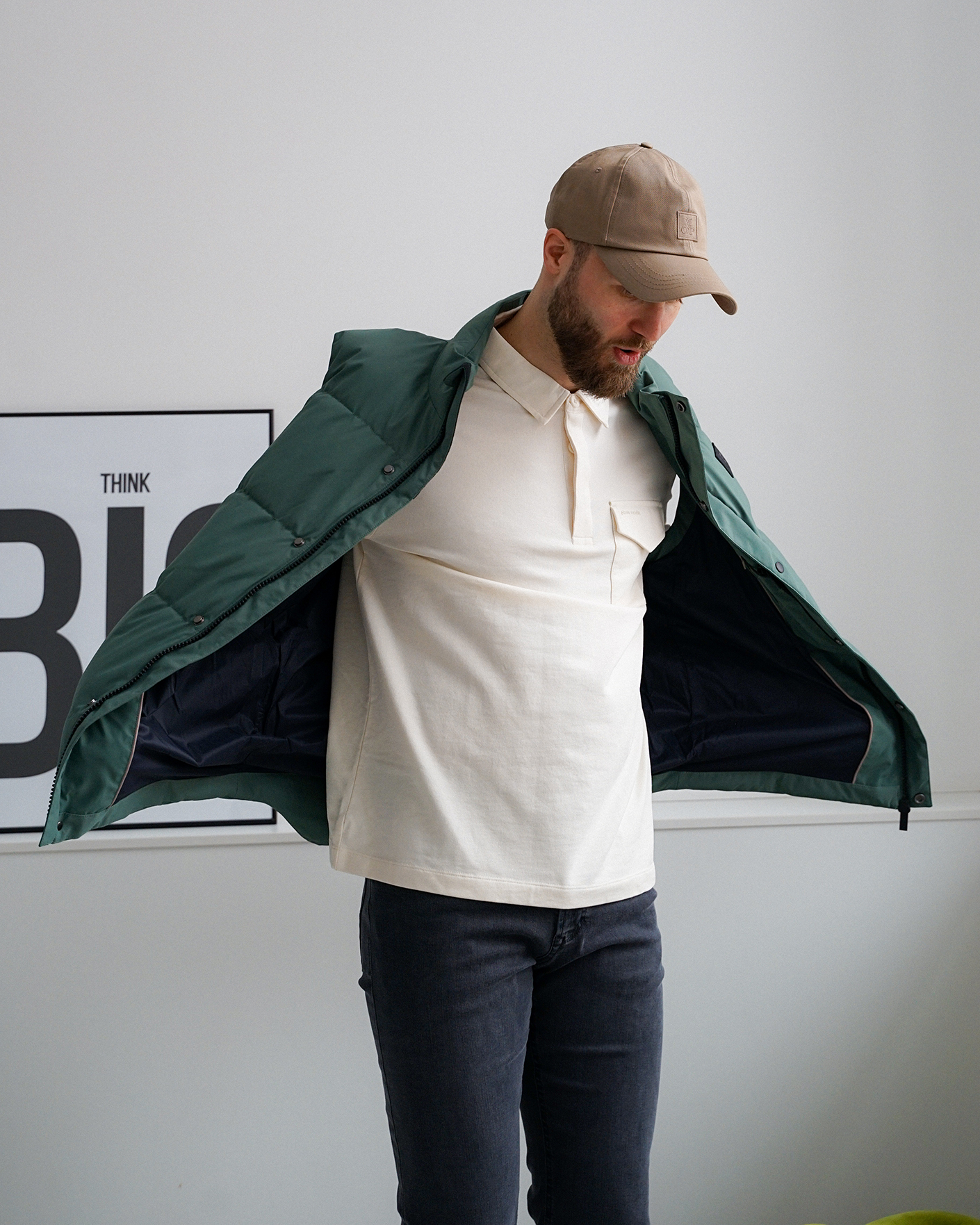 Комфортный образ на каждый день состоит из стеганого жилета в фисташковом цвете, из хлопковой толстовки-поло кремового цвета в строчный рисунок, а также из базовых джинс серого цвета.