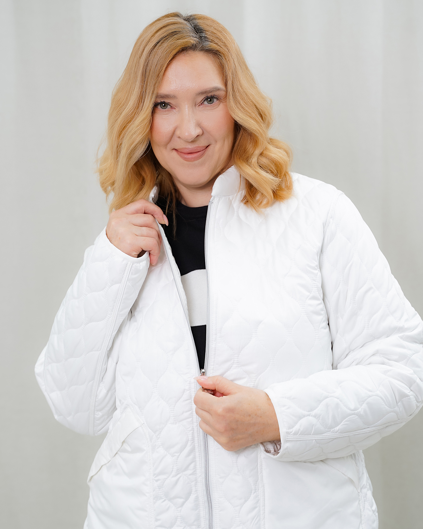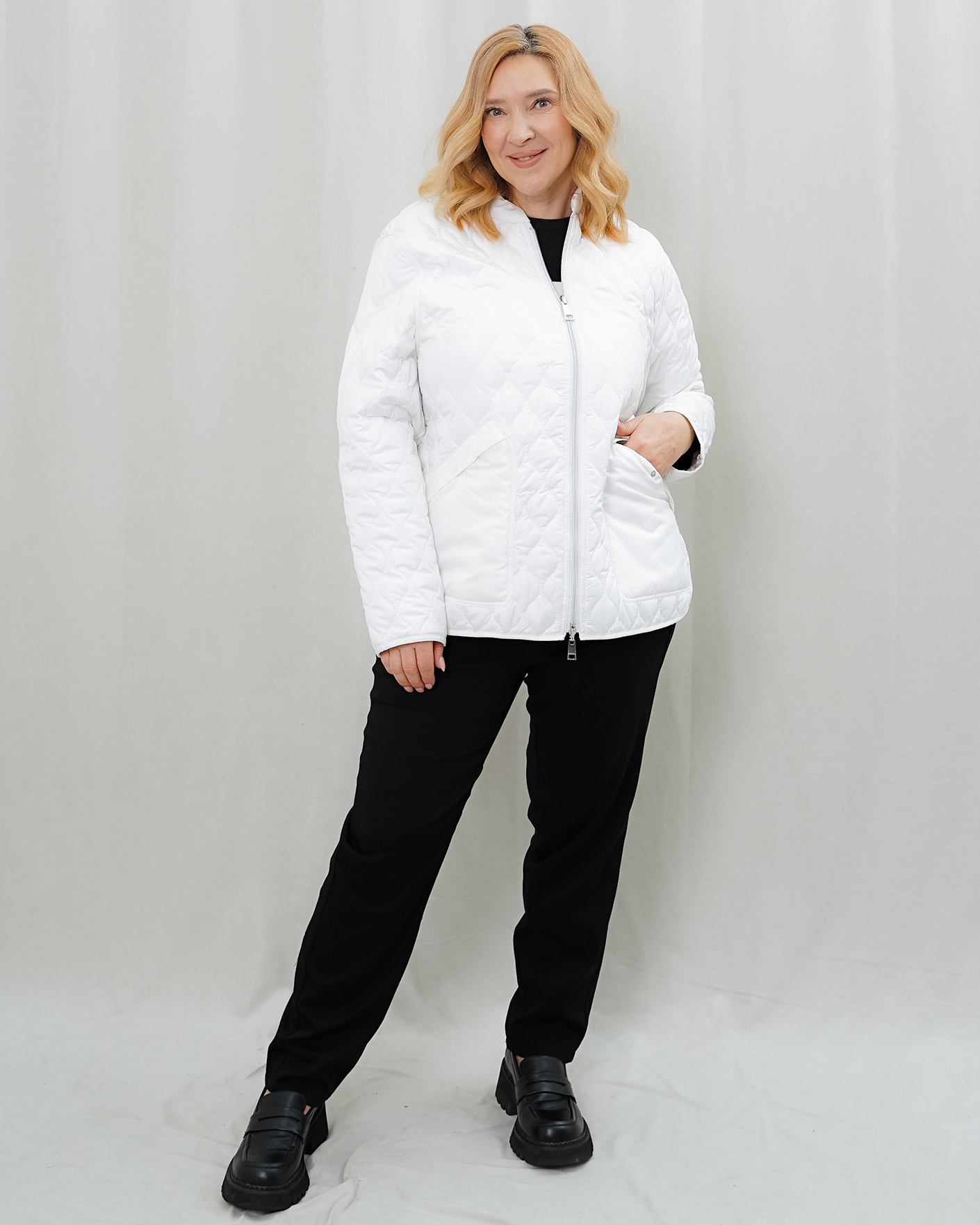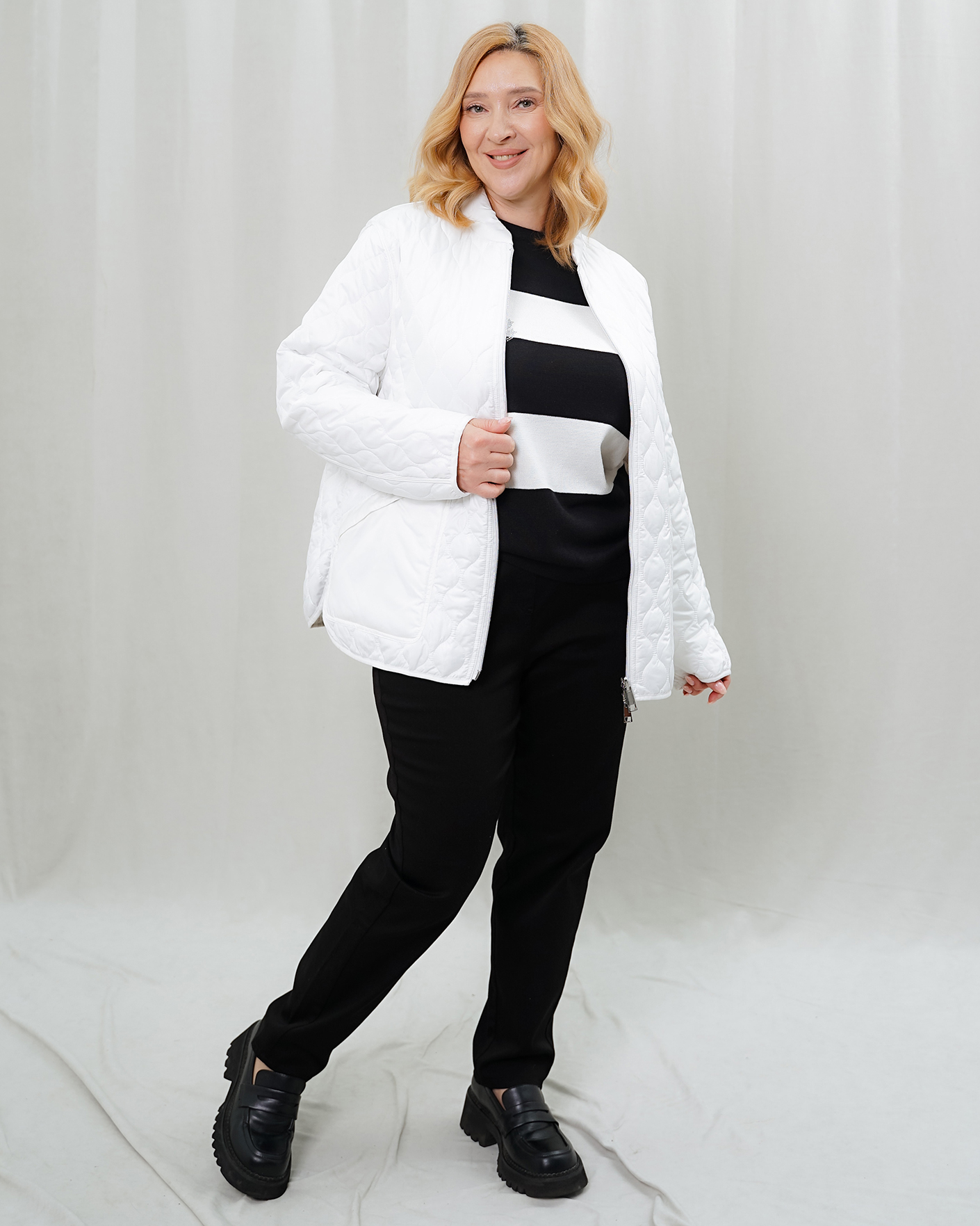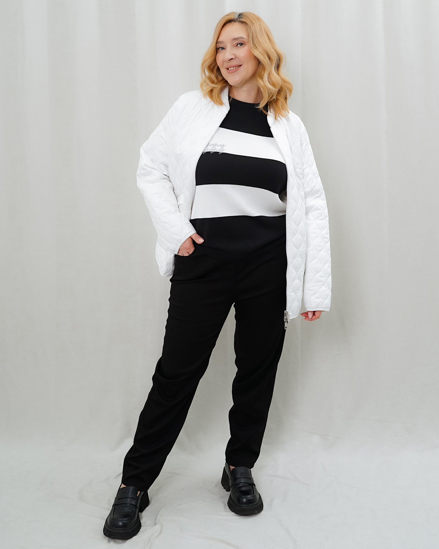 Комфортный повседневный образ и для прогулок состоит из стеганой куртки белого цвета на молнии, из полуприталенного джемпера бело-черного цвета в горизонтальную полосу, также из хлопковвых джеггинсов черного цвета.