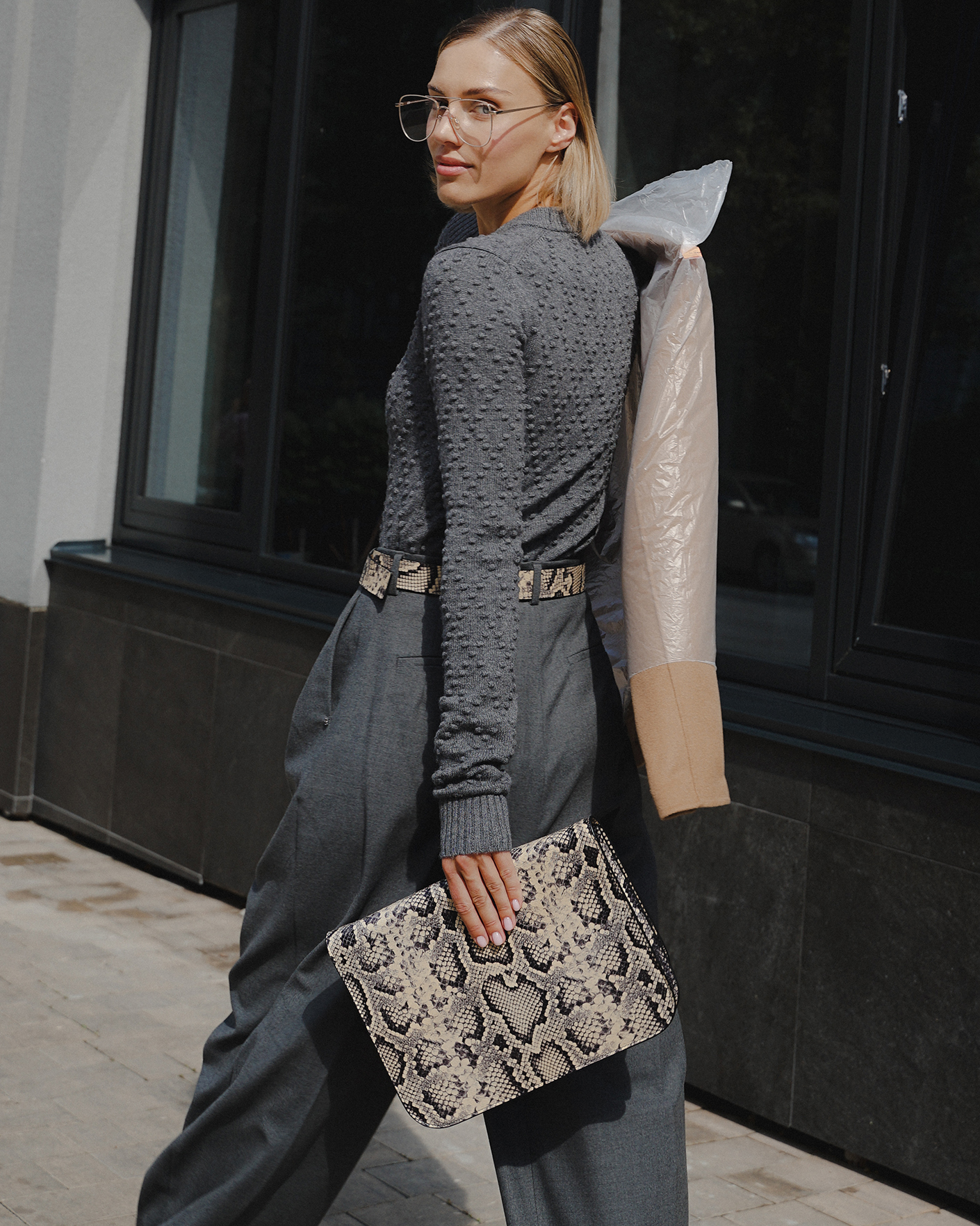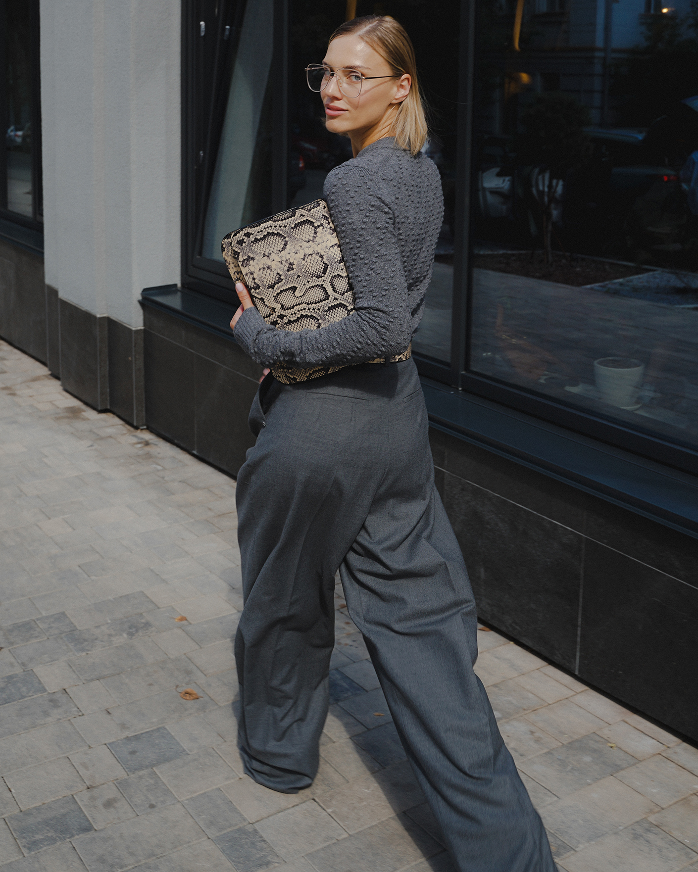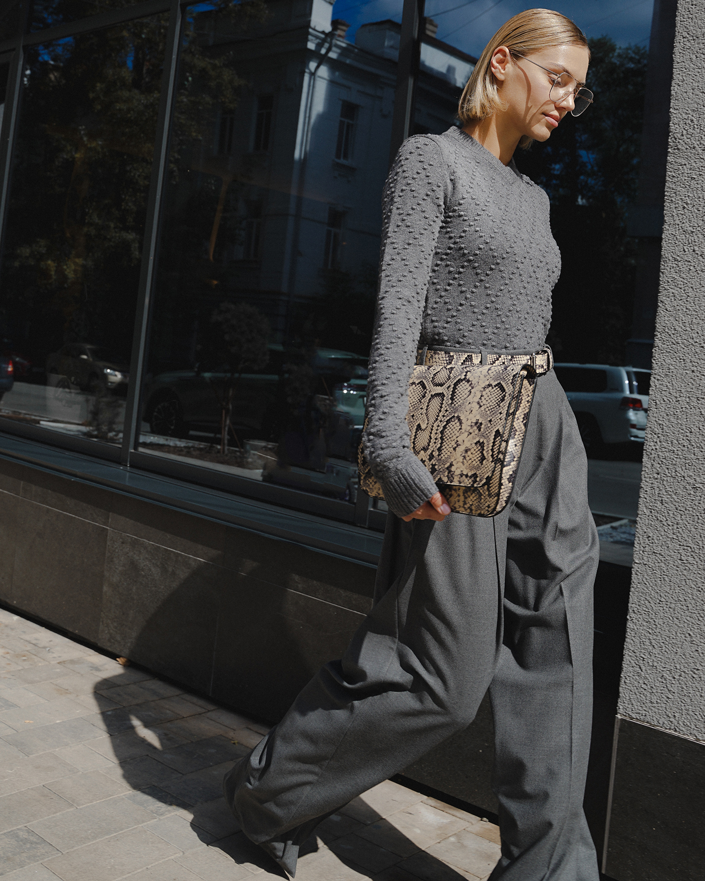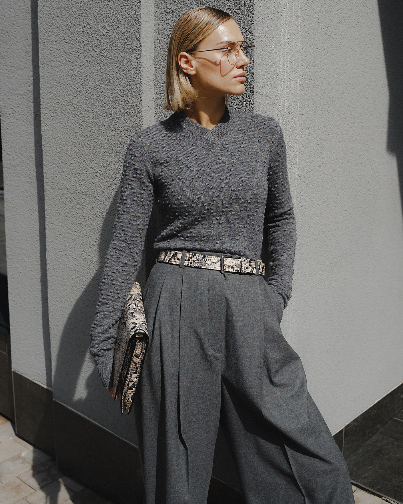 Стильный образ на каждый день и для работы в офисе состоит из приталенной джемпера с узким v-образным воротом и шерстяных брюк меланжевого оттенка на скрытой застежке.