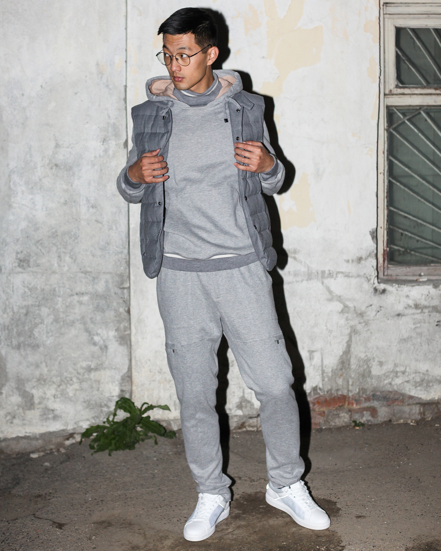 Образ Peserico в спортивном стиле для комфортных прогулок состоит из утепленного жилета серого цвета в горизонтальную стежку, из хлопкового худи в строчный рисунок, а также из серых джоггеров в строчный рисунок.