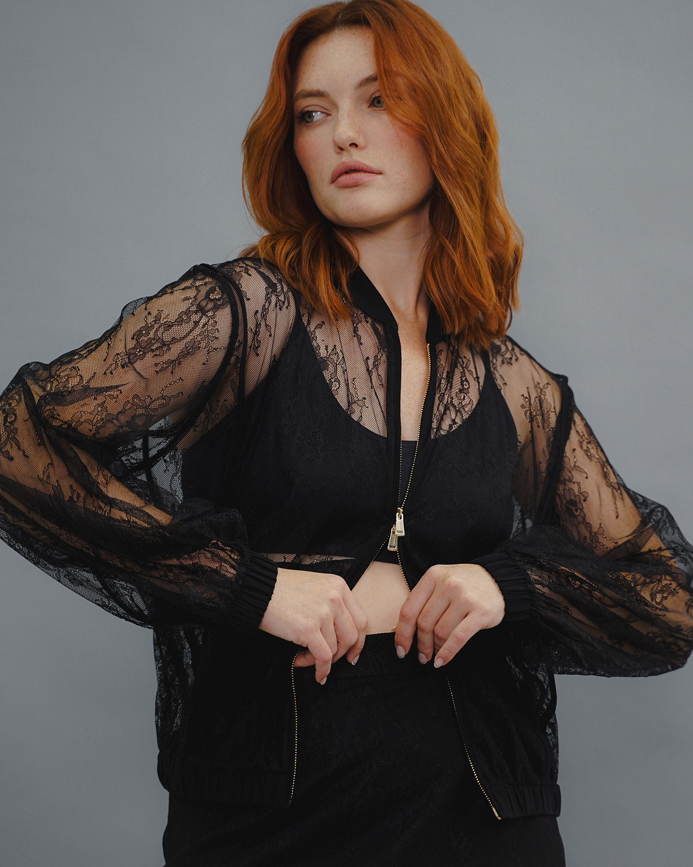 Образ total black от Marella состоит из жакета-бомбер в изящное кружеов с застежкой на молнию, также из кружевной юбки-карандаш с подкладом.